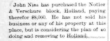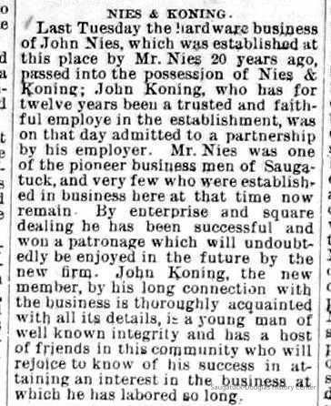 In 1894 Nies sold his share in the business to his former apprentice/then partner, John Koning, and moved to Holland where Nies and his sons opened the Nies hardware store.