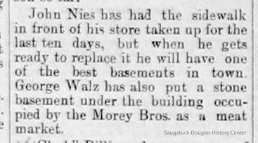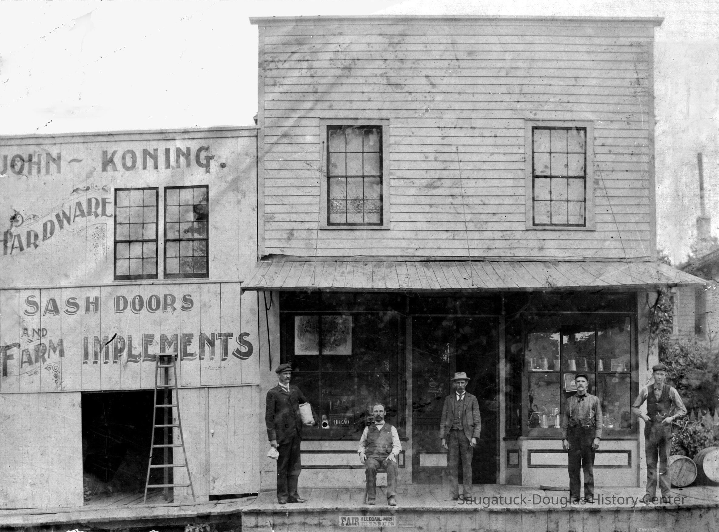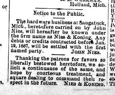 History: Following his discharge from the Union army in 1864, John (Jan) Nies opened a hardware store in Saugatuck (possibly 1868).