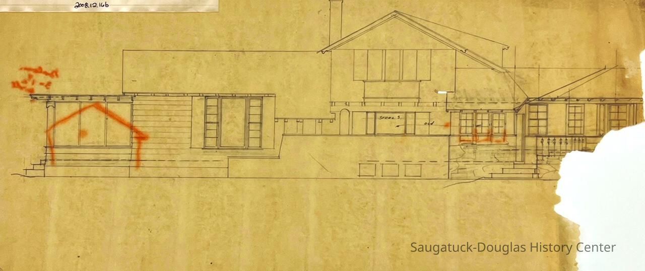 This architectural drawing consists of a half drawn view of the Conklin house. Some detail shown but no measurements or fine detail.Collection