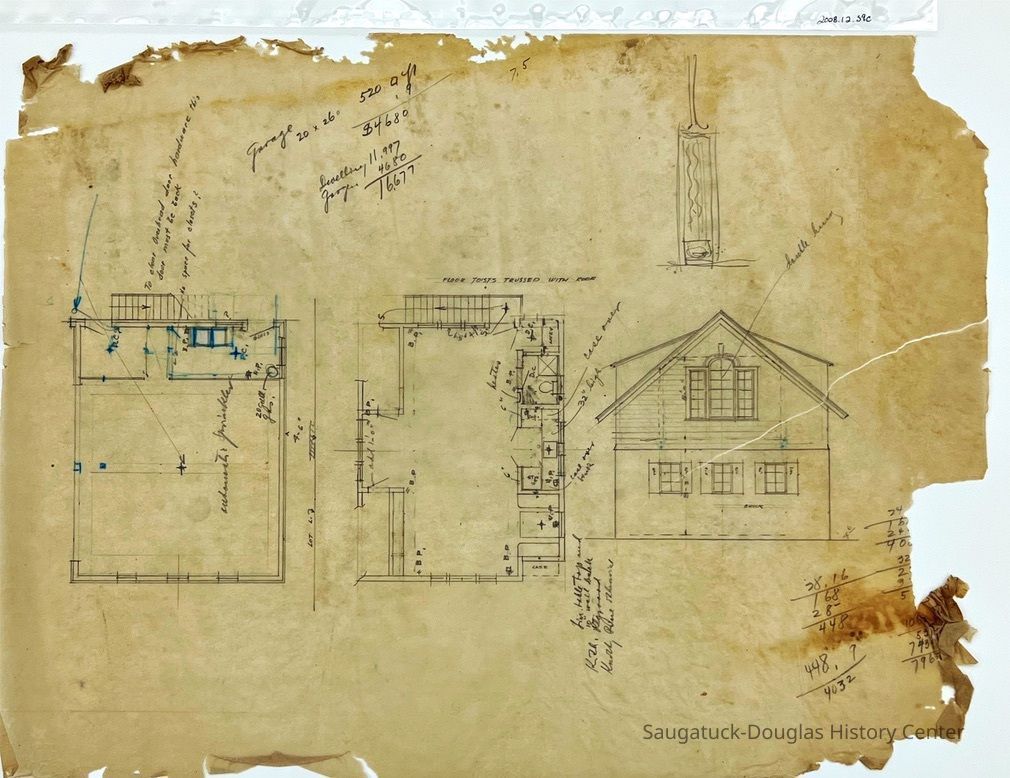 This architectural drawing features several low-detail drawings for a house. One consists of an exterior side view and the other two show a general idea of what the layout looks like. There are notes written all around the drawings that include numbers.Collection
