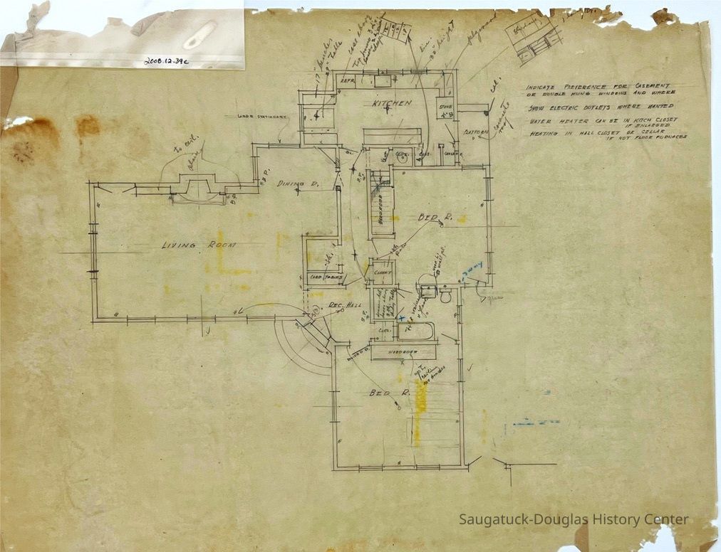 This architectural drawing features a semi-detailed floor outline for a house. It contains some names for rooms and a few electrical locations. Some notes along the edges in margins.Collection