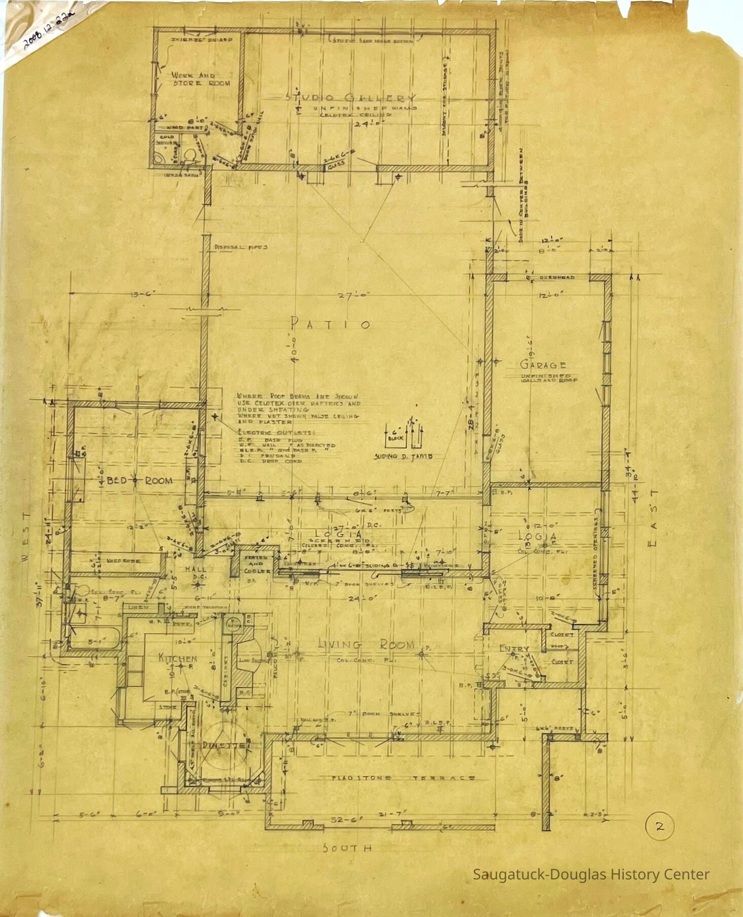 This architectural drawing features a detailed floor plan for a studio/residence. It gives the measurements for each room and some of the materials to be used. The bottom left corner of the patio section contains notes for beam details and electrical outlet symbols. The bottom right features a circle that contains '2.'Collection