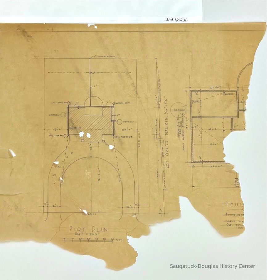 This architectural drawing features a rough plot plan with measurements and a torn edge on the right side. The edge matches with the torn edge of 2008.12.23a.Collection