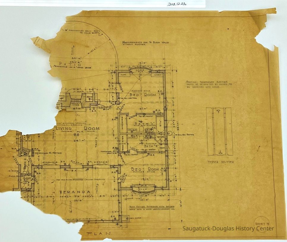This architectural drawing features detailed measurements of the shown piece. It appears to have a majority of the left half torn off. What shows is a part of the living room and veranda and a whol section labeled as a bedroom. The right edge contains a detail of the shutter.Collection