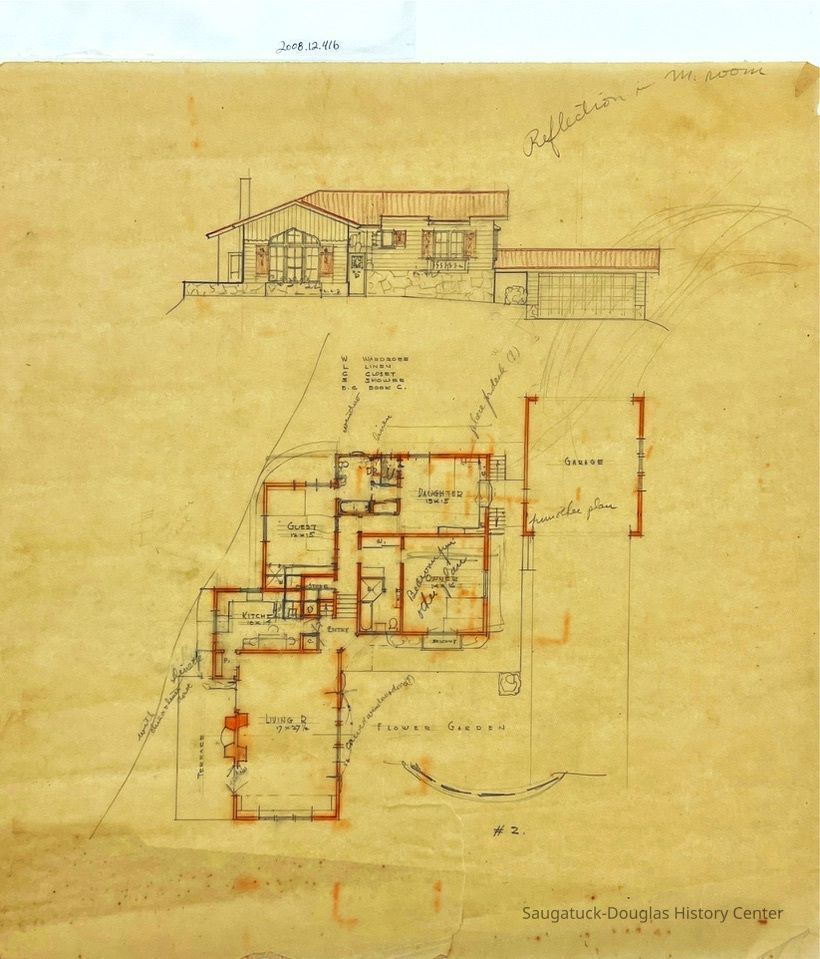 This architectural drawing depicts the front exterior of a house. The lower portion shows the floor plan with various details. The main walls are colored orange. Very similar to 2008.12.41a.Collection
