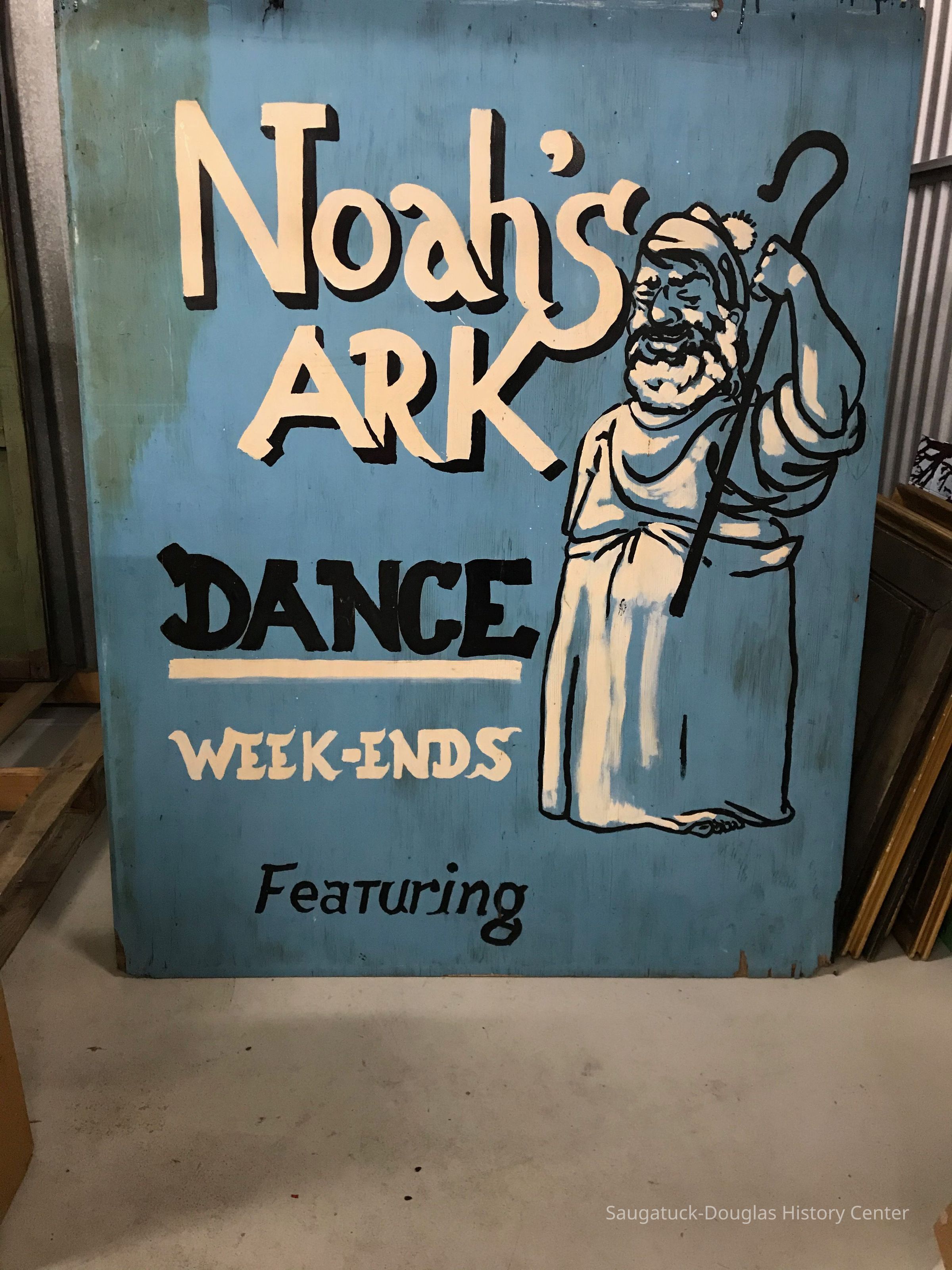 Wood sign on plywood with the words "Noah's Ark" located on Water Street in Saugatuck. Bar/Club for teens in the 1960s. Hand painted sign with signature in lower right "Bill Schwartz" with additional illegible marks. Teal-blue background with yellow and black text and images.Collection