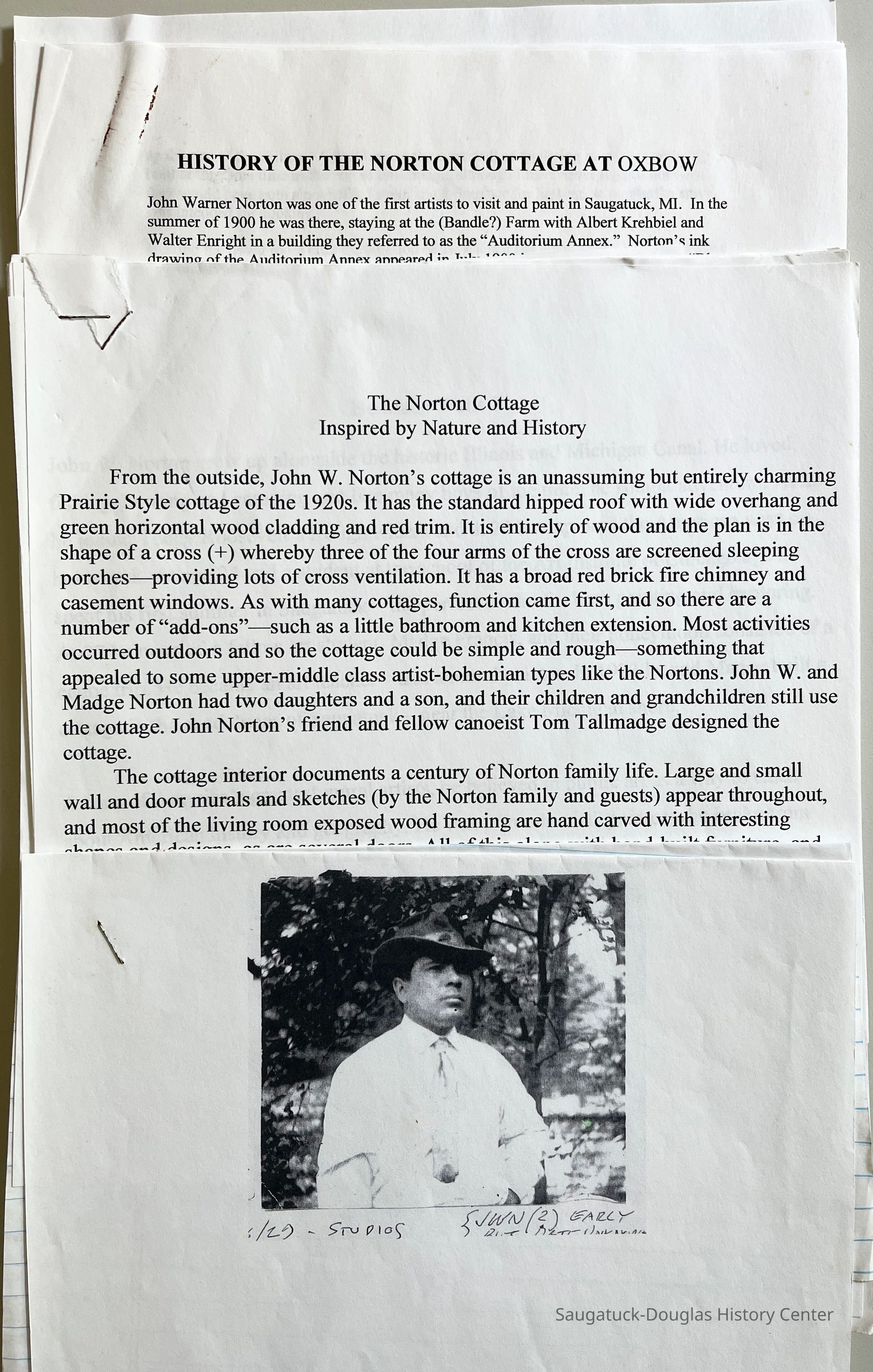 Research about the Norton Cottage collected by James Schmiechen with the assistance of Kay Smalley, a descendant of the cottage's builder John W. Norton, a Chicago muralist. Text includes detailed descriptions of the building, its furniture and murals, and recollections about family life there. Also some biographical information about John W. Norton.Collection