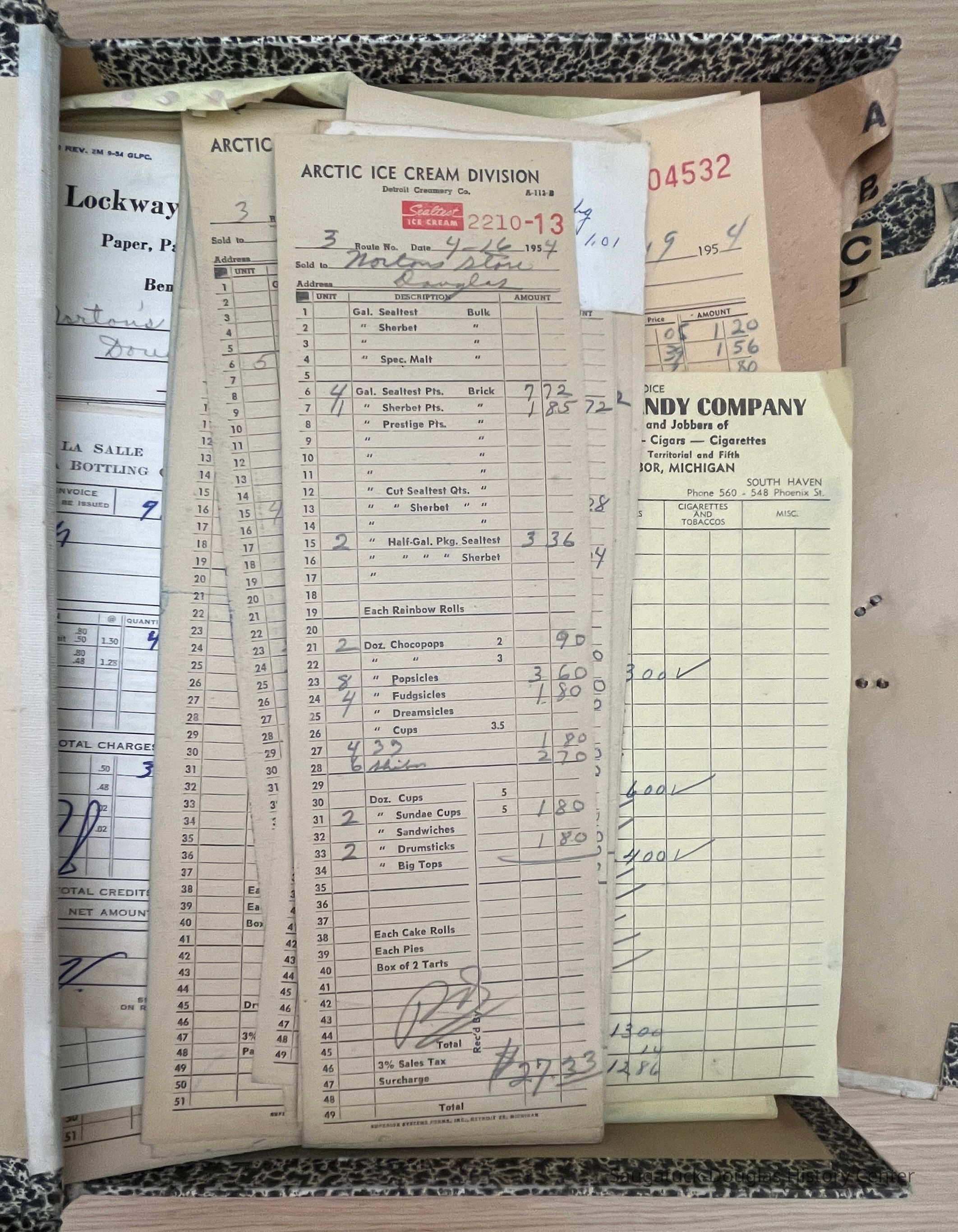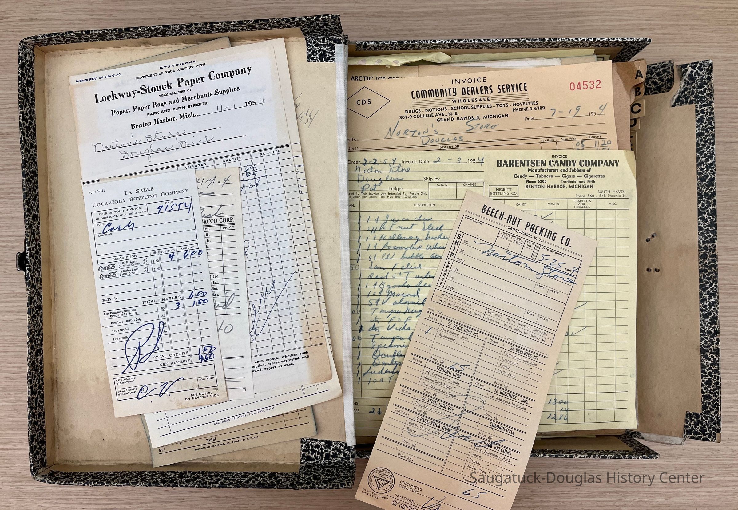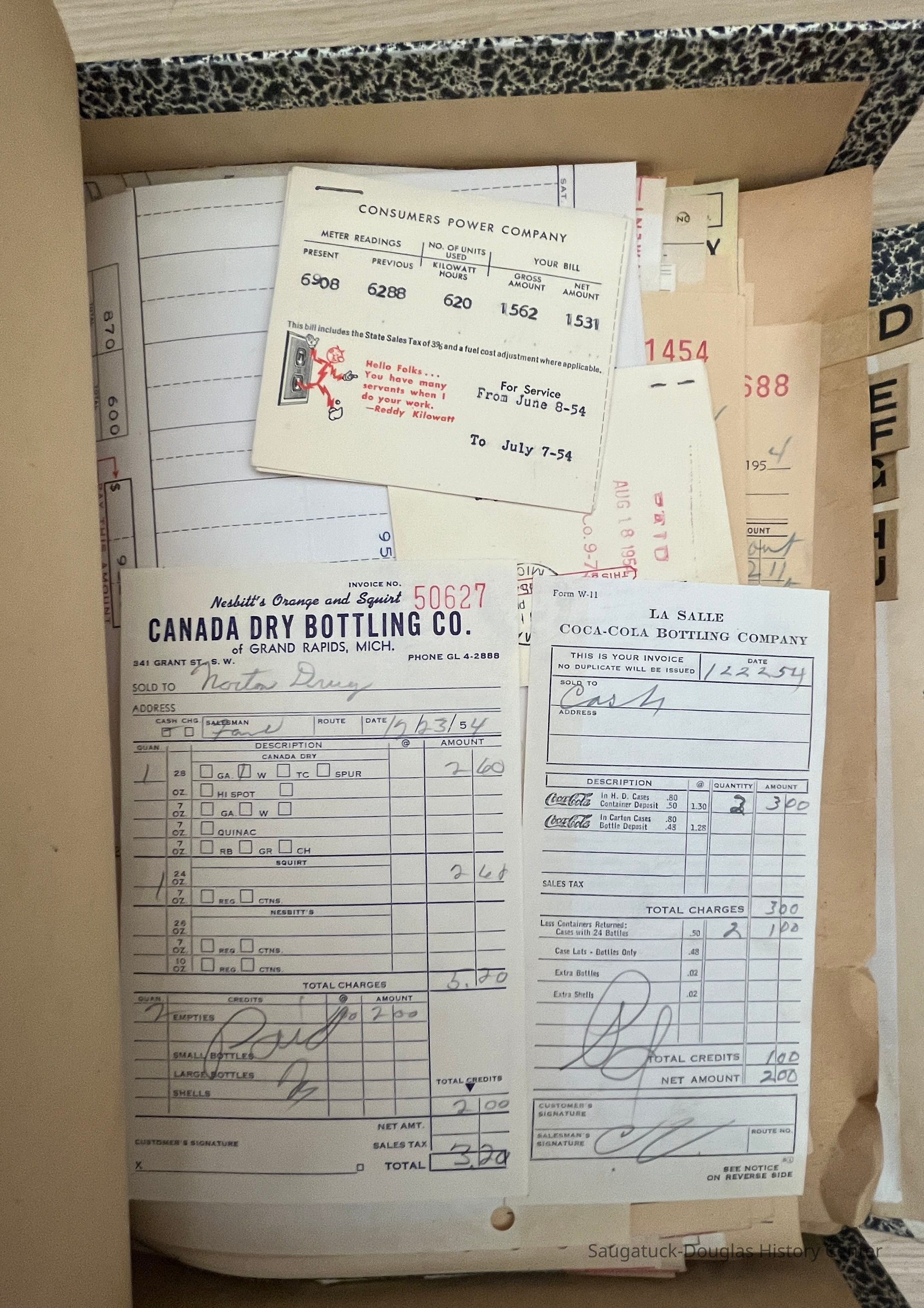 Two "Letters" document filing boxes crammed with receipts from wholesale purchases made to stock the Norton Store in Douglas in the 1950s. The photos attached to this entry give a small sampling of the contents of this collection.Context