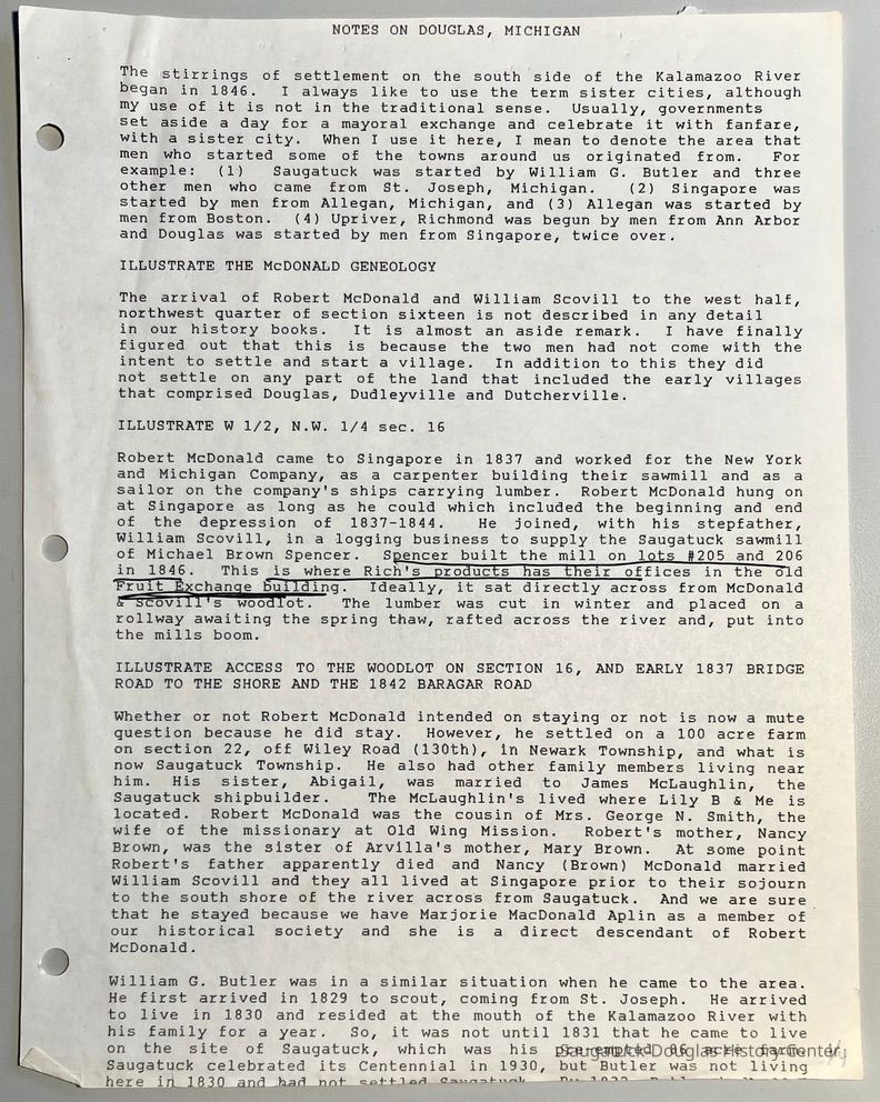 Robert McDonald came to Singapore in 1837 and worked for the New York and Michigan Company, as a carpenter building their sawmill and as a sailor on the company’s ships carrying lumber. Robert McDonald hung on at Singapore as long as he could which included the beginning and end of the depression of 1837-1844. He joined, with his stepfather, William Scovill, in a logging business to supply the Saugatuck sawmill of Michael Brown Spencer. Spencer built the mill on lots #205 and 206 in 1846. This is where Rich’s products had their offices in the old Fruit exchange building. Ideally, it sat directly across from McDonald & Scovill’s woodlot. The lumber was cut in winter and placed on a rollway awaiting the spring thaw, rafted across the river and, put into the mills boom.