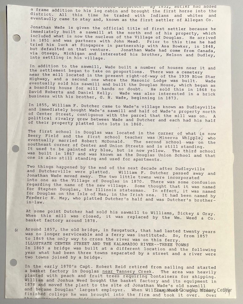 Jonathan Wade is given the official title of first settler because he immediately built a sawmill at the north end of his property, which included what is now the nucleus of the Village of Douglas. He arrived in 1851 and was partners with John Mead. Prior to this time he had tried his luck at Singapore in partnership with Asa Bowker, in 1848, but defaulted on that venture. Jonathan Wade had come from Canada, via Otsego, Michigan and interested his brother, Nelson and Dudley, into settling in his village.