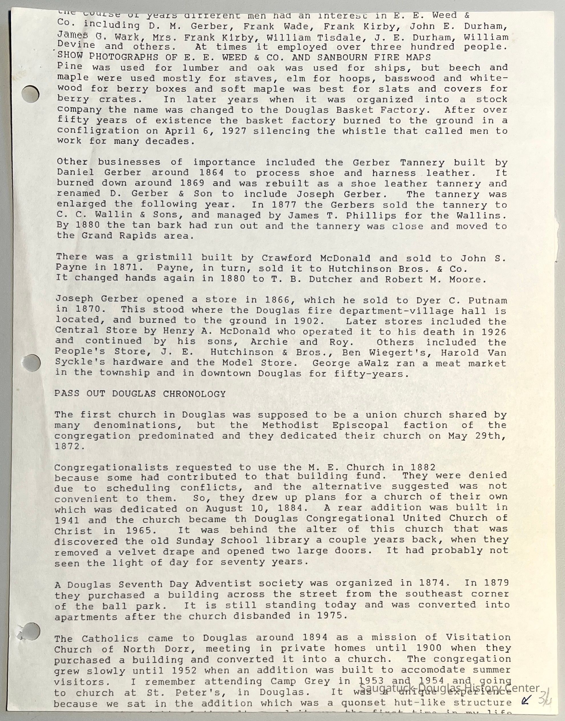 In the early 1870s Capt. Robert Reid retired from sailing and started a basket factory in Douglas near Tannery Creek. The area was heavily planted with peach and fruit trees requiring containers for shipping. William and Joshua Weed bought the basket factory and its equipment in 1878 and moved the plant to the site of Jonathan Wade’s old sawmill and became Douglas’ largest employer. When William Weed’s son, Elmer, finished college he was brought into the firm and took it over. Over the course of years different men had an interest in E.E. Weed & Co. including D. M. Gerber, Frank Wade, Frank Kirby, John E. Durham, James G. Wark, Mrs, Frank Kirby, William Tisdale, J. E. Durham, William Devine and others. At times it employed over three hundred people. SHOW PHOTOGRAPHS OF E. E. WEED & CO. AND SANBOURN FIRE MAPS