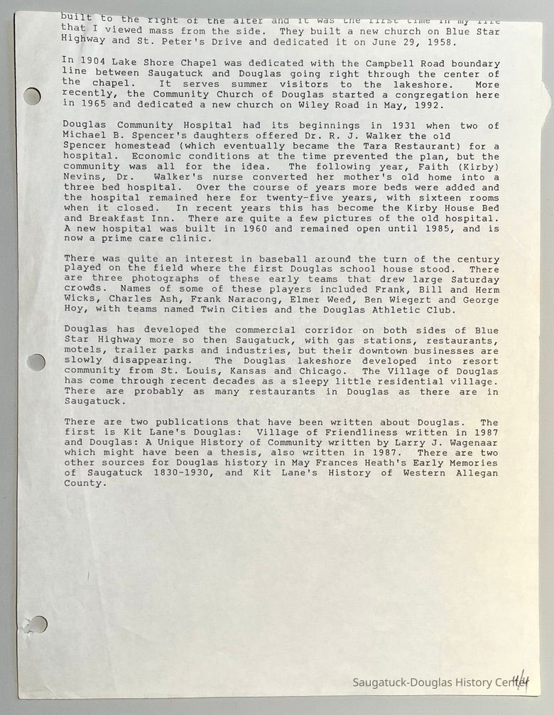 There are two publications that have been written about Douglas. The first is Kit Lane’s Douglas: Village of Friendliness written in 1987 and Douglas: A Unique History of Community written by Larry J. Wagenaar which might have been a thesis, also written in 1987. There are two other sources for Douglas history in May Frances Heath’s Early Memories of Saugatuck 1830-1930, and Kit Lane’s History of Western Allegan County.