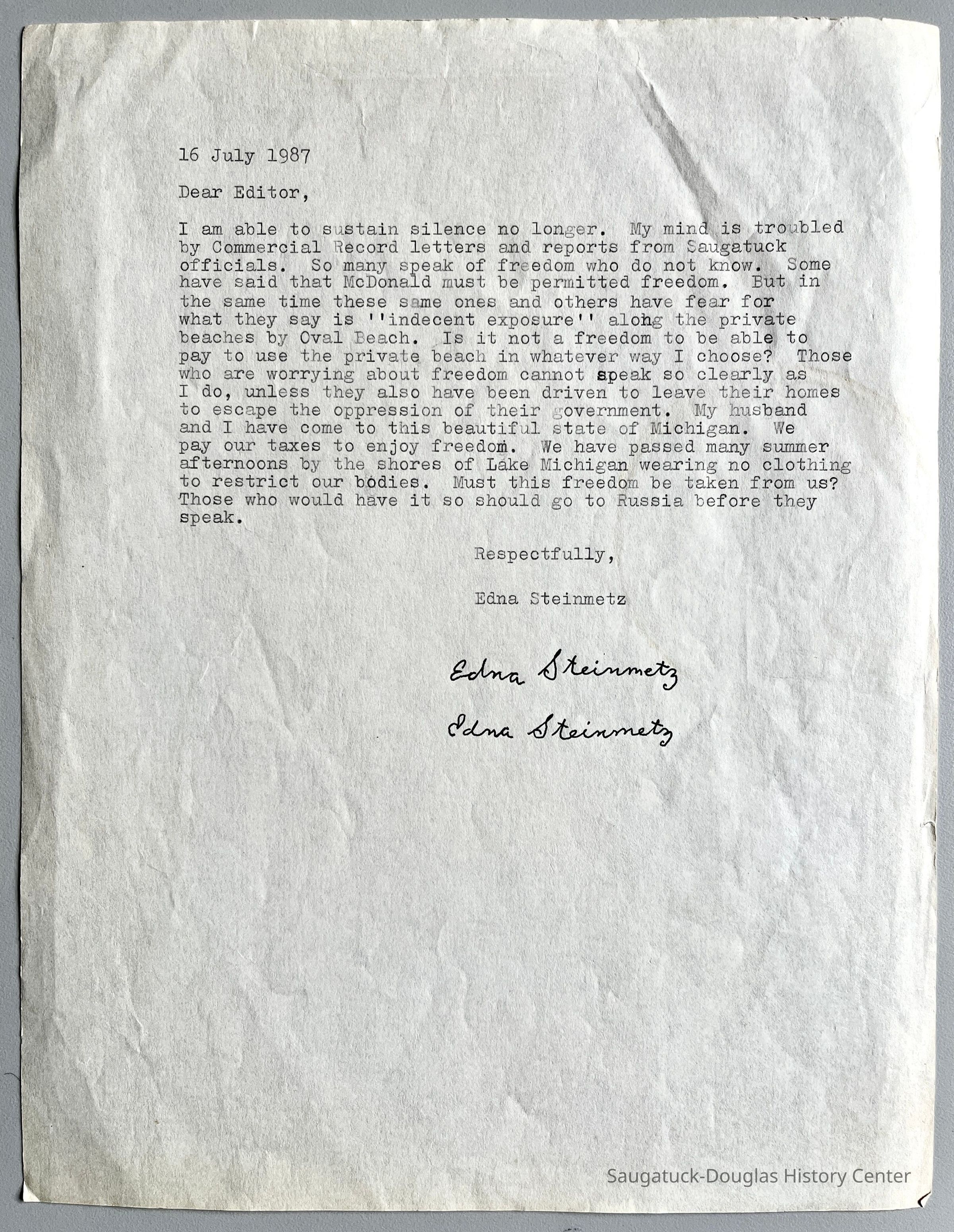 One page typed letter signed twice by Edna Steinmetz and dated 16 July 1987. In the letter, Ms. Steinmetz points out the hypocrisy of townspeople supporting freedom for McDonalds to open a hamburger franchise in downtown Saugatuck but decrying people sunbathing naked on the beaches (likely referring to the nude beach north of Oval Beach.) Conclusion refers to (the absence of) freedom in Russia.Subject Person/Organization