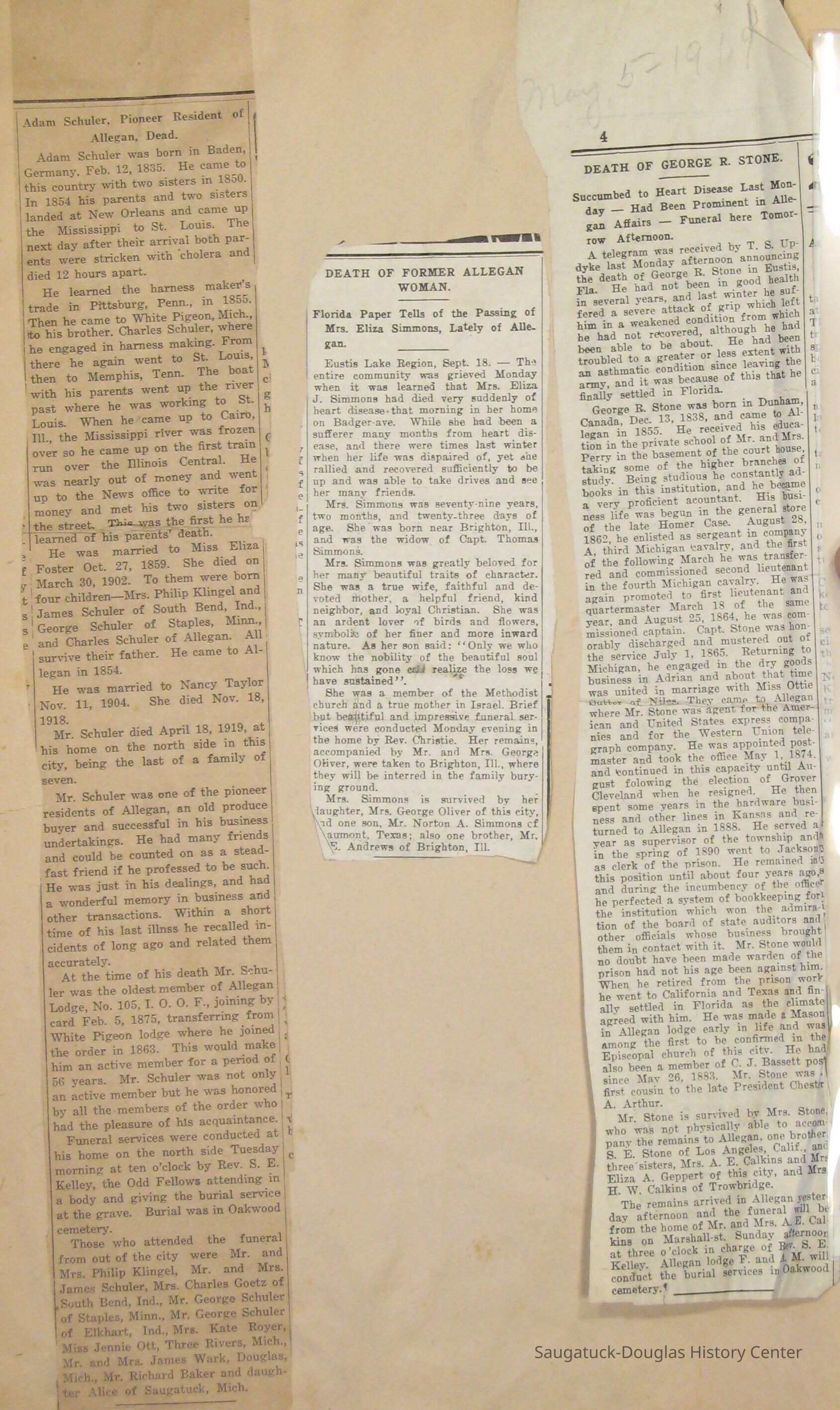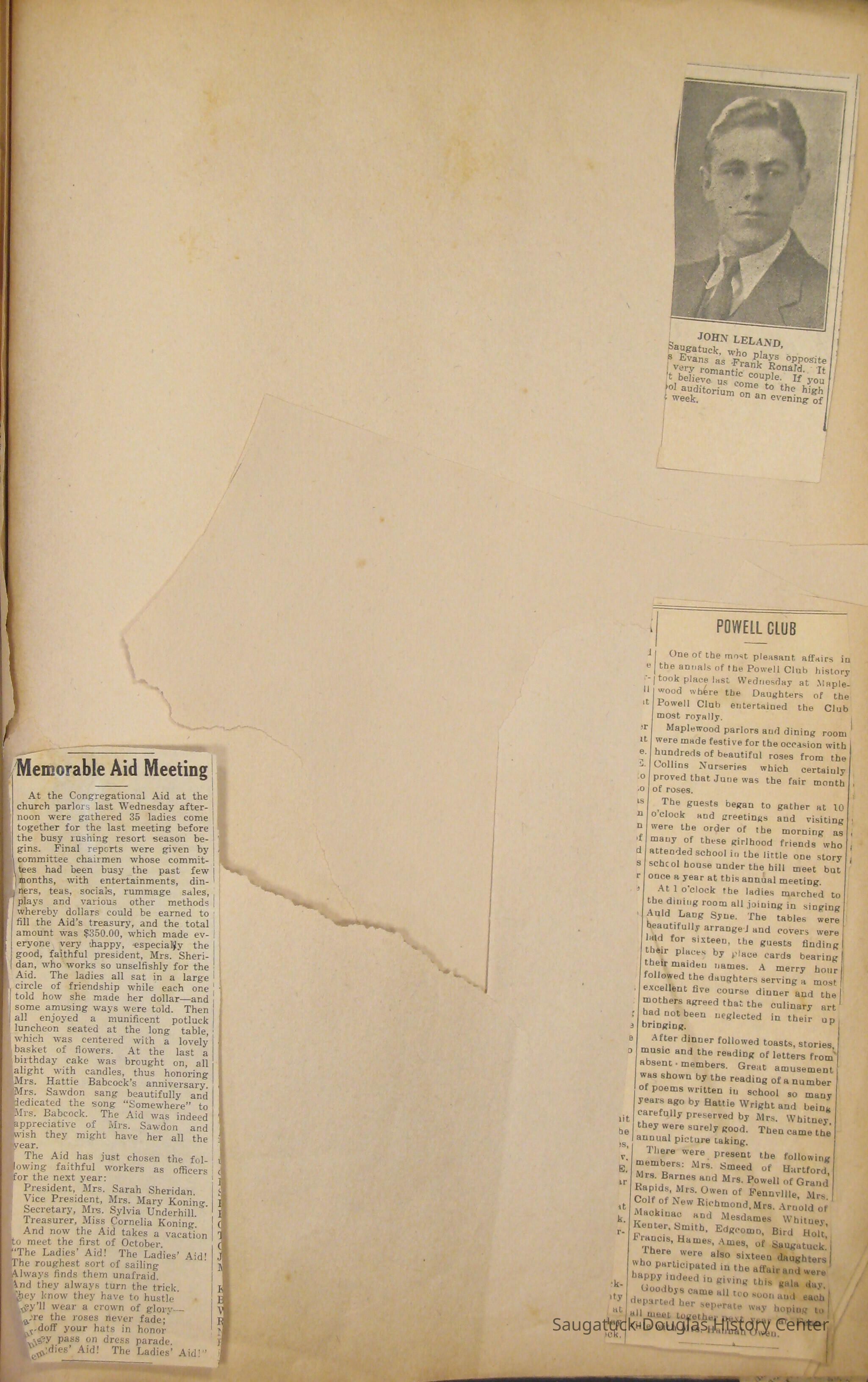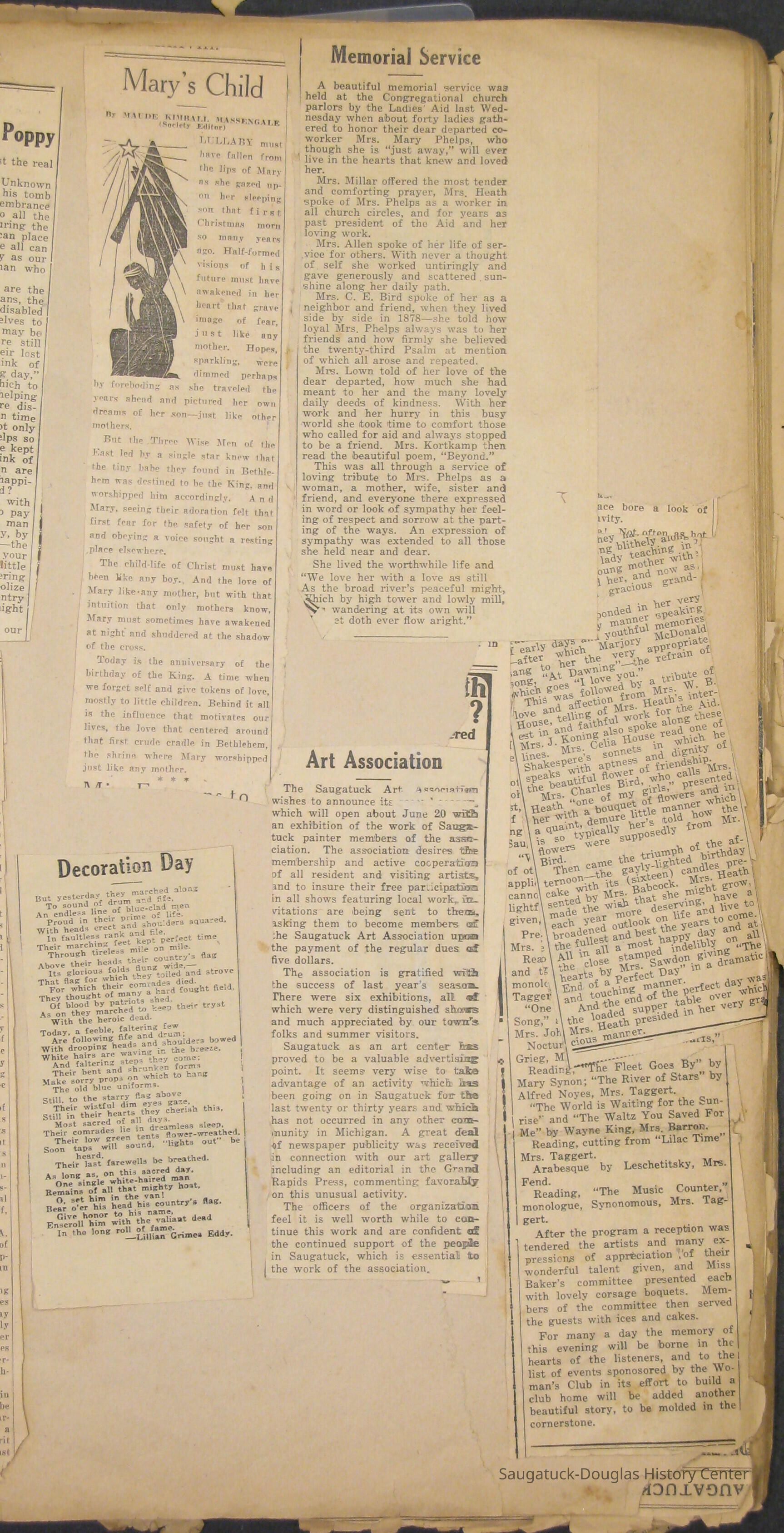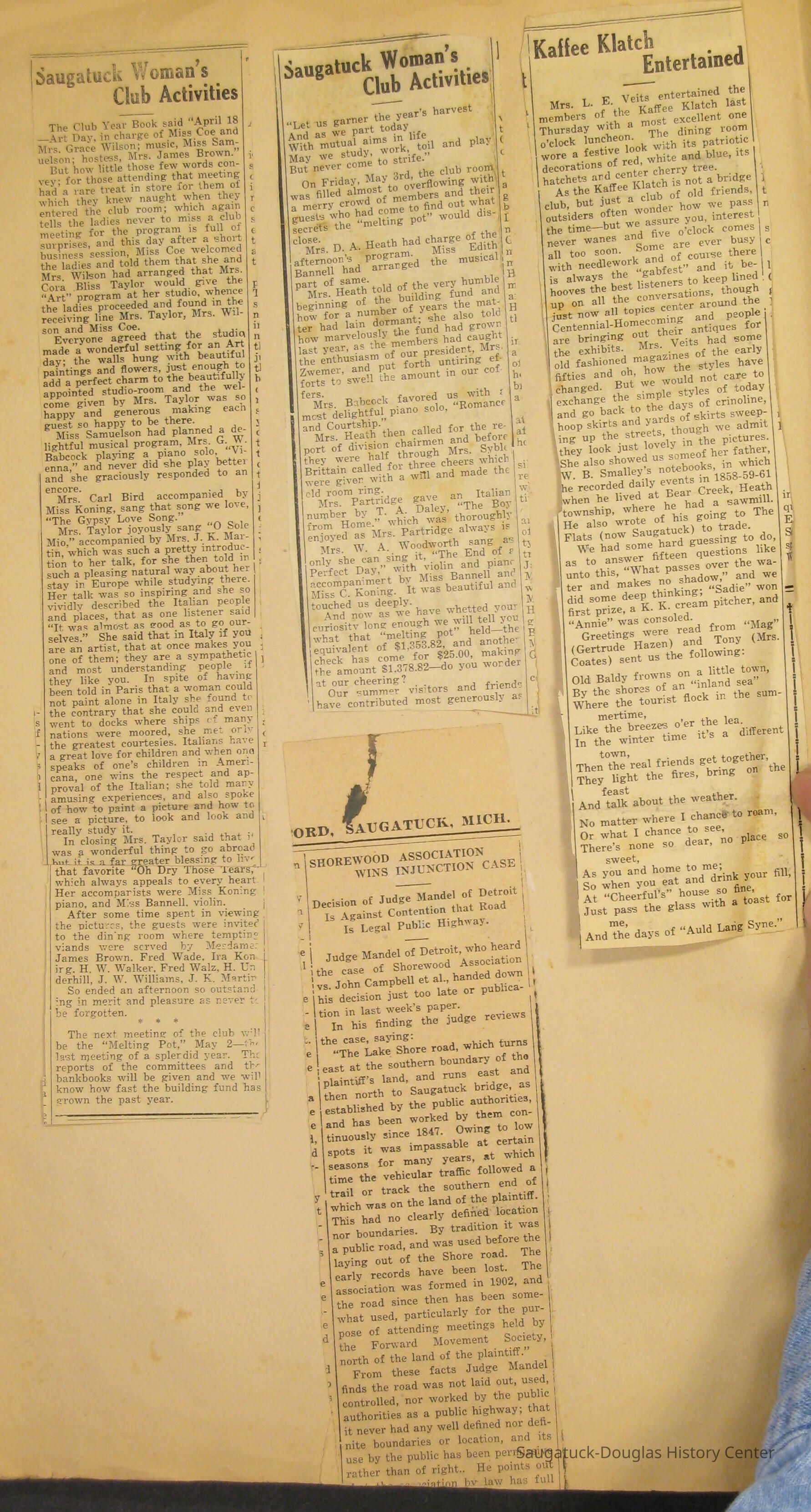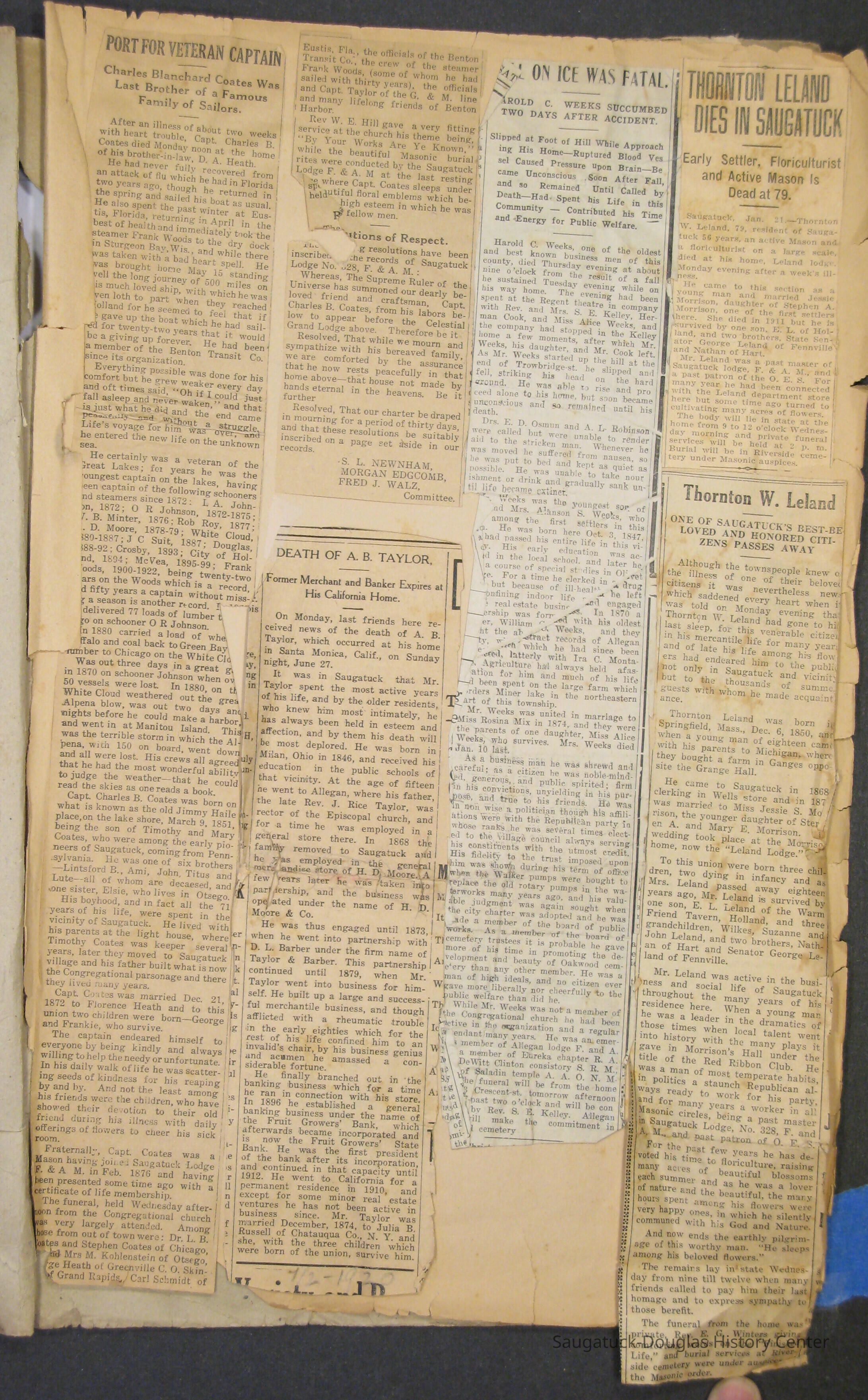 May Heath’s scrap book containing newspaper obituaries or articles about Saugatuck, Douglas and Allegan residents including