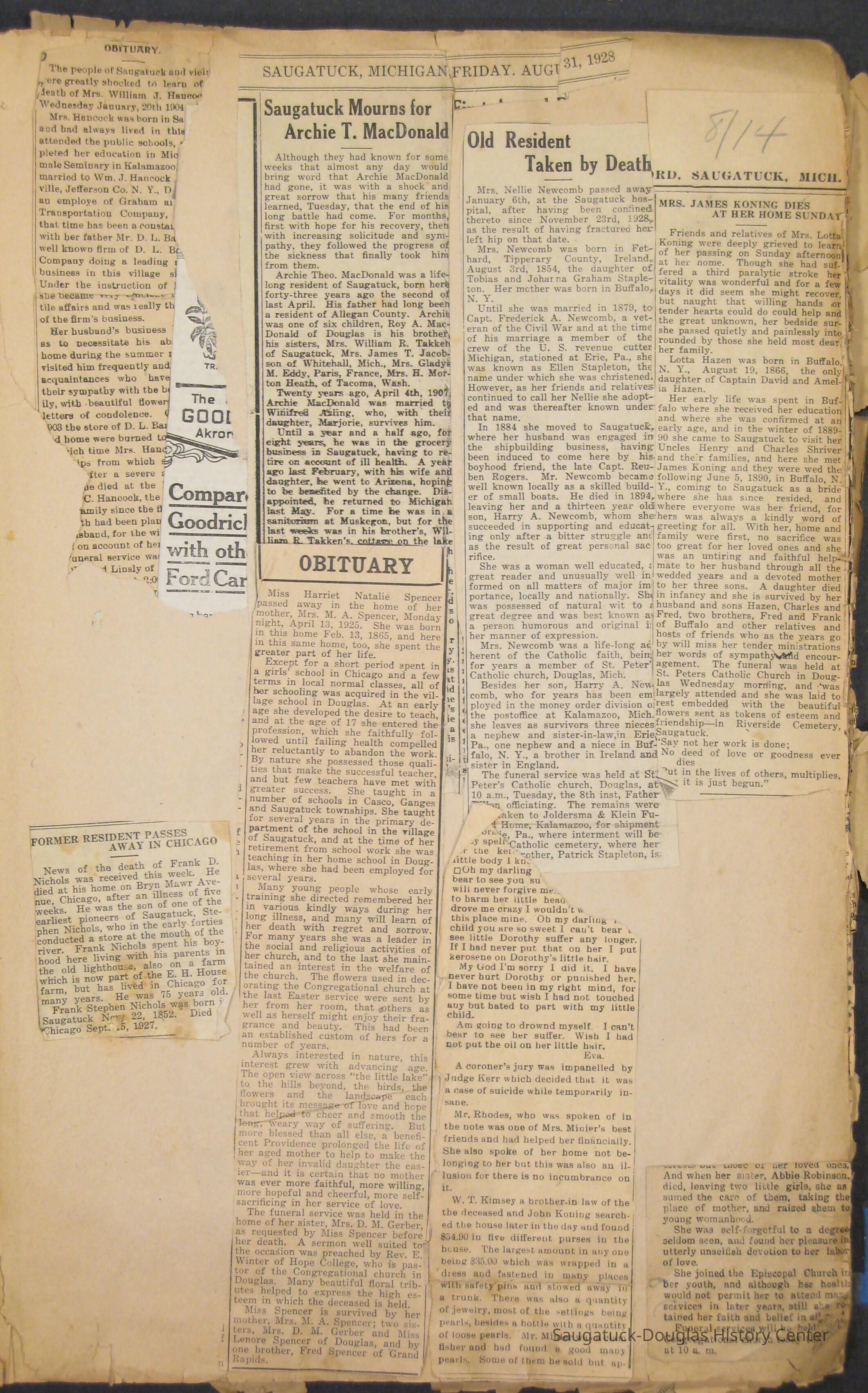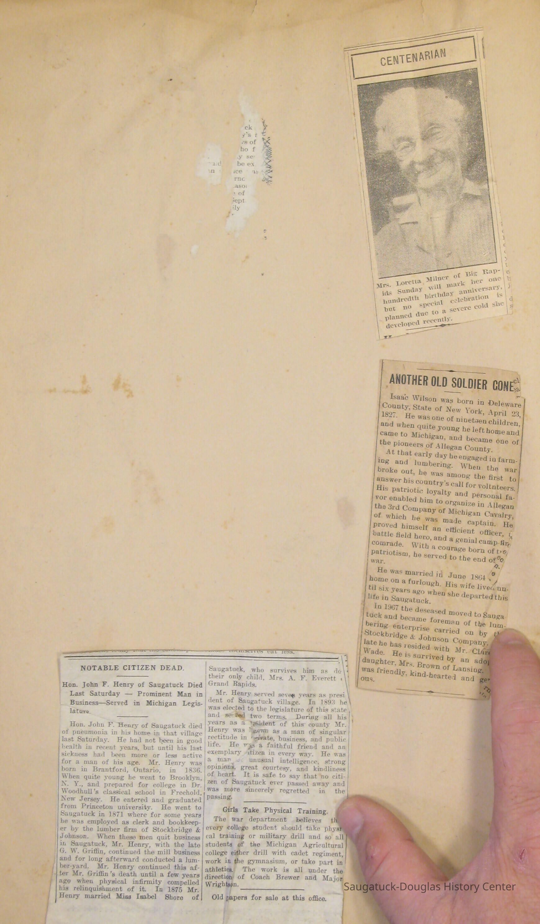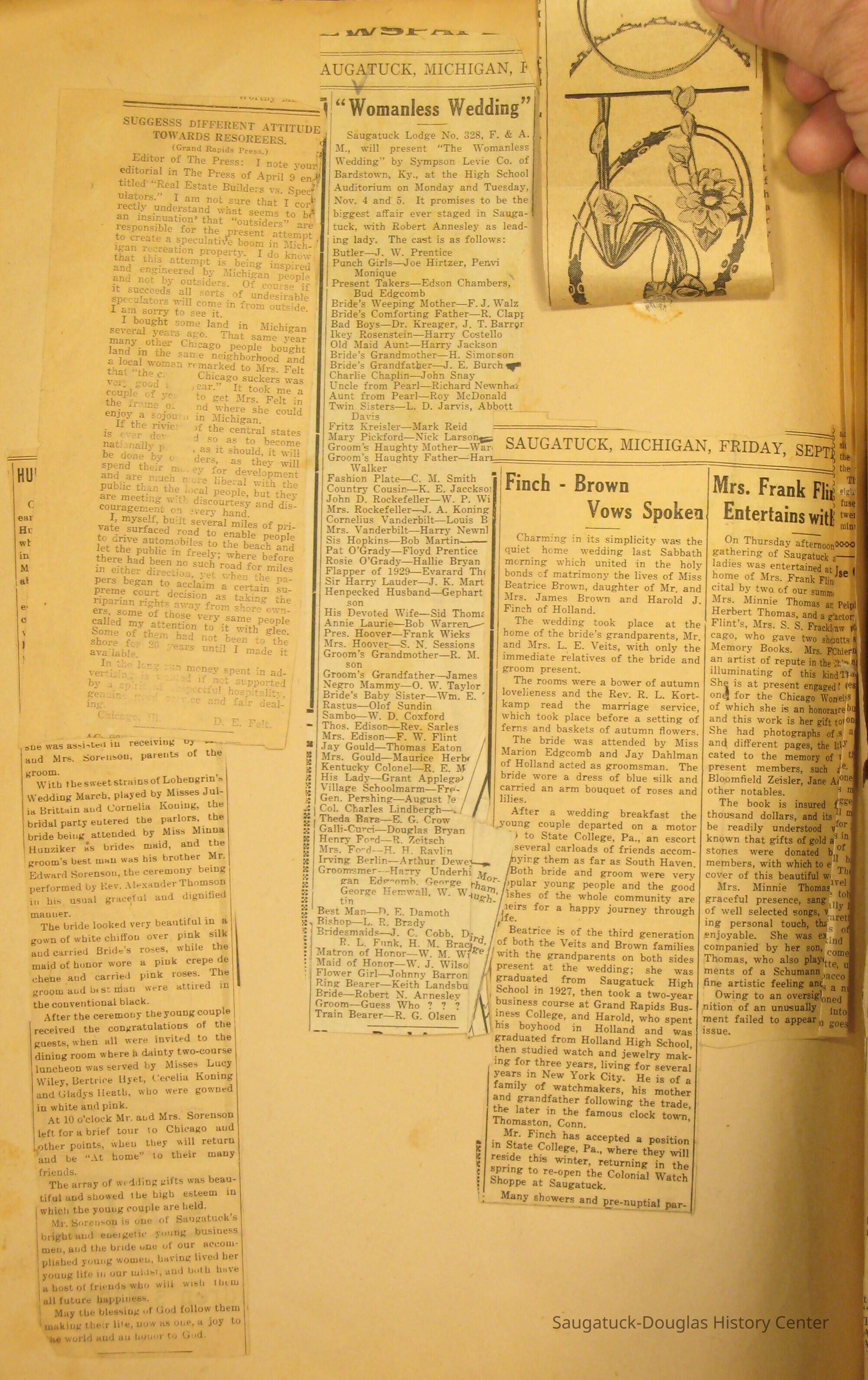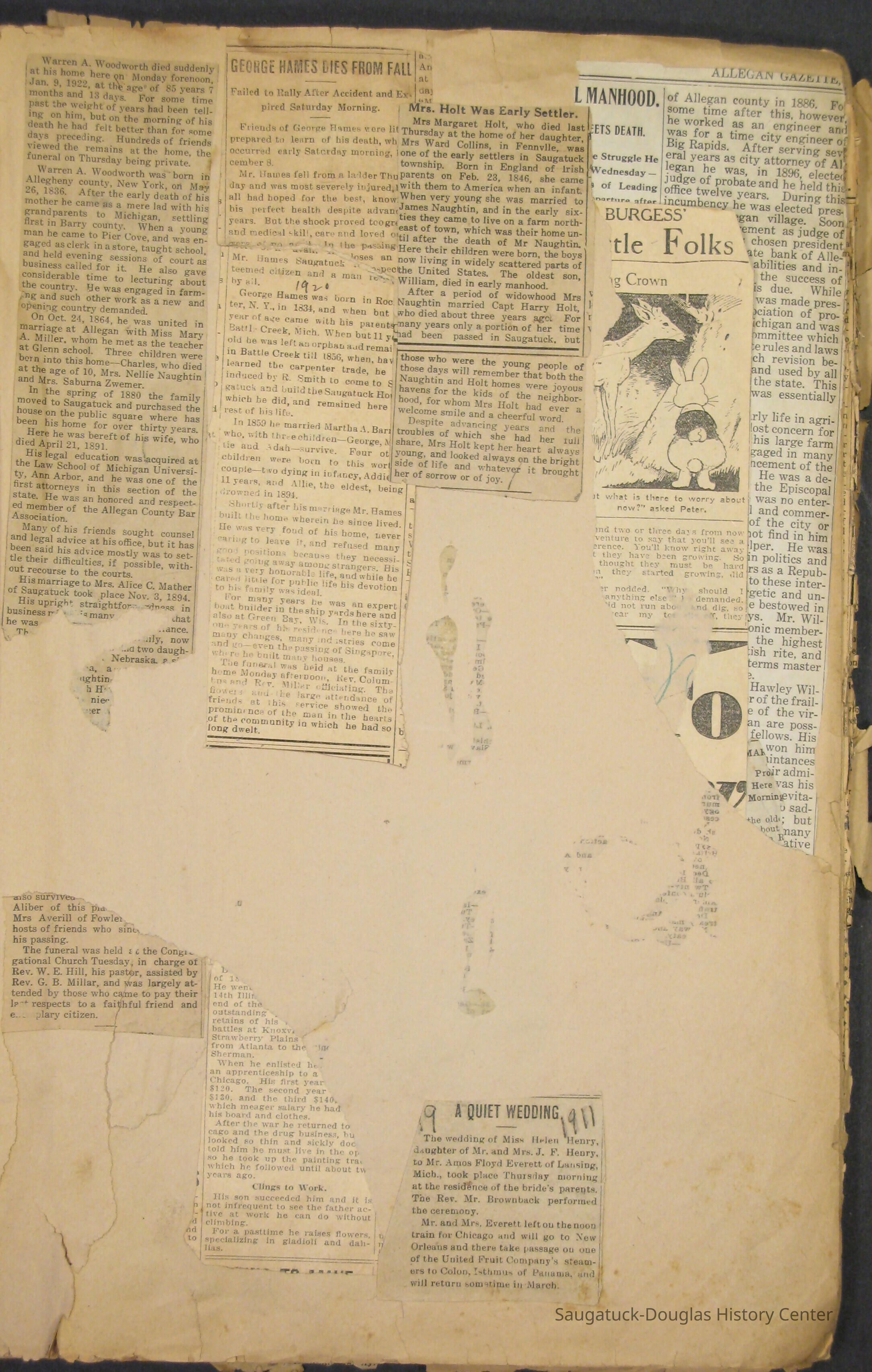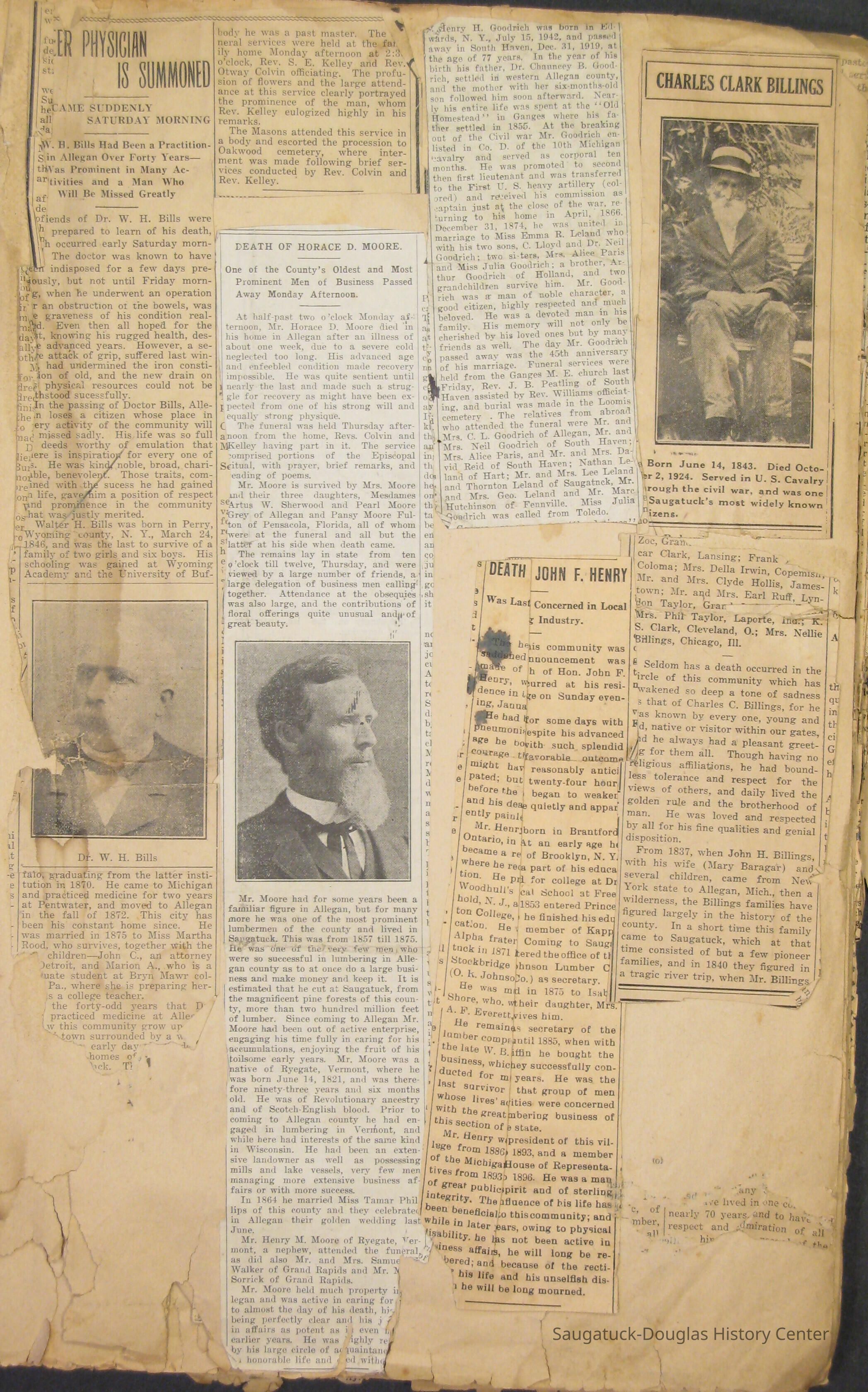 May Heath’s scrap book containing newspaper obituaries or articles about Saugatuck, Douglas and Allegan residents including