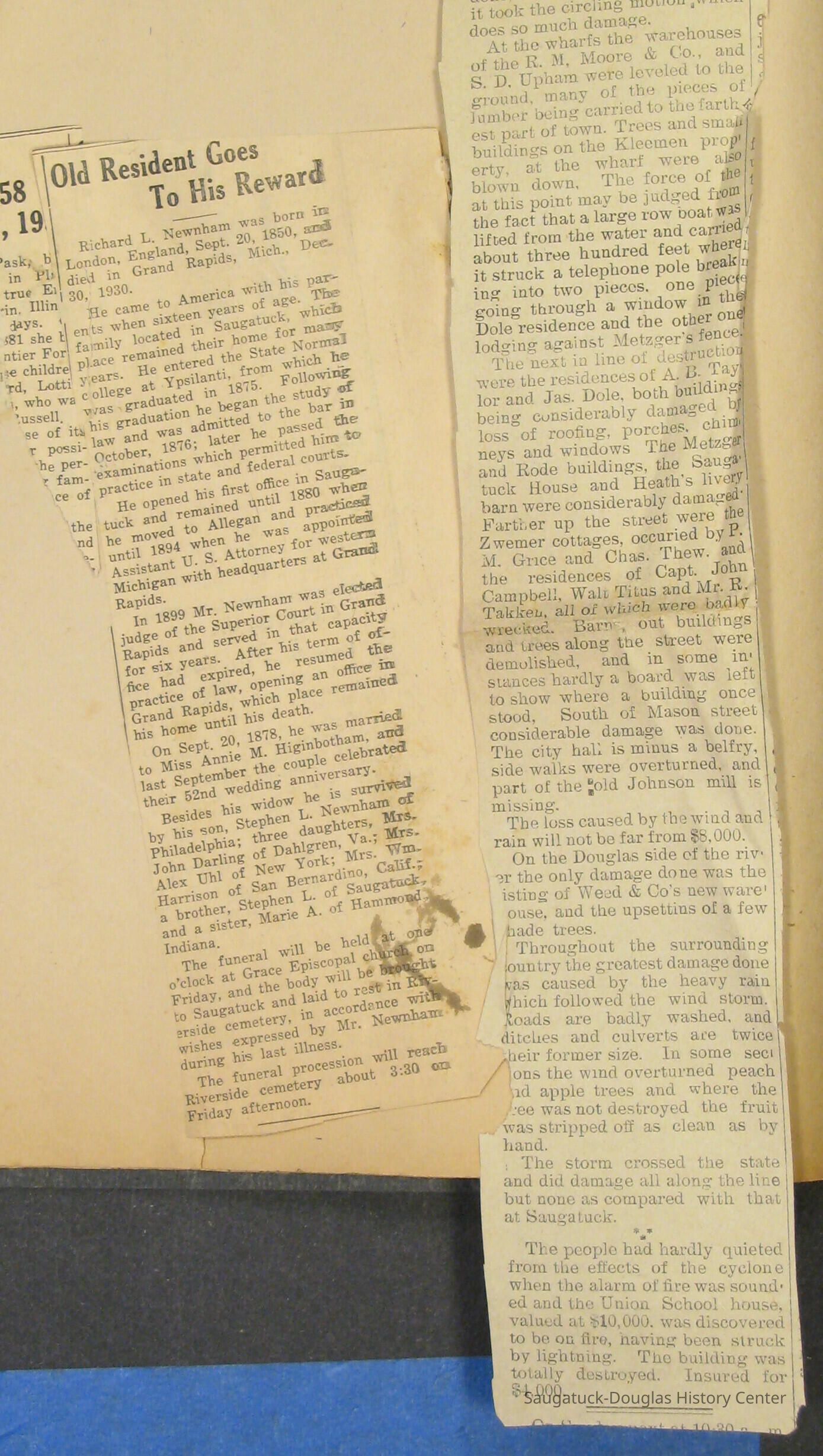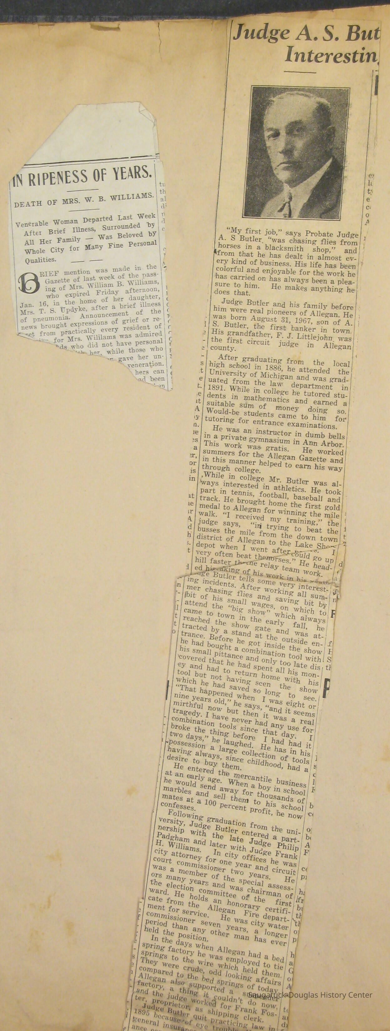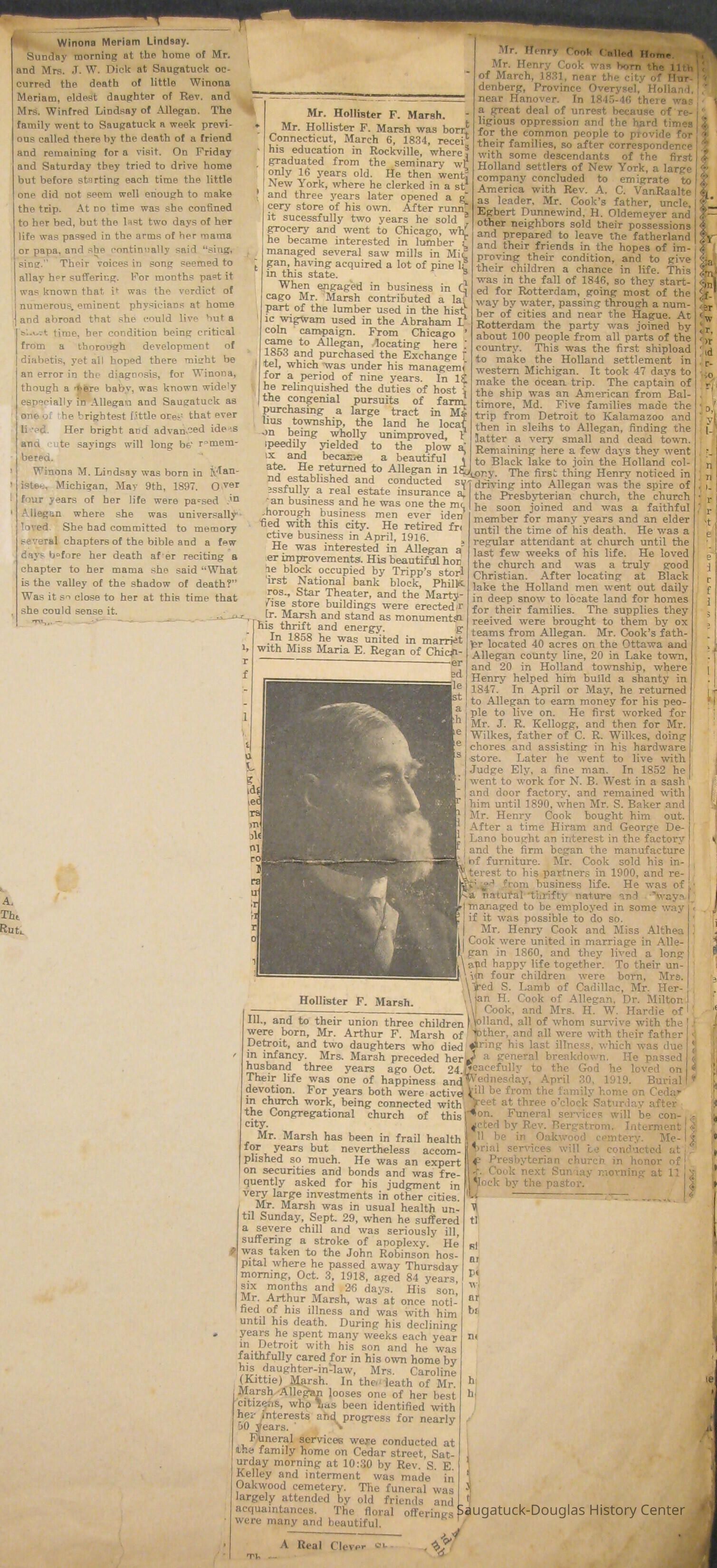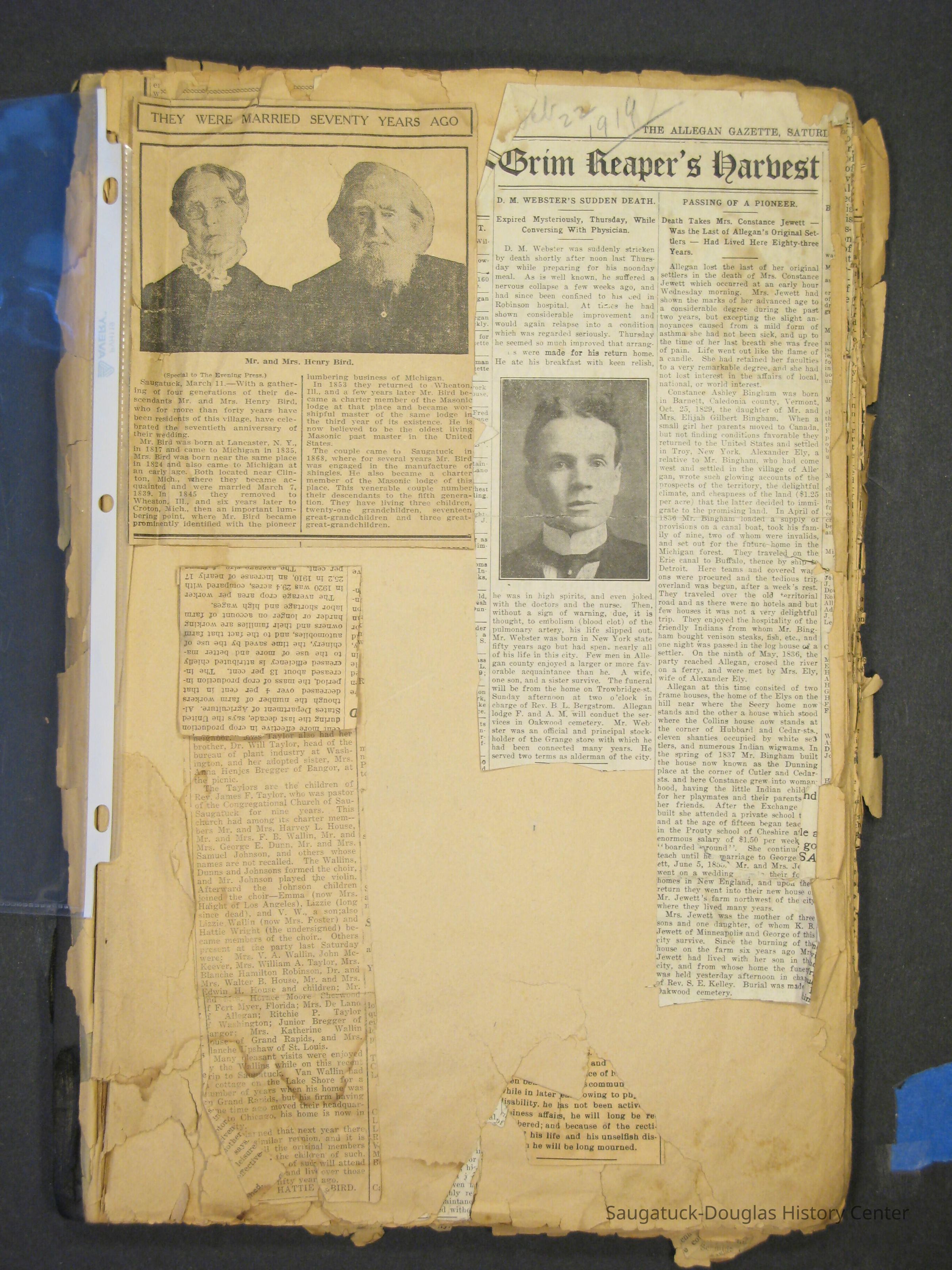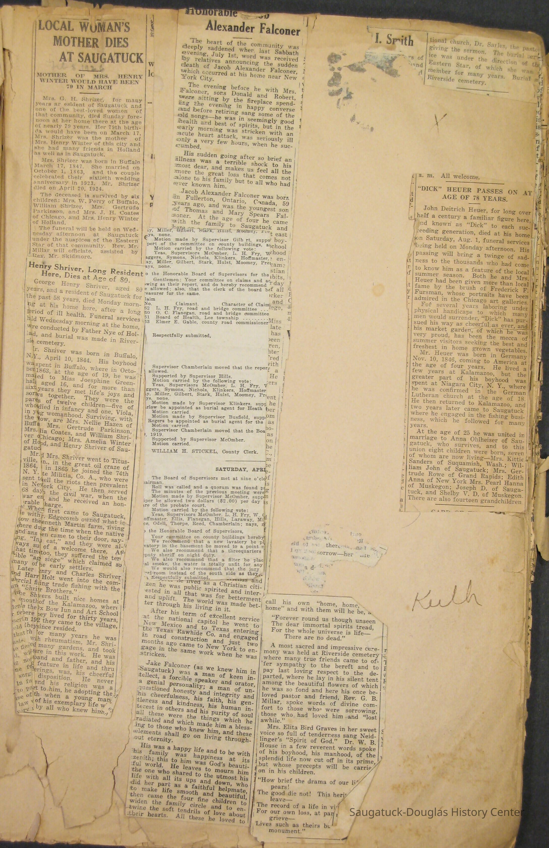 May Heath’s scrap book containing newspaper obituaries or articles about Saugatuck, Douglas and Allegan residents including