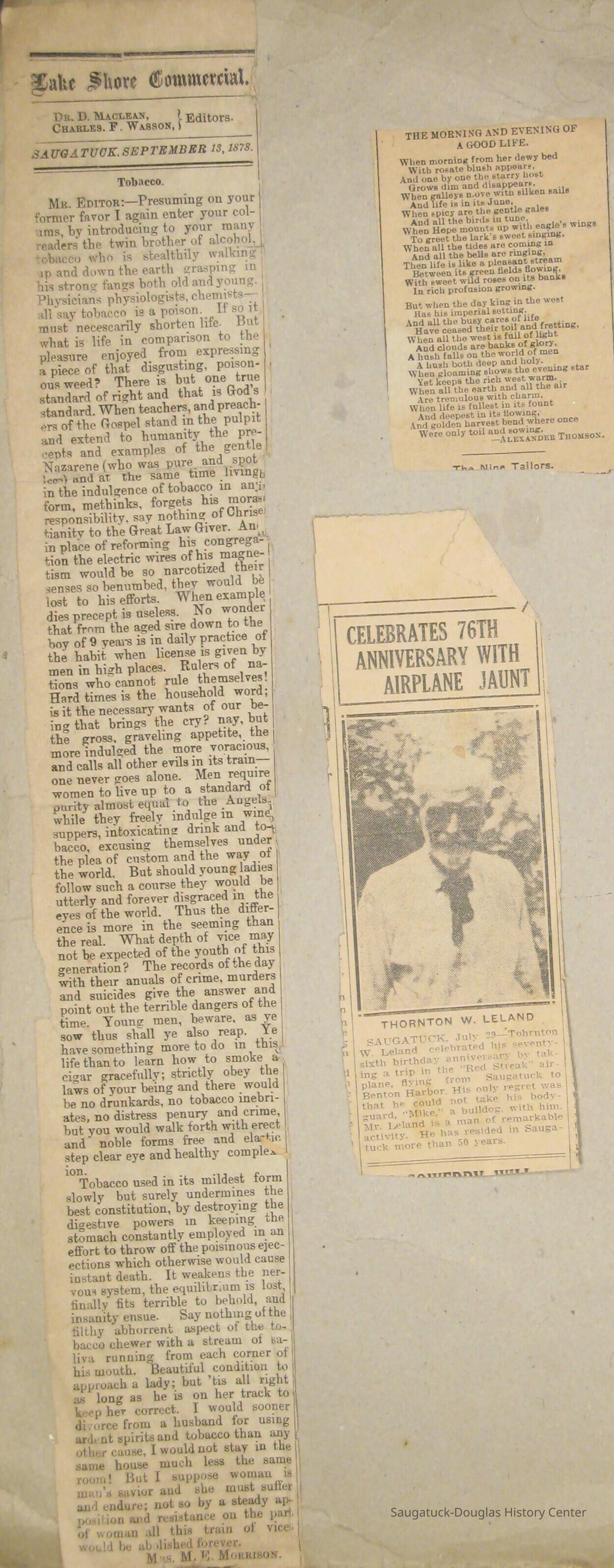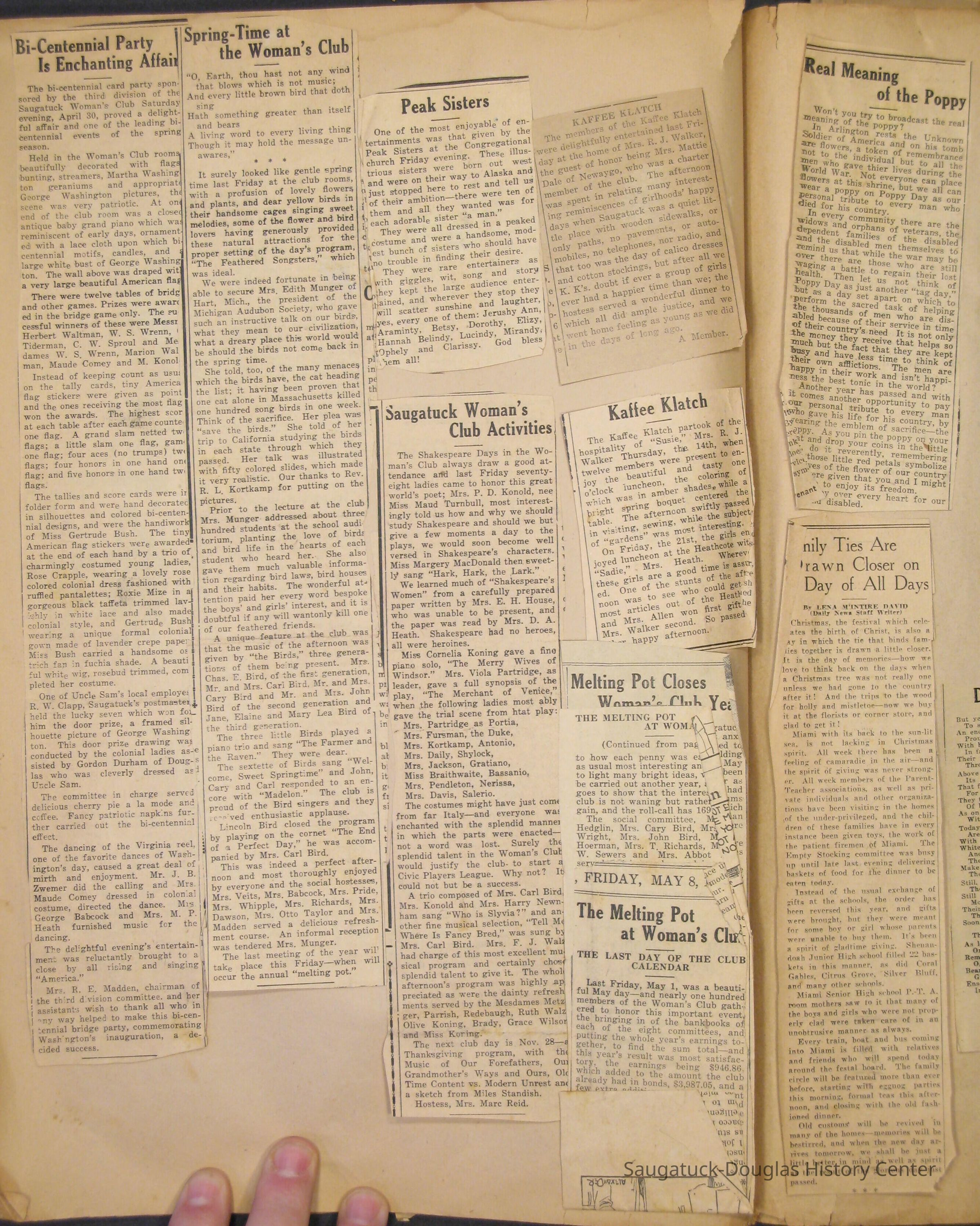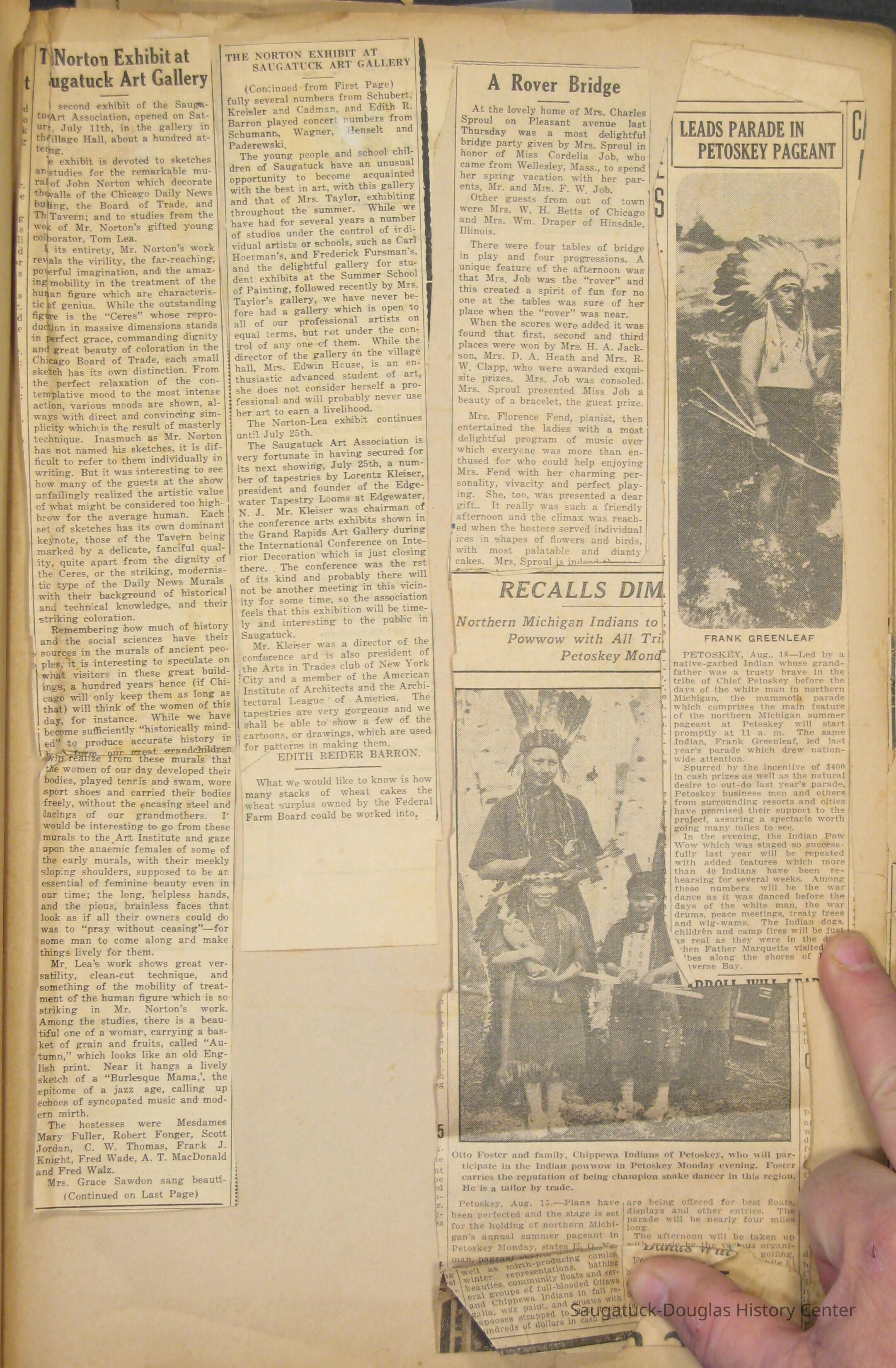 Plus notices about Woman's Club, Kaffee Klatch, Shorewood Association Injunction Case, Cooking Classes, a curious Air Mail party,a 1896 tornado, Bi-Centennial Party, performance by Peak Sisters, Meaning of the Poppy, Saugatuck Art Association, John Norton exhibit at Saugatuck Art Gallery, Frank Greenleaf leads Petoskey Pageant, Otto Foster and family participate in Indian powwow in Petoskey, Christmast tidings by Bonnie Busch, Congregational Church banquet, Powell Club, Womanless Wedding, Finch-Brown wedding, Henry T. Winchester and Prof. Herbert S. Mallory killed by train, and an editoiral against the use of tobacco by Mrs. M.E. Morrison.Collection