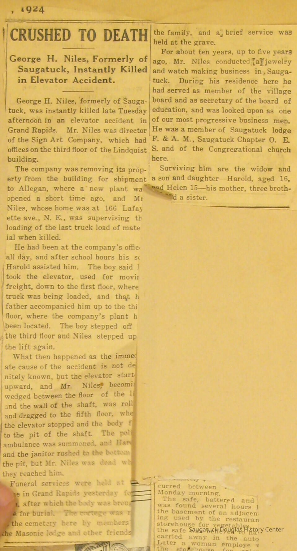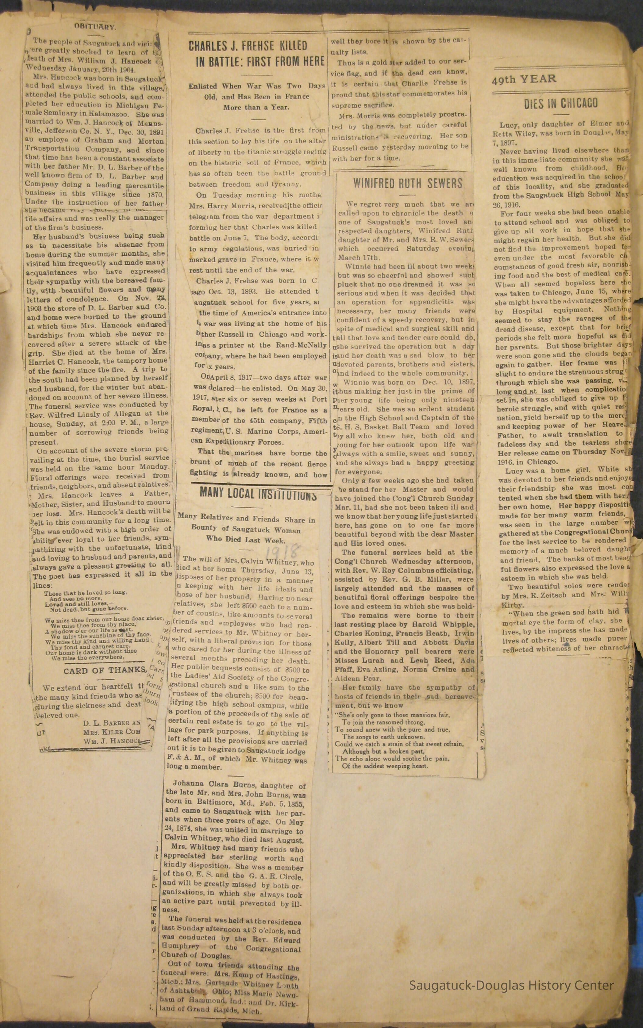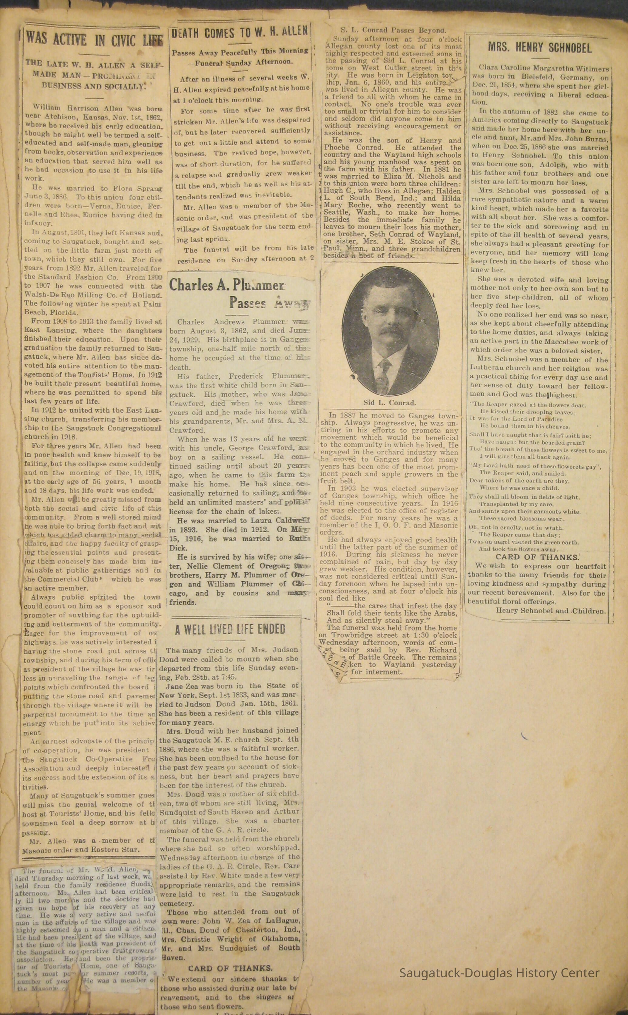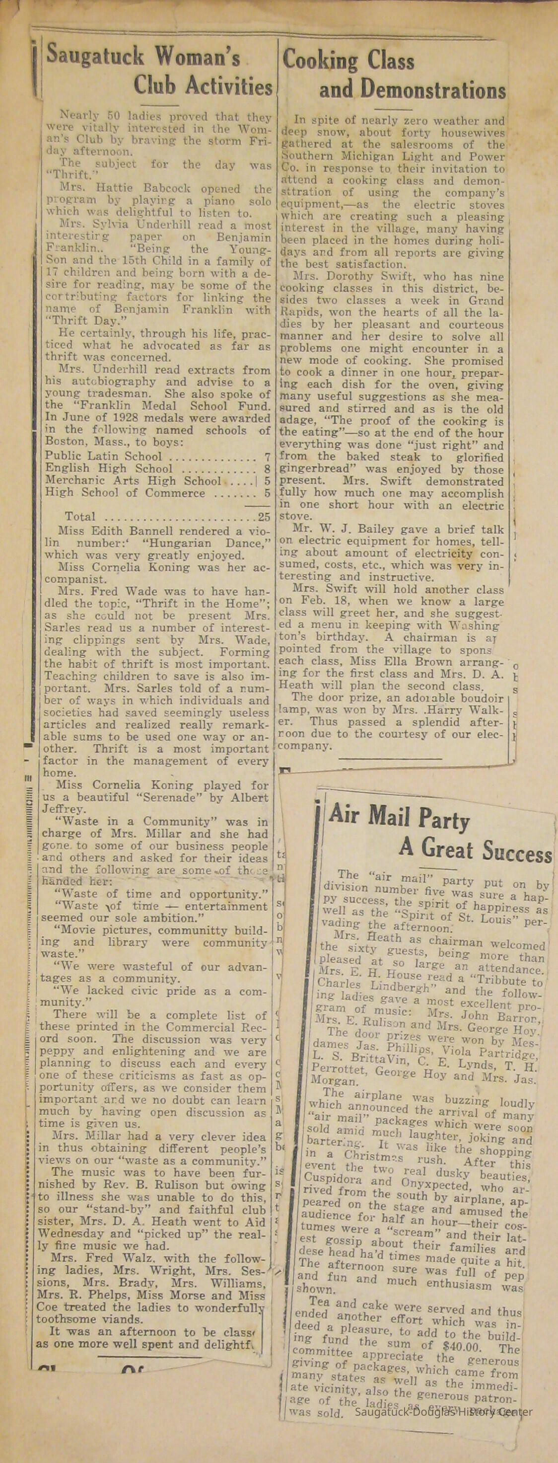 Plus notices about Woman's Club, Kaffee Klatch, Shorewood Association Injunction Case, Cooking Classes, a curious Air Mail party,a 1896 tornado, Bi-Centennial Party, performance by Peak Sisters, Meaning of the Poppy, Saugatuck Art Association, John Norton exhibit at Saugatuck Art Gallery, Frank Greenleaf leads Petoskey Pageant, Otto Foster and family participate in Indian powwow in Petoskey, Christmast tidings by Bonnie Busch, Congregational Church banquet, Powell Club, Womanless Wedding, Finch-Brown wedding, Henry T. Winchester and Prof. Herbert S. Mallory killed by train, and an editoiral against the use of tobacco by Mrs. M.E. Morrison.Collection