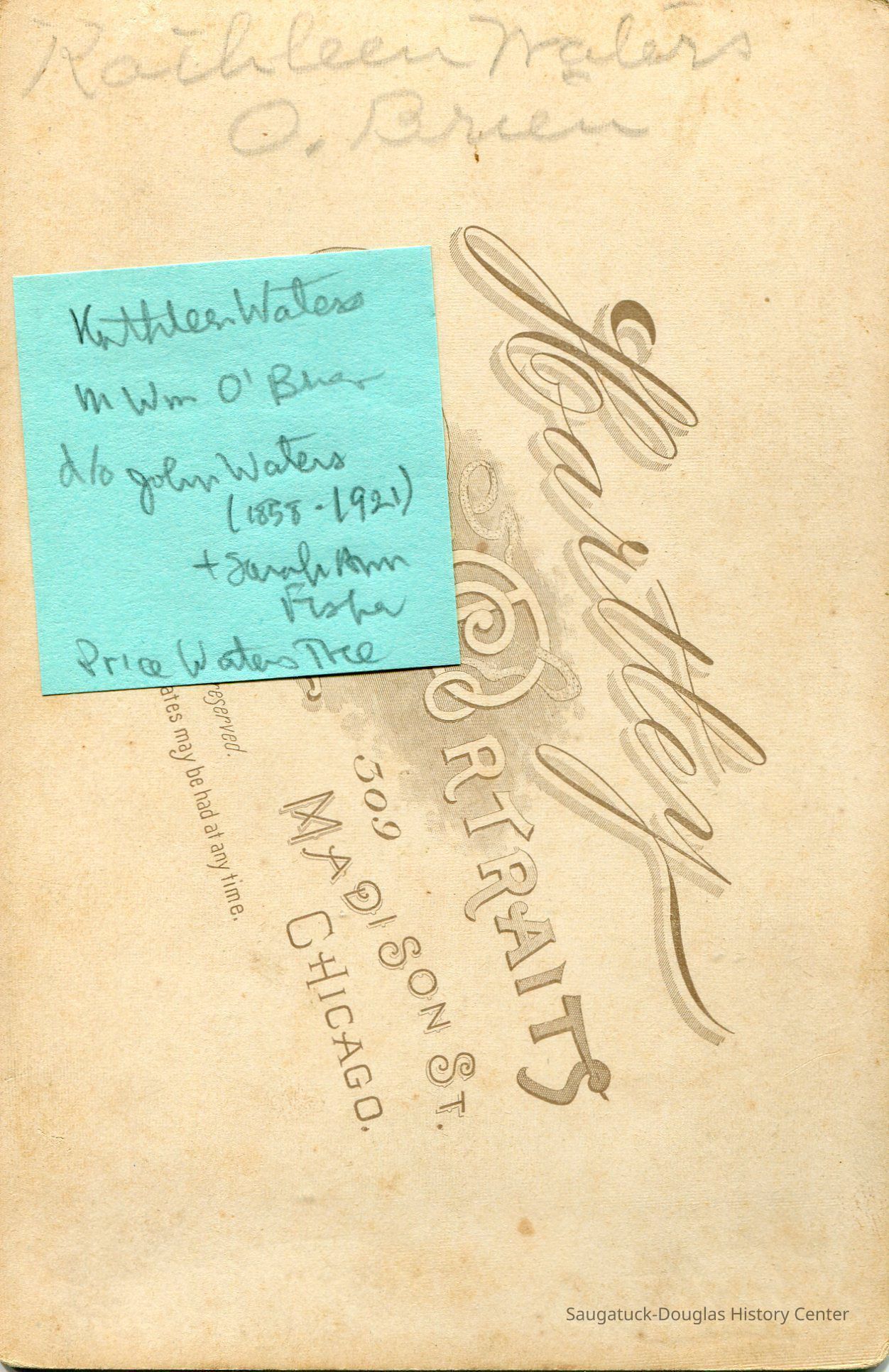 Kathleen Waters O'Brien is written in pencil on the back along with a green post-it noting the following in cursive: Kathleen Waters