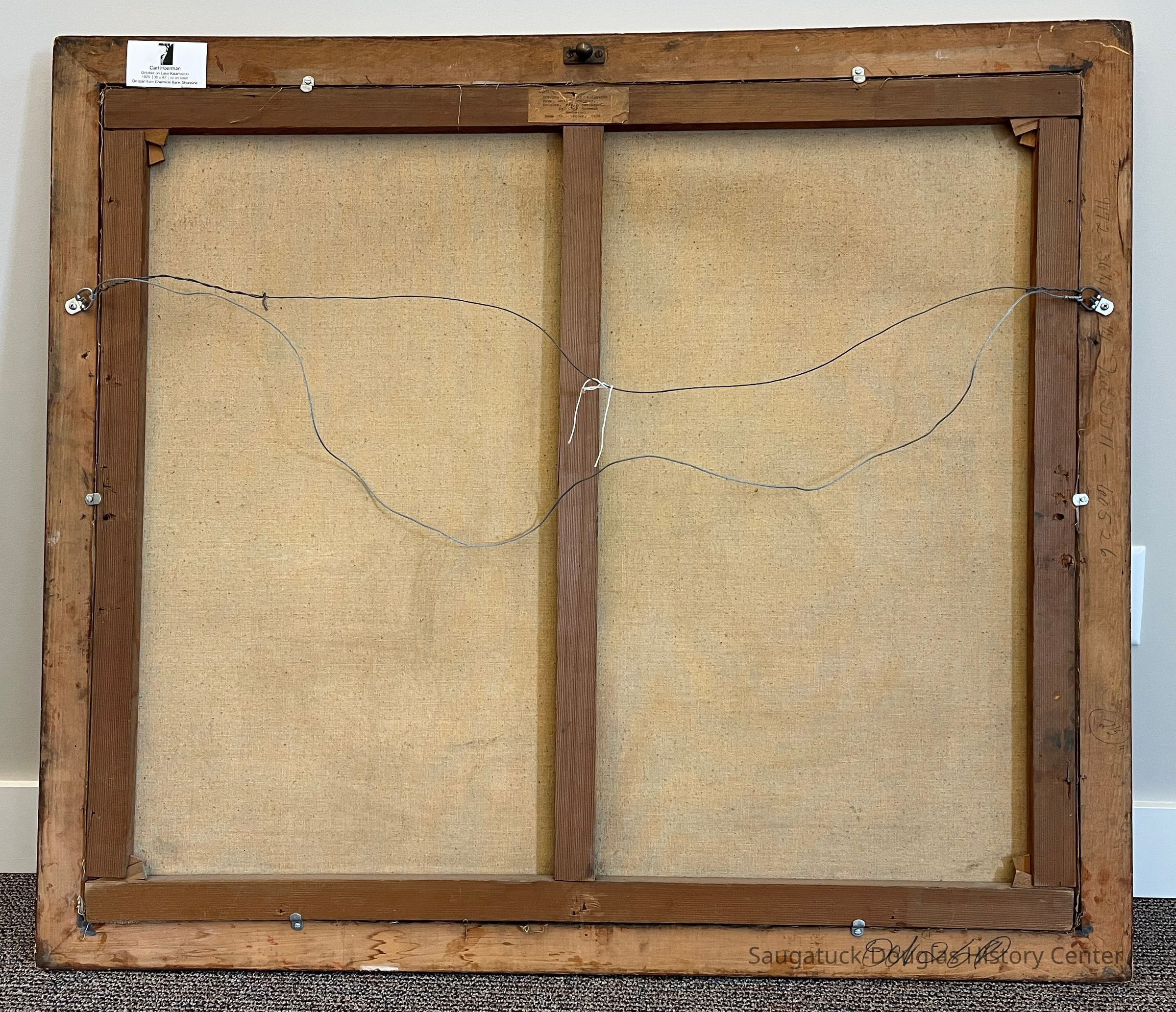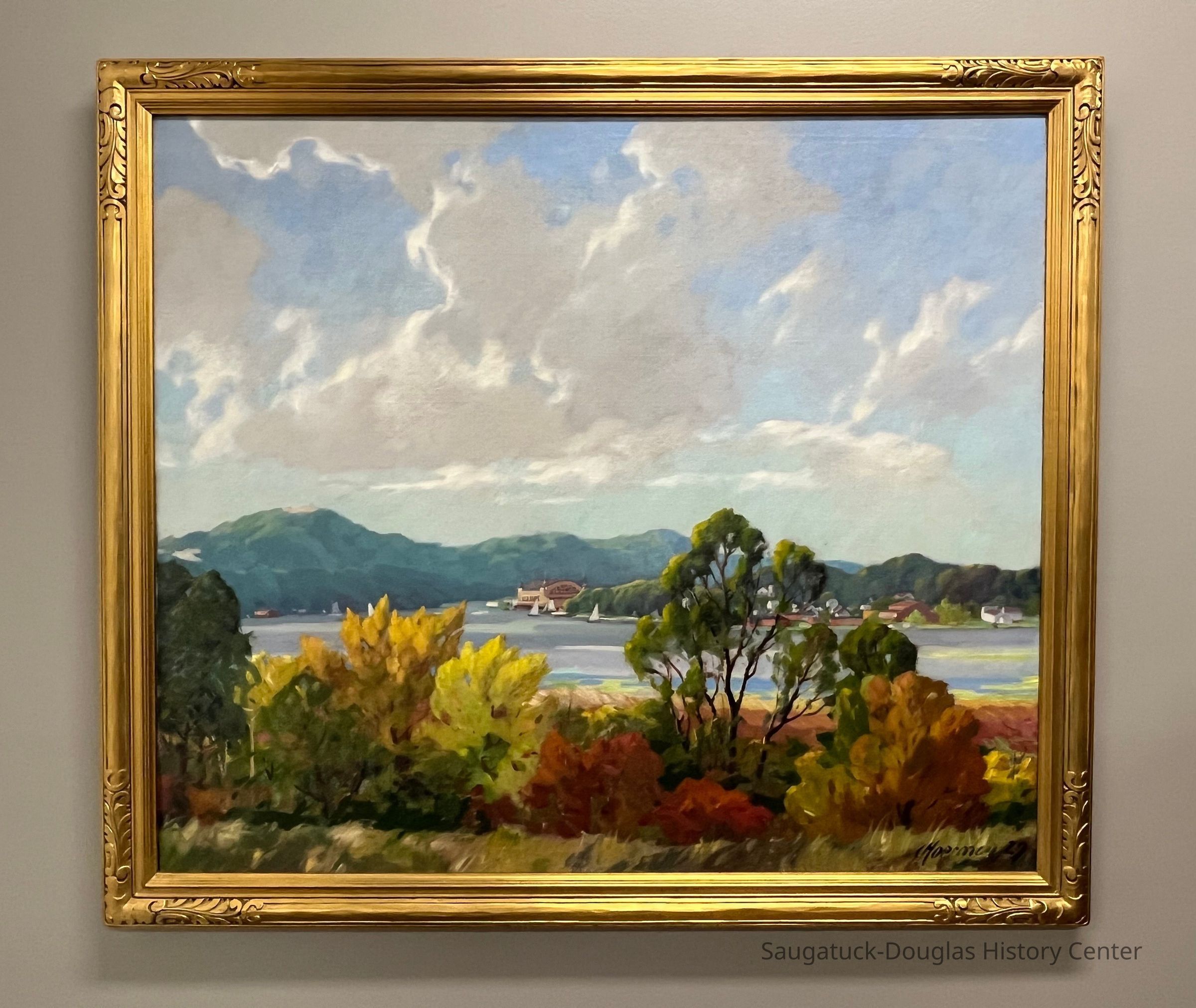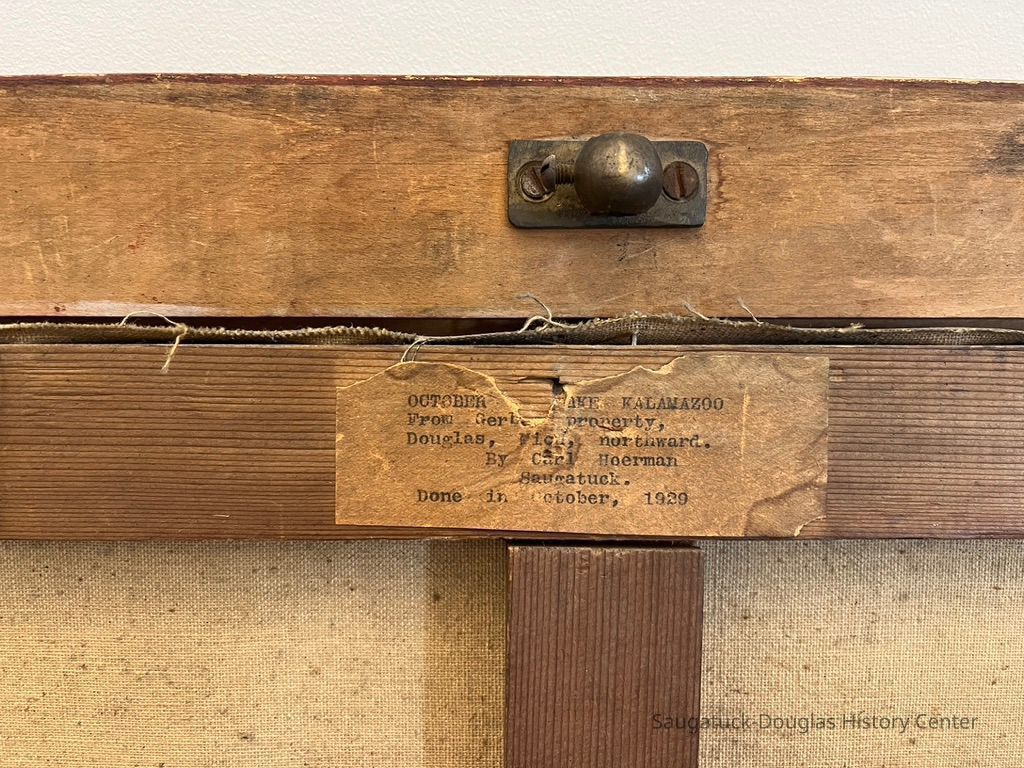 According to an article in the November 8, 1929 Commercial Record newspaper, the work is "painted from the scenic shoreline of hte Gerber (Spencer) estate in Douglas looking across towards Saugatuck, showing, in the foreground the colorful raiment of fall in three and bush, with the distant wood-clad dunes in the hazy blue-green shadows of an afternoon sun with Saugatuck's land mark—the Pavilion—near the center."Collection