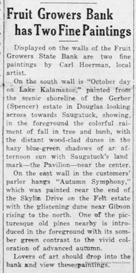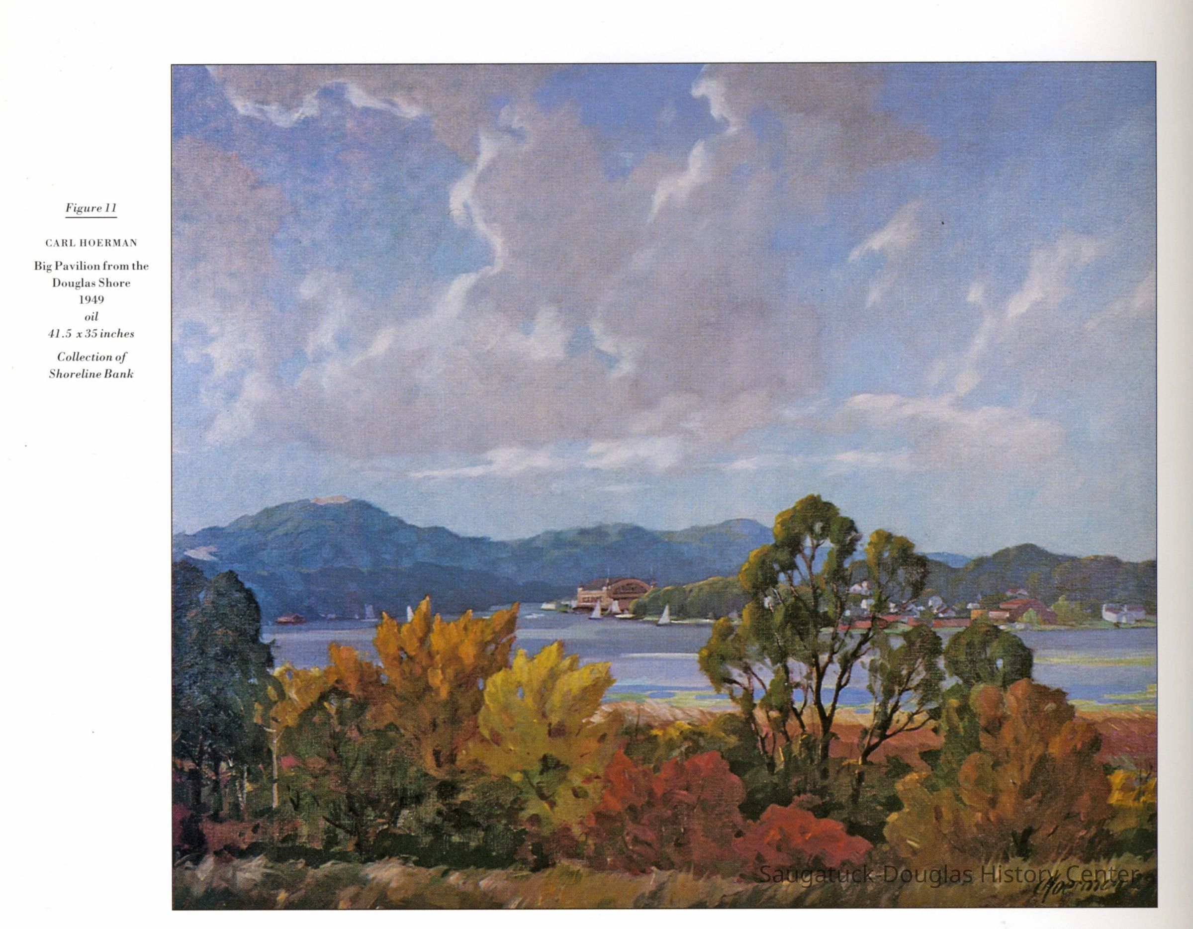 “In Michigan and Chicago, Hoerman is best known for his landscapes and dune scenes with dramatic foliage outlined against a sky of swirling clouds. In this painting of Kalamazoo Lake the viewer looks over the south bank of the lake, past fall-tinted foliage to the village of Saugatuck on the north bank where the Big Pavilion looks pink in the brightness of a morning sun. The sandy top of Mount Baldhead gleams in the distance.”1