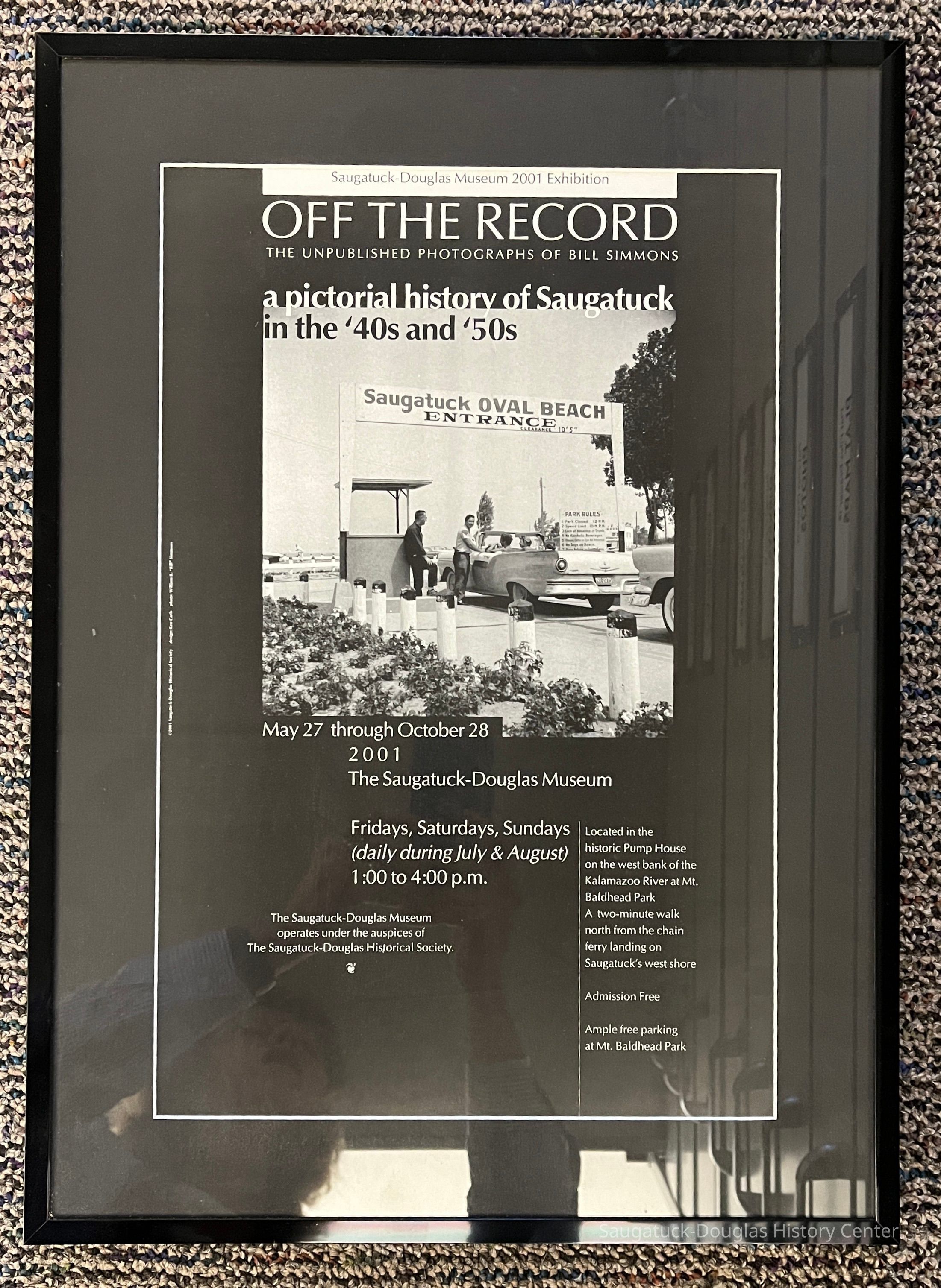 Framed poster for the 2001 SDHS museum exhibit "Off the Record: the unpublished photographs of Bill Simmons"