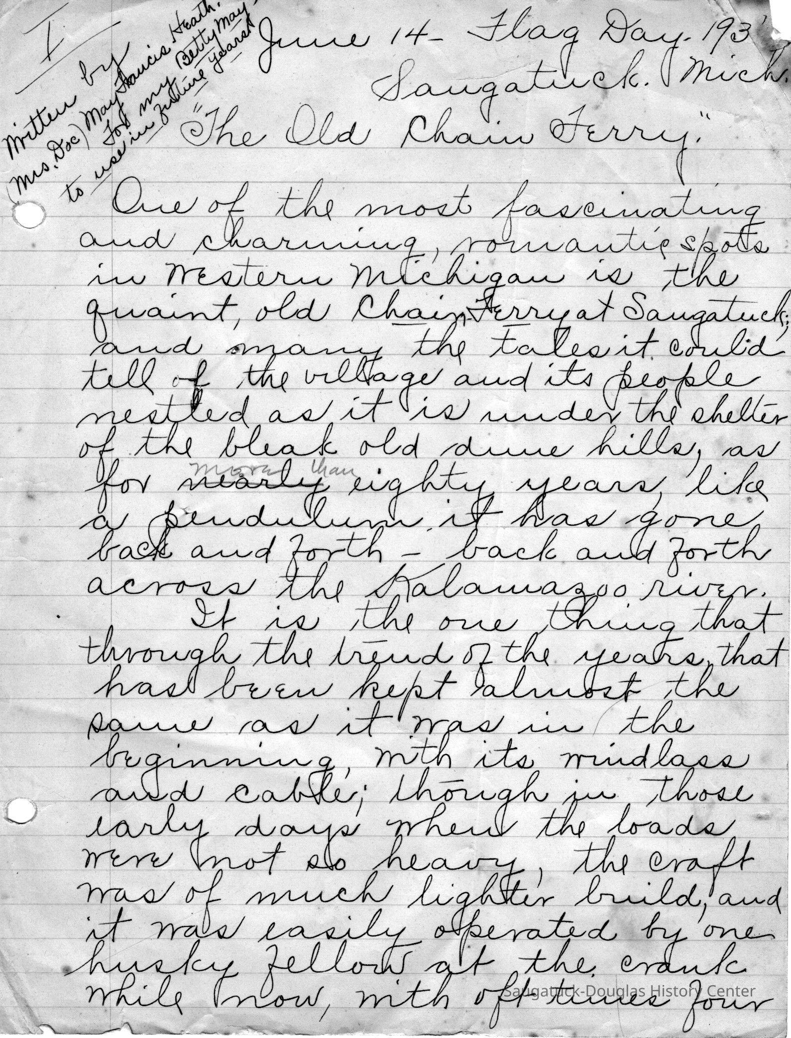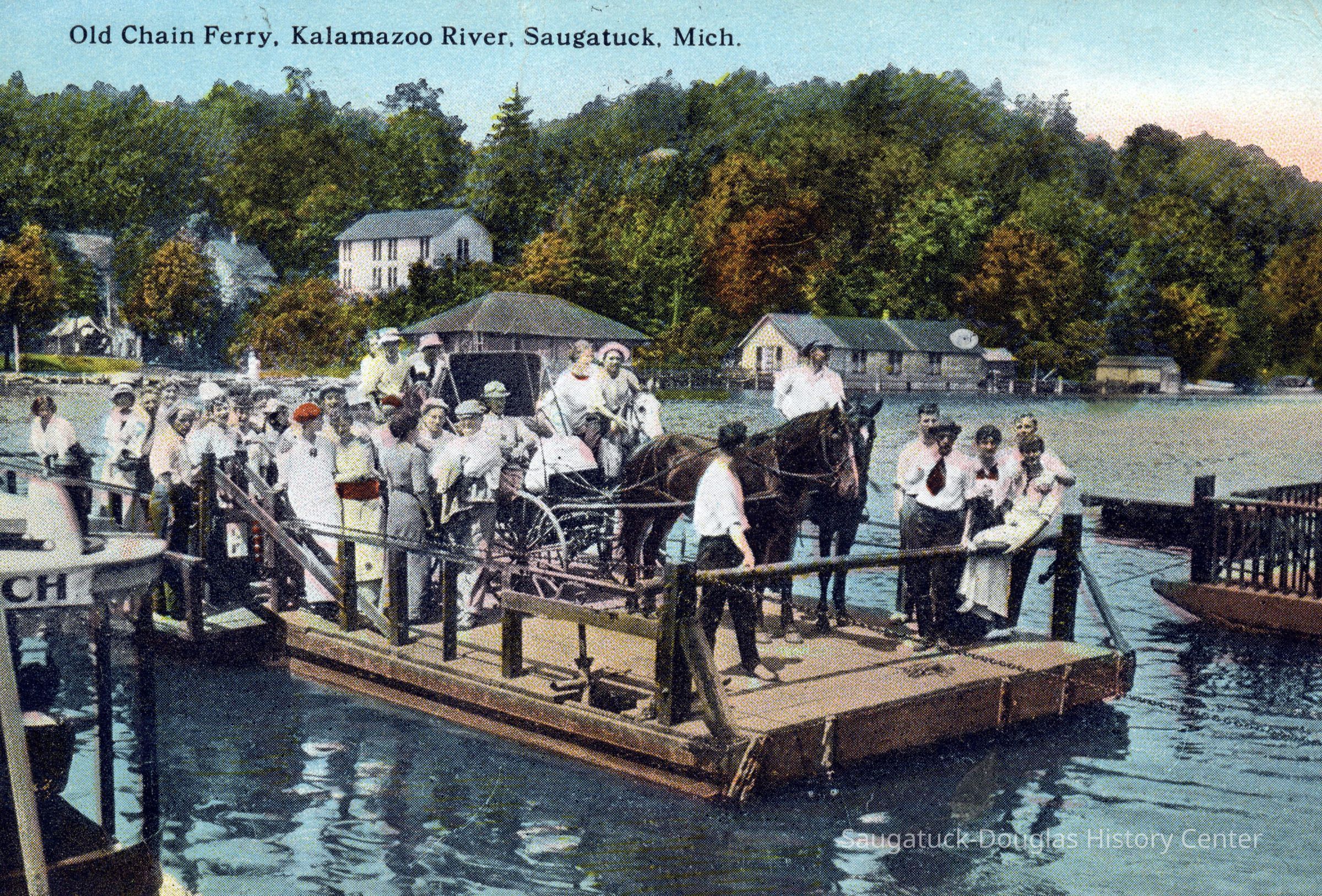 One of the most fascinating and charming, romantic spots in Western Michigan is the quaint, old Chain Ferry at Saugatuck and many tales it could tell of the village and its people nestled as it is under the shelter of the bleak old dune hills, as for more than eighty years, like a pendulum, it has gone back and forth- back and forth- across the Kalamazoo river