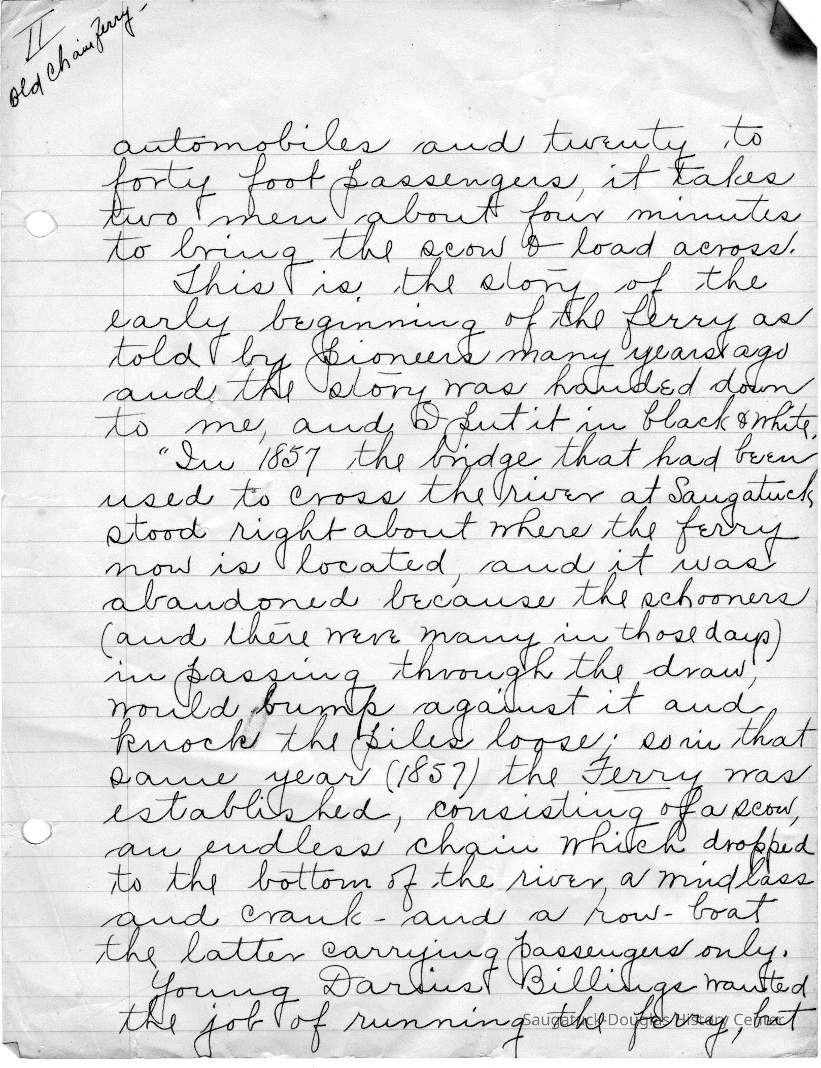 This is the story of the early beginning of the ferry as told by pioneers many years ago and the story was handed down to me, and I put it in black and white.