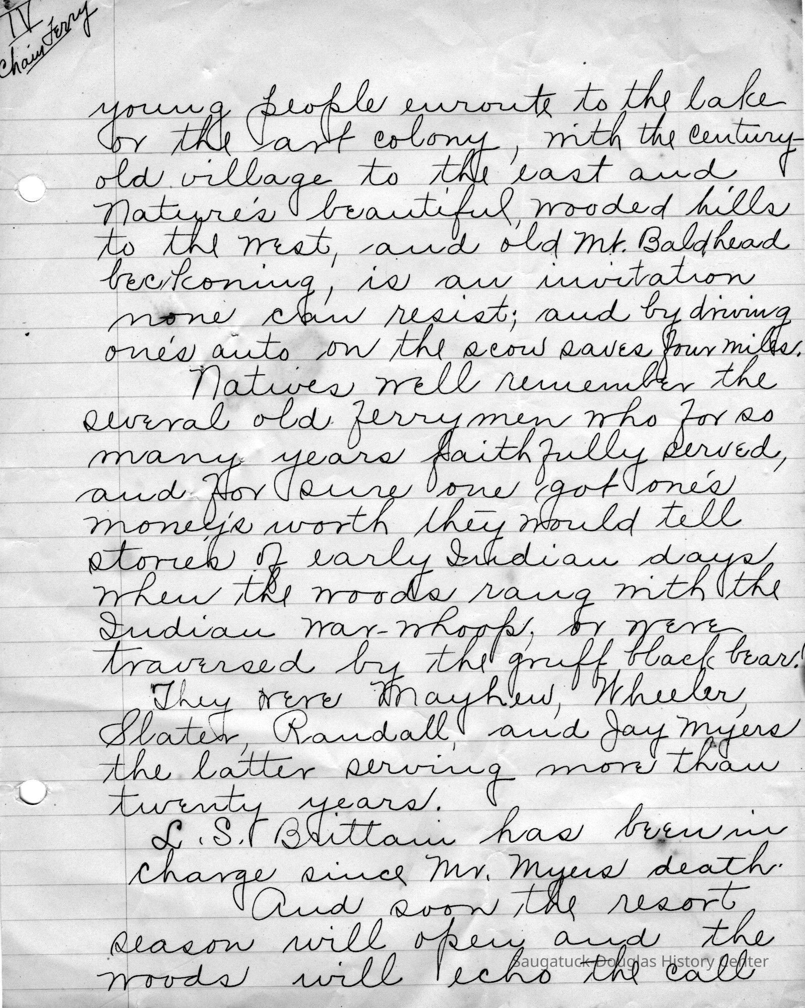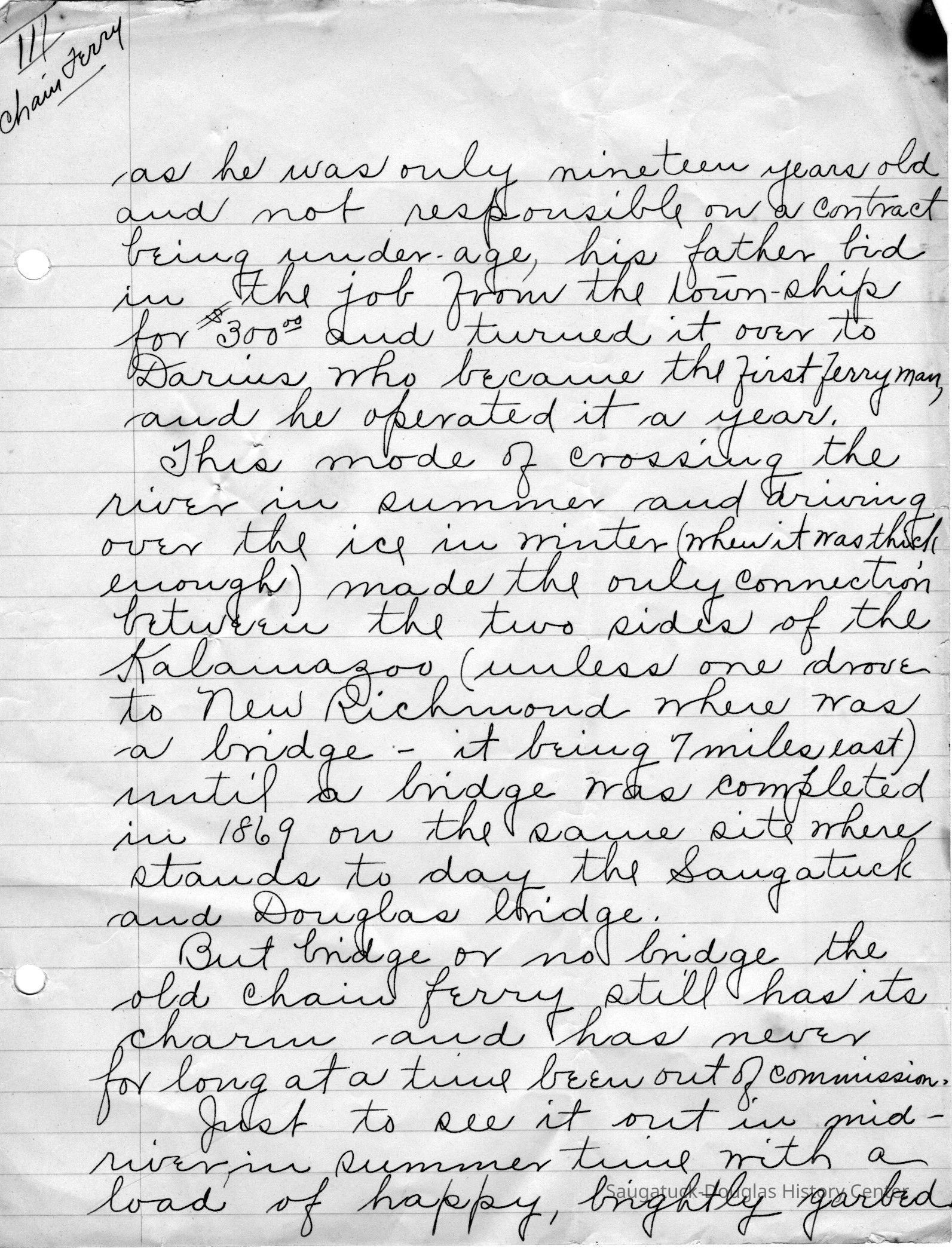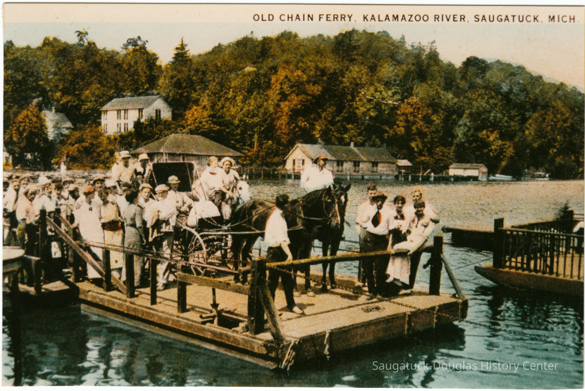 This mode of crossing the river in the summer and driving over the ice in the winter (when it was thick enough) made the only connection between the two sides of the Kalamazoo (unless one drove to New Richmond where was a bridge- it being 7 miles east) until a bridge was completed in 1869 on the same site where stands today the Saugatuck and Douglas bridge.
