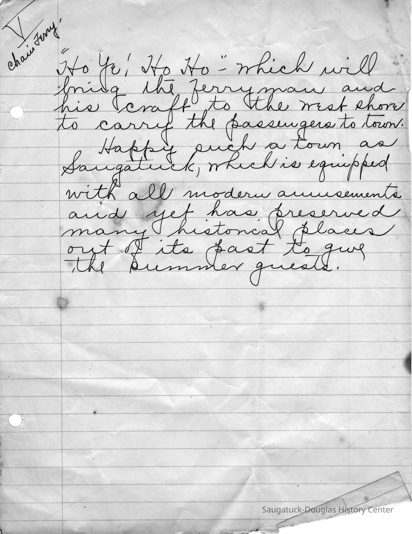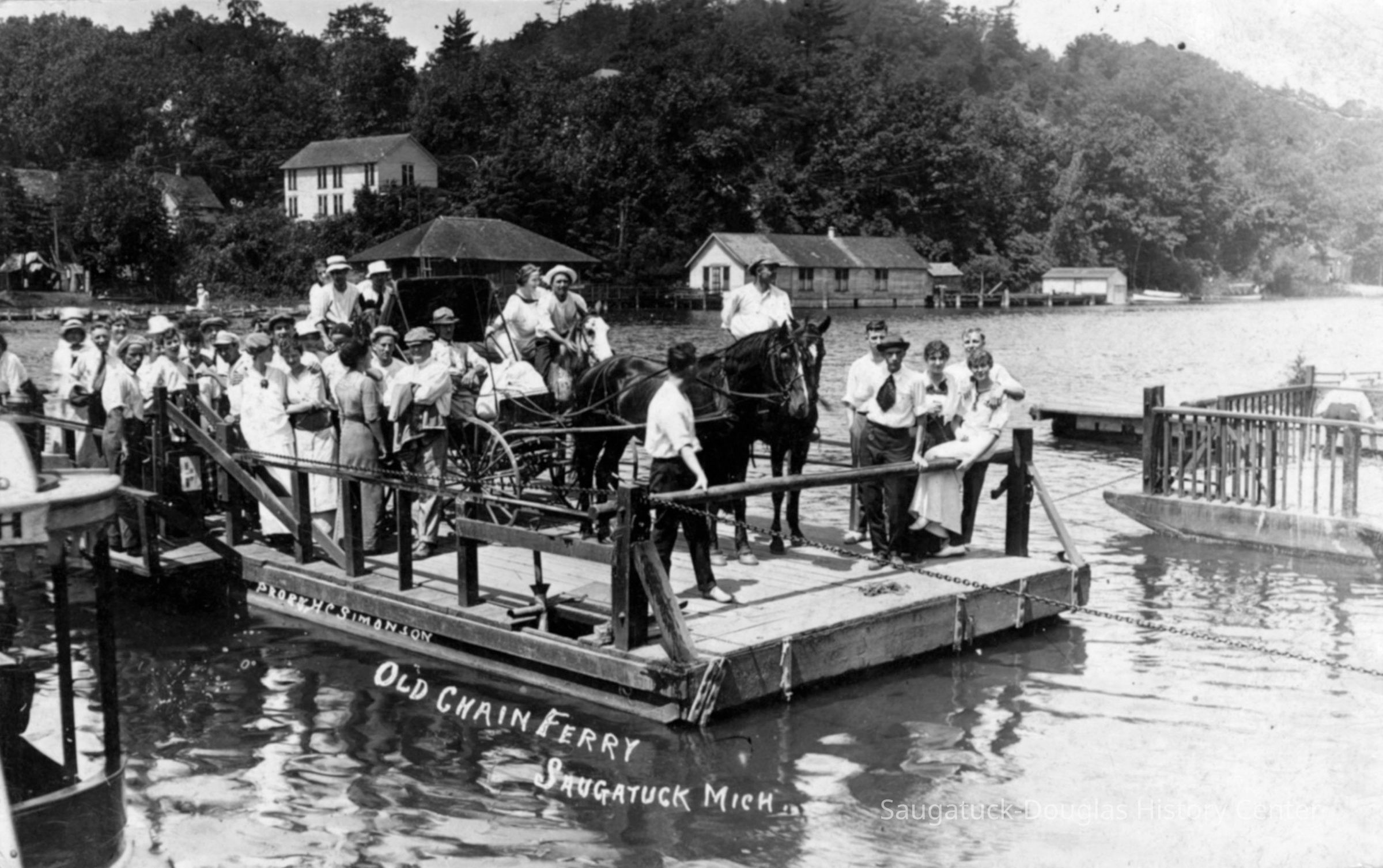In 1857 the bridge that had been used to cross the river at Saugatuck stood right about where the ferry now is located, and it was abandoned because the schooners (and there were many in those days) in passing through the draw, would bump against it and knock the piles loose; so in that same year (1857) the Ferry was established, consisting of a scow, an endless chain which dropped to the bottom of the river, a windlass and a crank- and a row-boat the later carrying passengers only.
