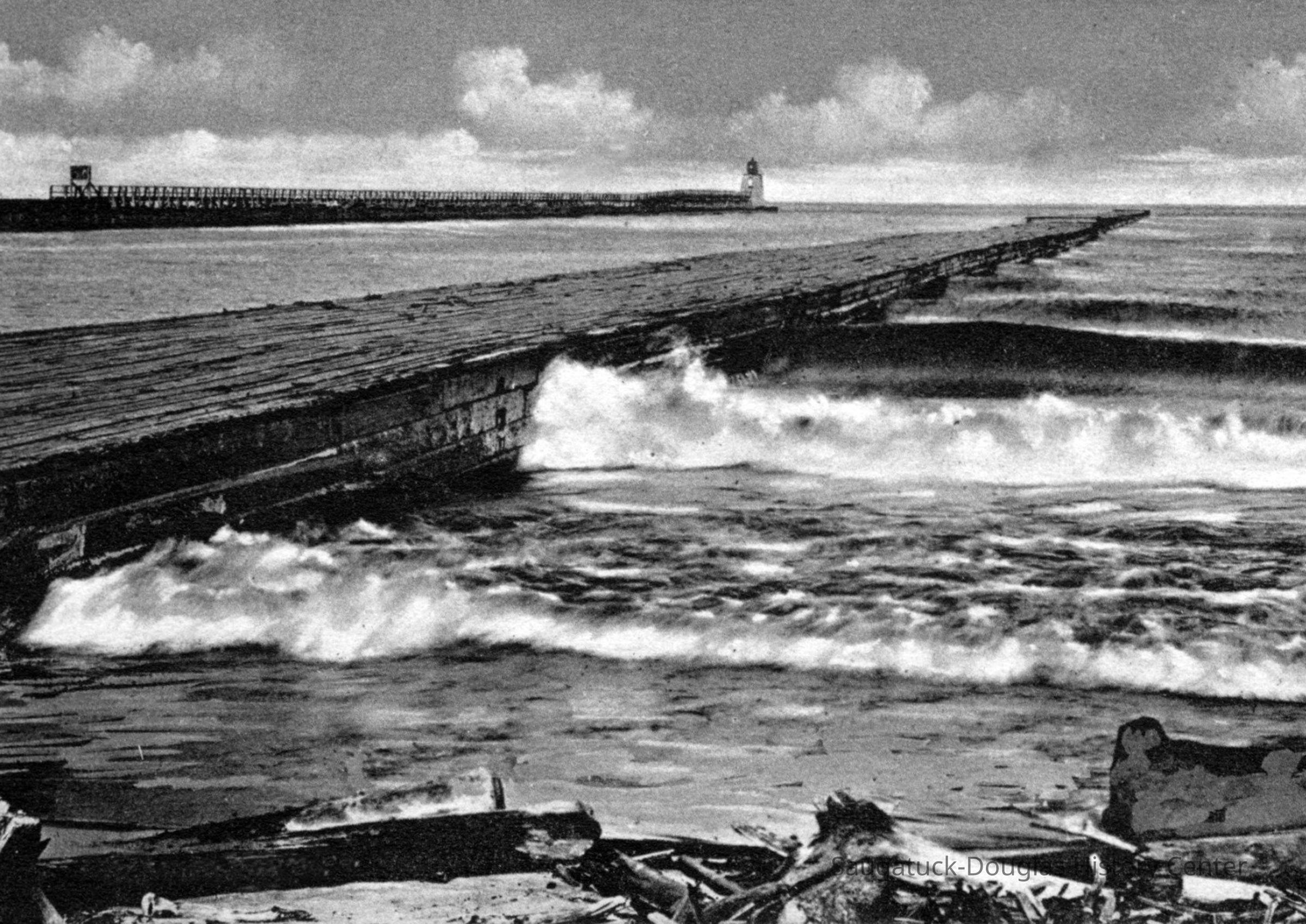 This image was featured as History Mystery #40 with the question "The old piers (see the remnants at the Oval Beach) were completed in 1873 and remained in use until about 1909. What is unusual in this photo and how was this circa 1897 photo dated?" and the solution "In 1894, a catwalk was installed so that the light - mounted on cart that rolled on steel rails - could be serviced without going to the pier head. The system was removed in 1900."Photograph Details