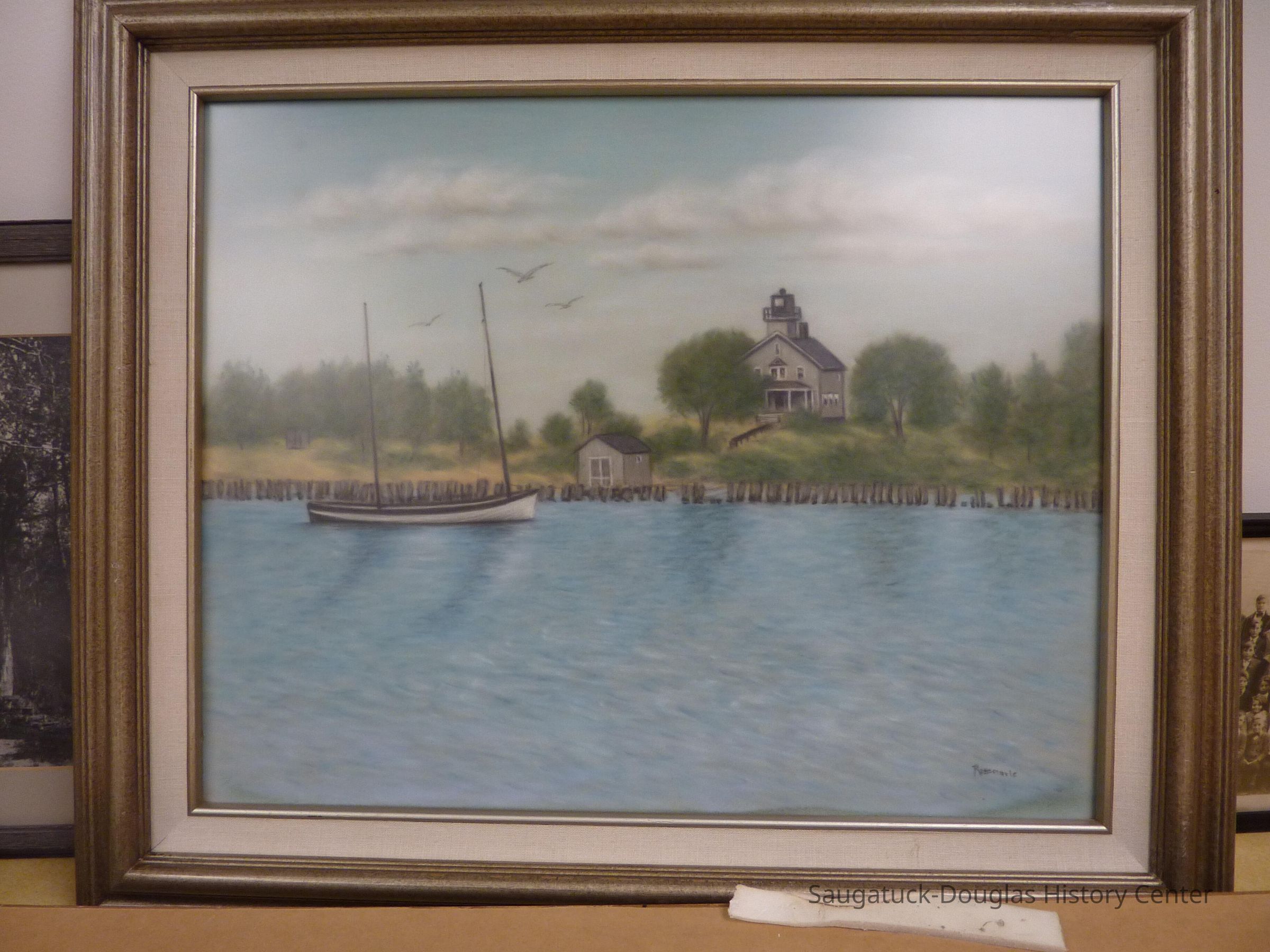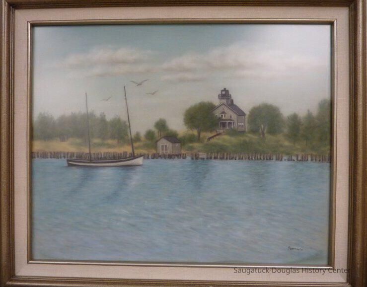 This pastel drawing depicts the old lighthouse that stood at the old Saugatuck Harbor. It also shows a boat in the foreground on the water.Collection