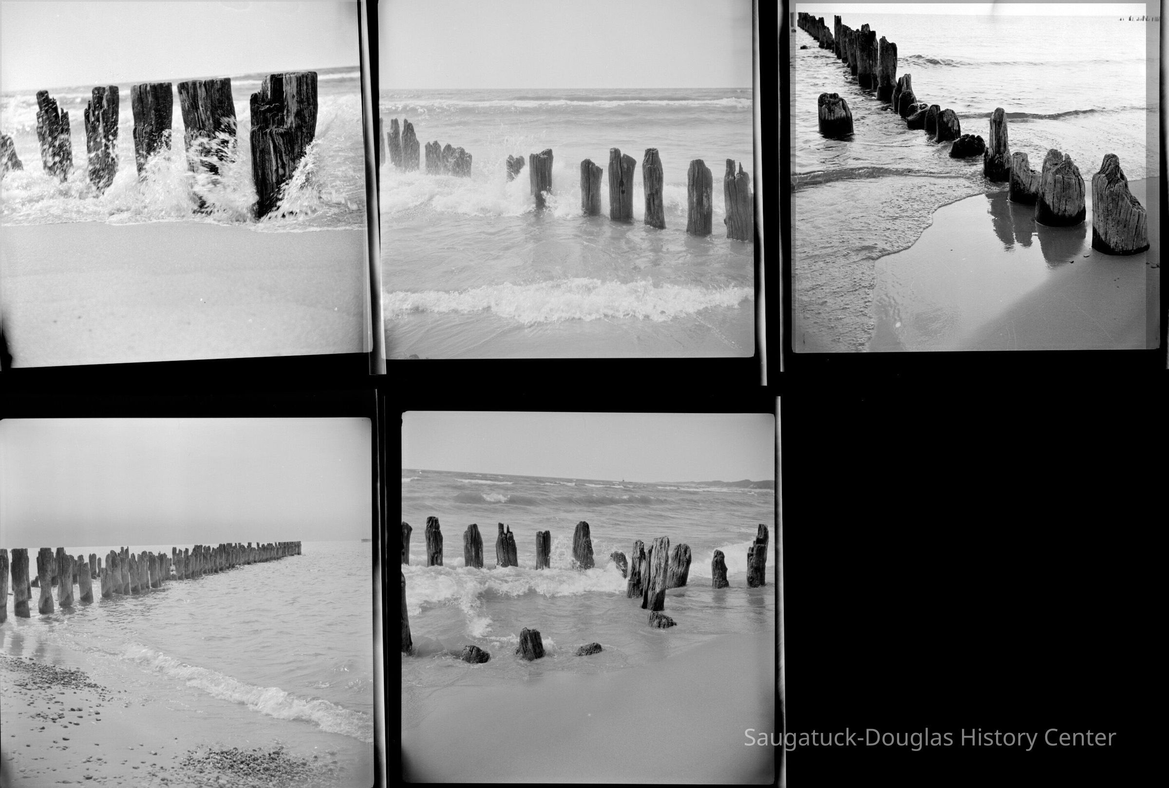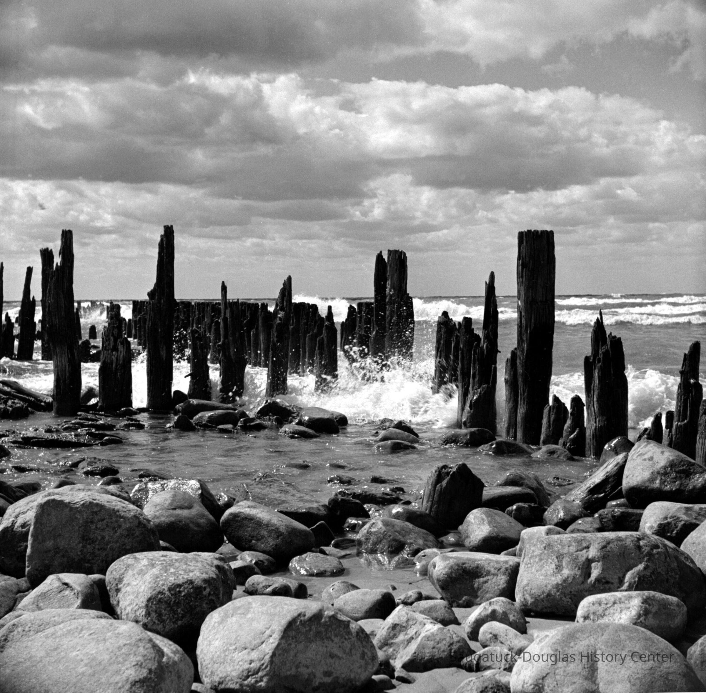 615 0/1 Saugatuck - beach 9/1945 Waves and piling on Lake Michigan