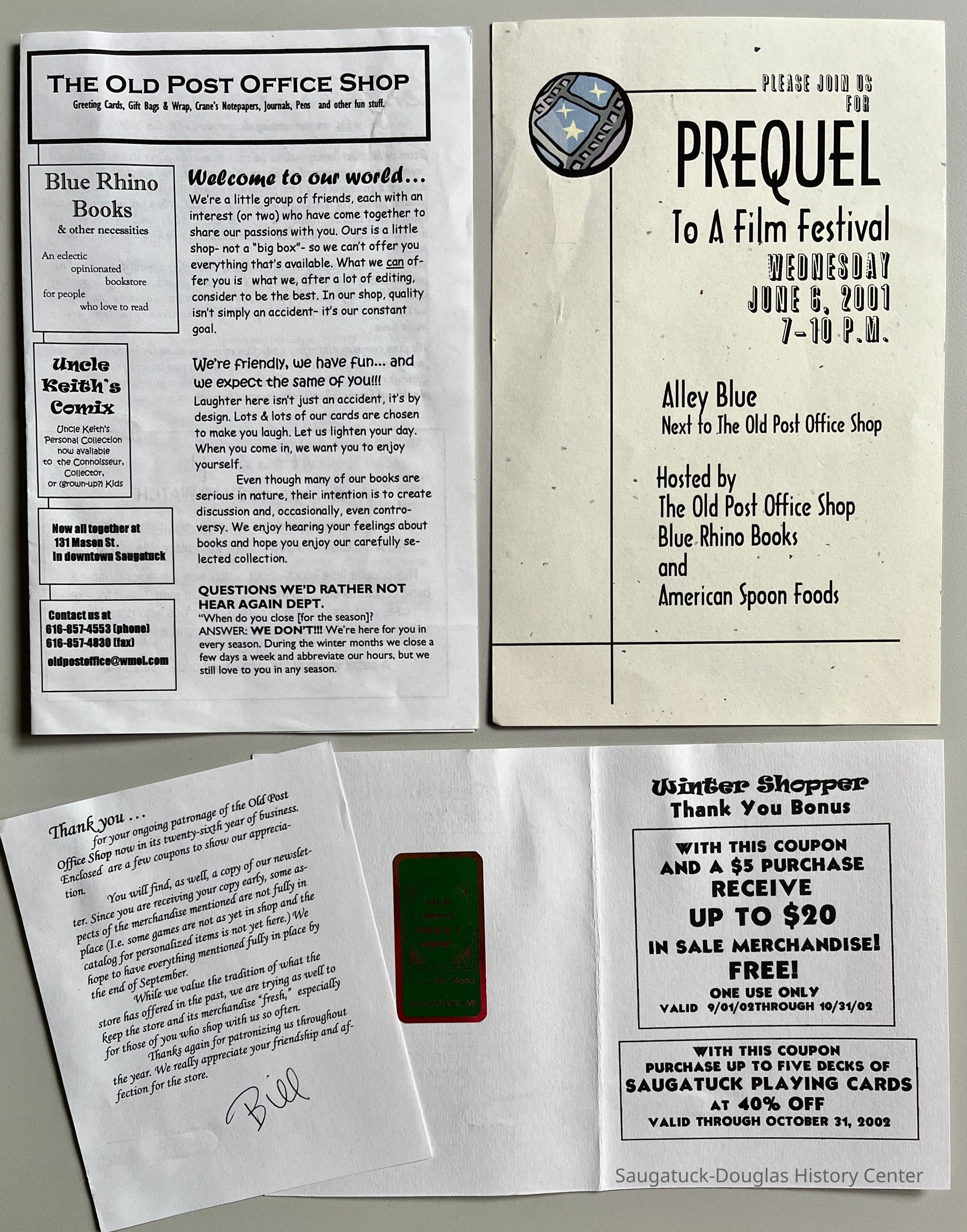 Newsletter and card/coupon from Bill Galligan of the Old Post Office Shop when it was located at 131 Mason Street, thanking winter shoppers and announcing the addition of David and Alison Swan's Blue Rhino Books and "Uncle Keith's Comix"