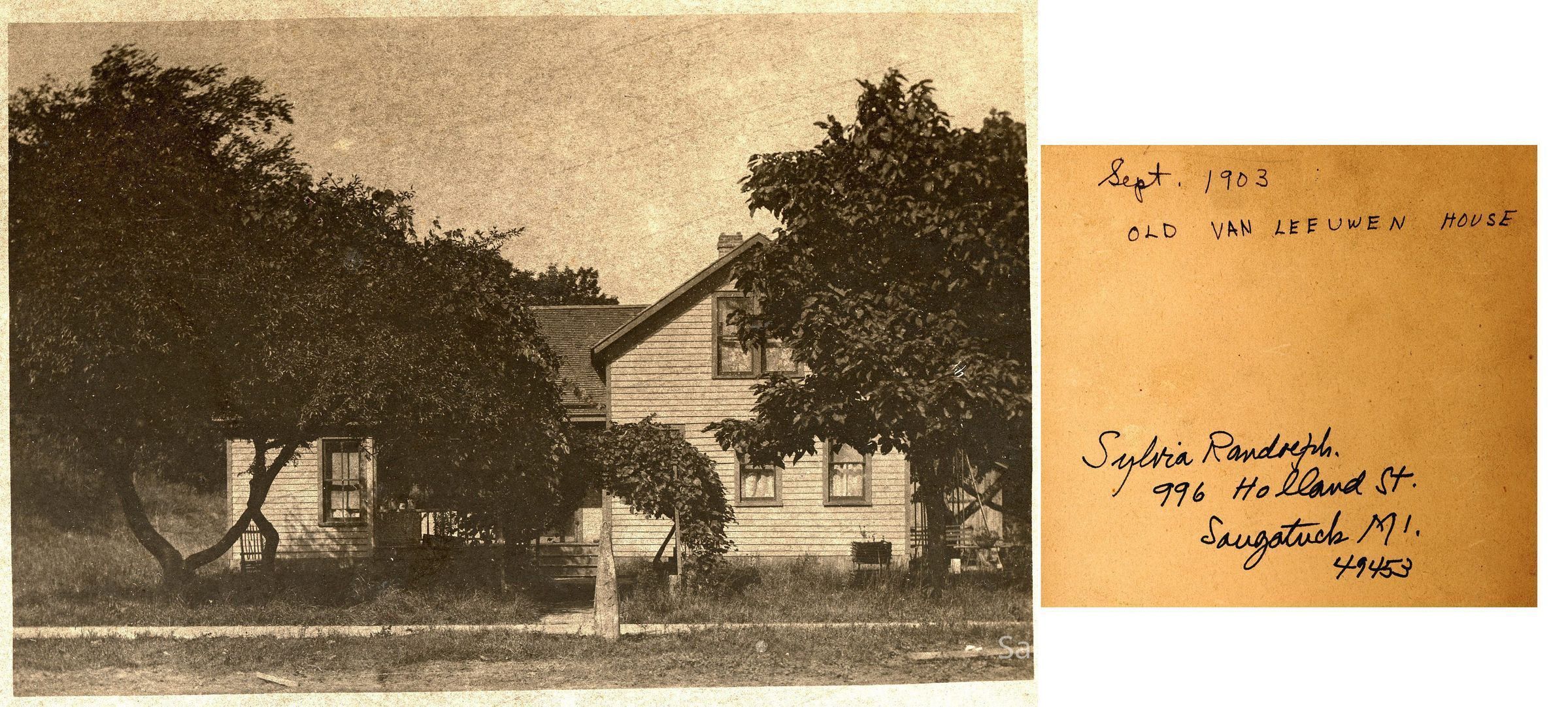 On the back of the mounting board is written "1903 Old Van Leeuwen House, Sylvia Randolph, 996 Holland St.," and a post-it note "Return to Sandy RandolphPhotograph Details
