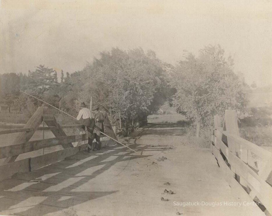 10"x8" black and white photograph with label "Old Wooden Bridge, Kalamazoo River (North Channel); Saugatuck, Mich. Replaced about 1905. EHE"
