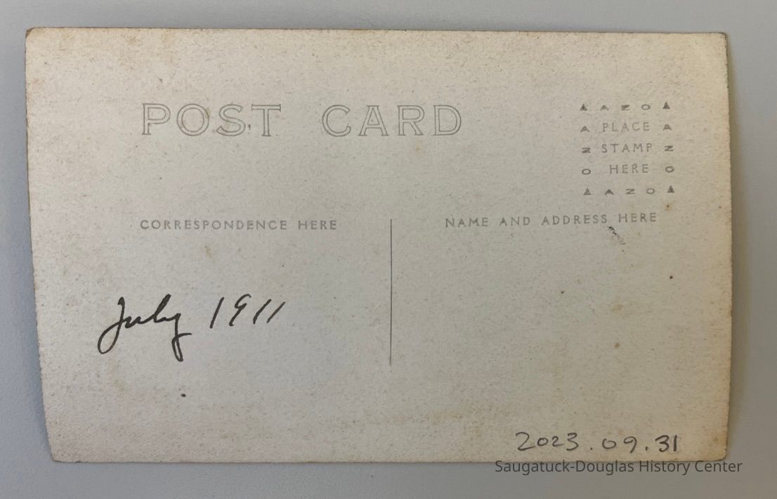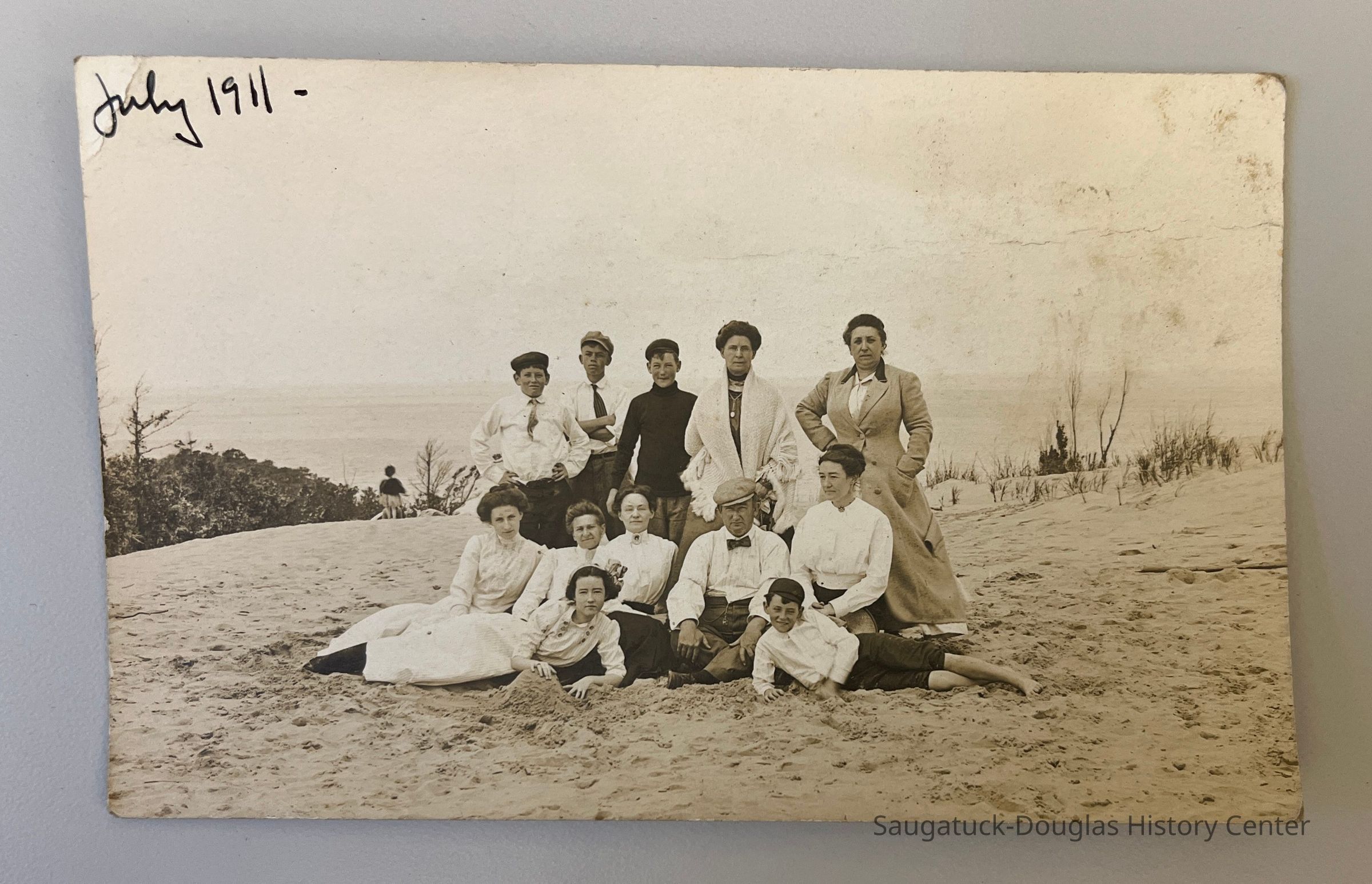 Real photo postcard of unidentified group of people on top of Mt. Baldhead. Photo is taken facing west, with Lake Michigan in the background.Photograph Details