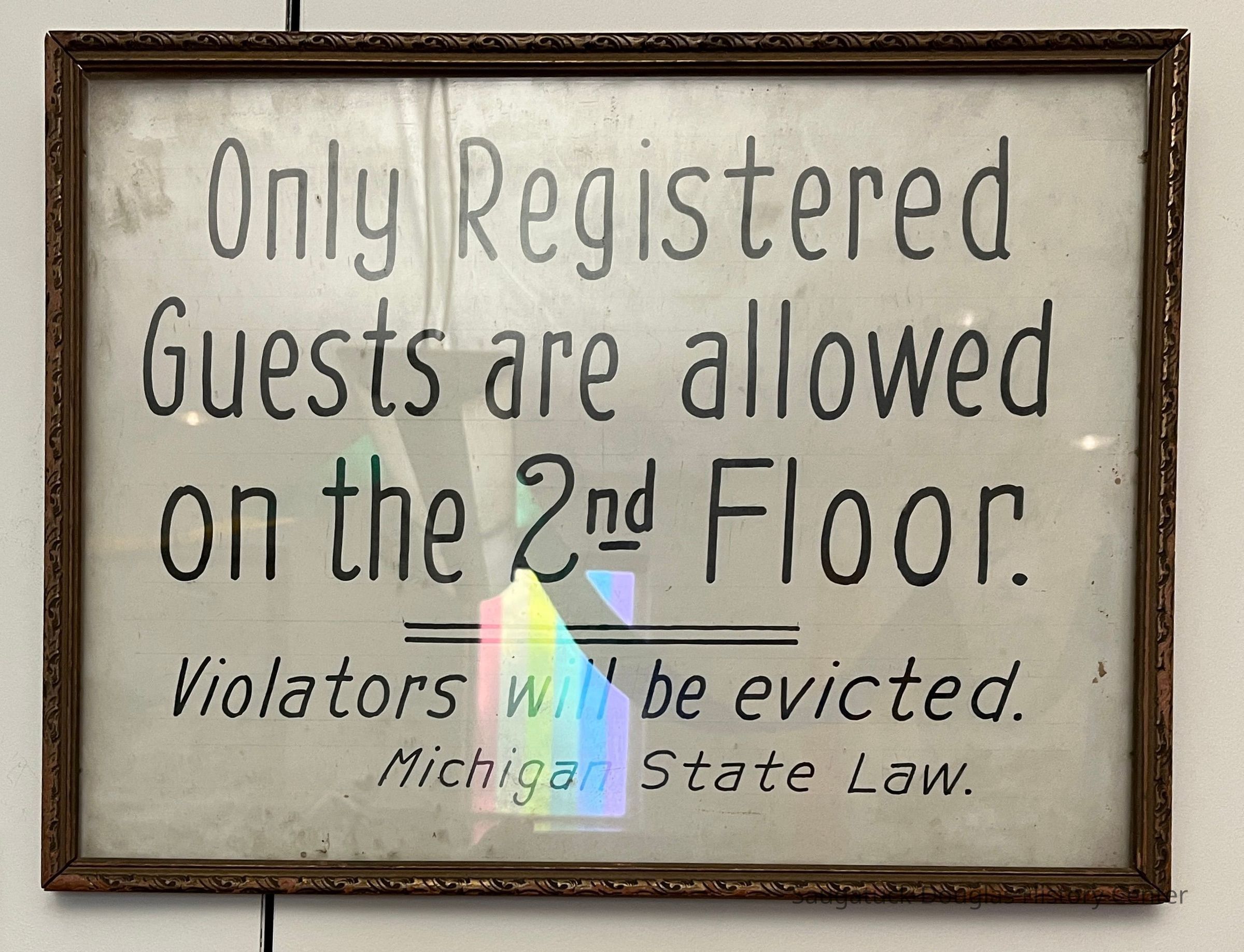 The sign reads "Only registered guests are allowed on the 2nd floor. Violators will be evicted. Michigan State Law." The sign is behind glass in a narrow wood frame.Context