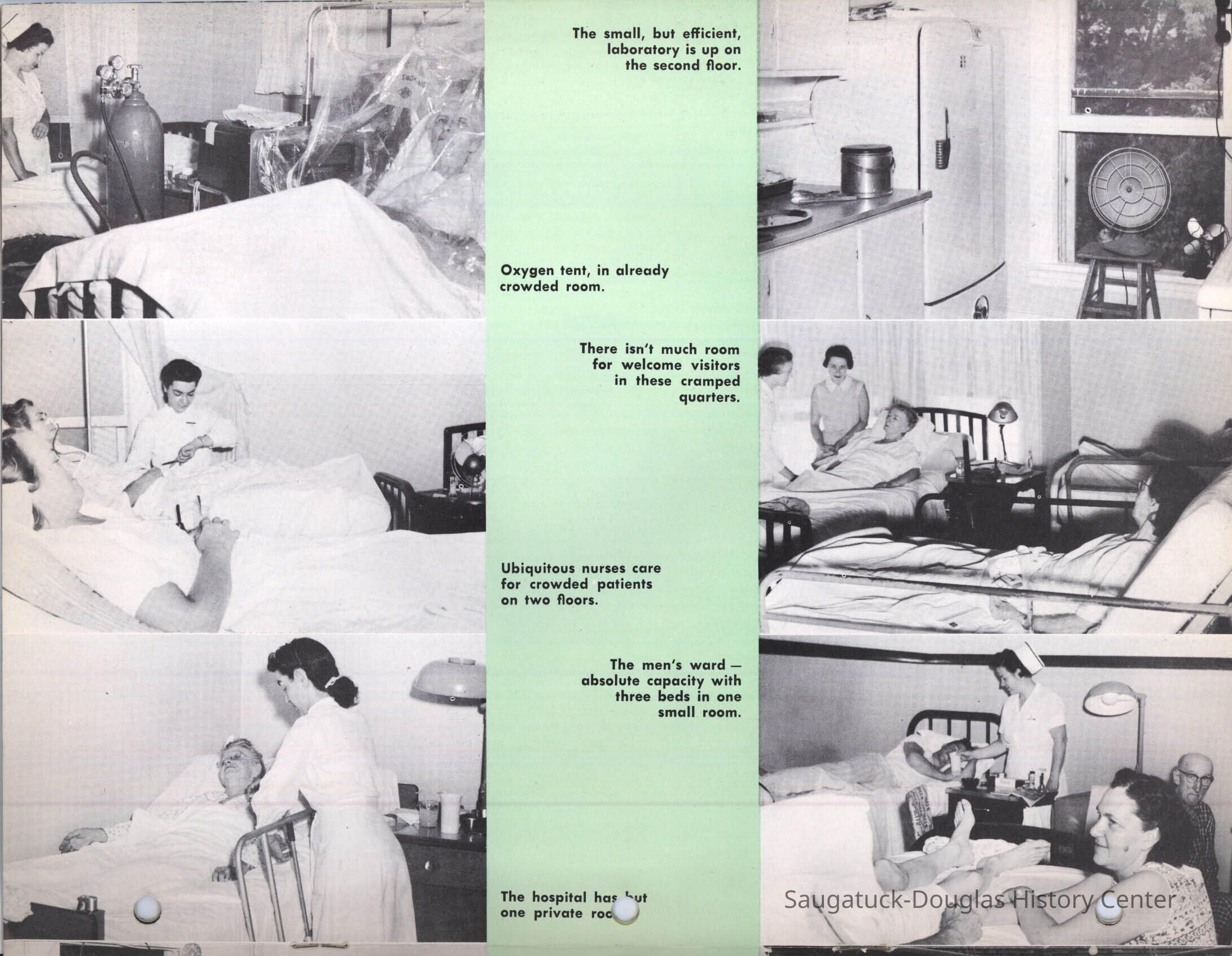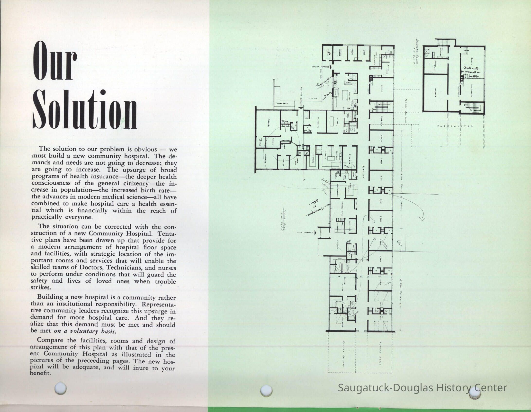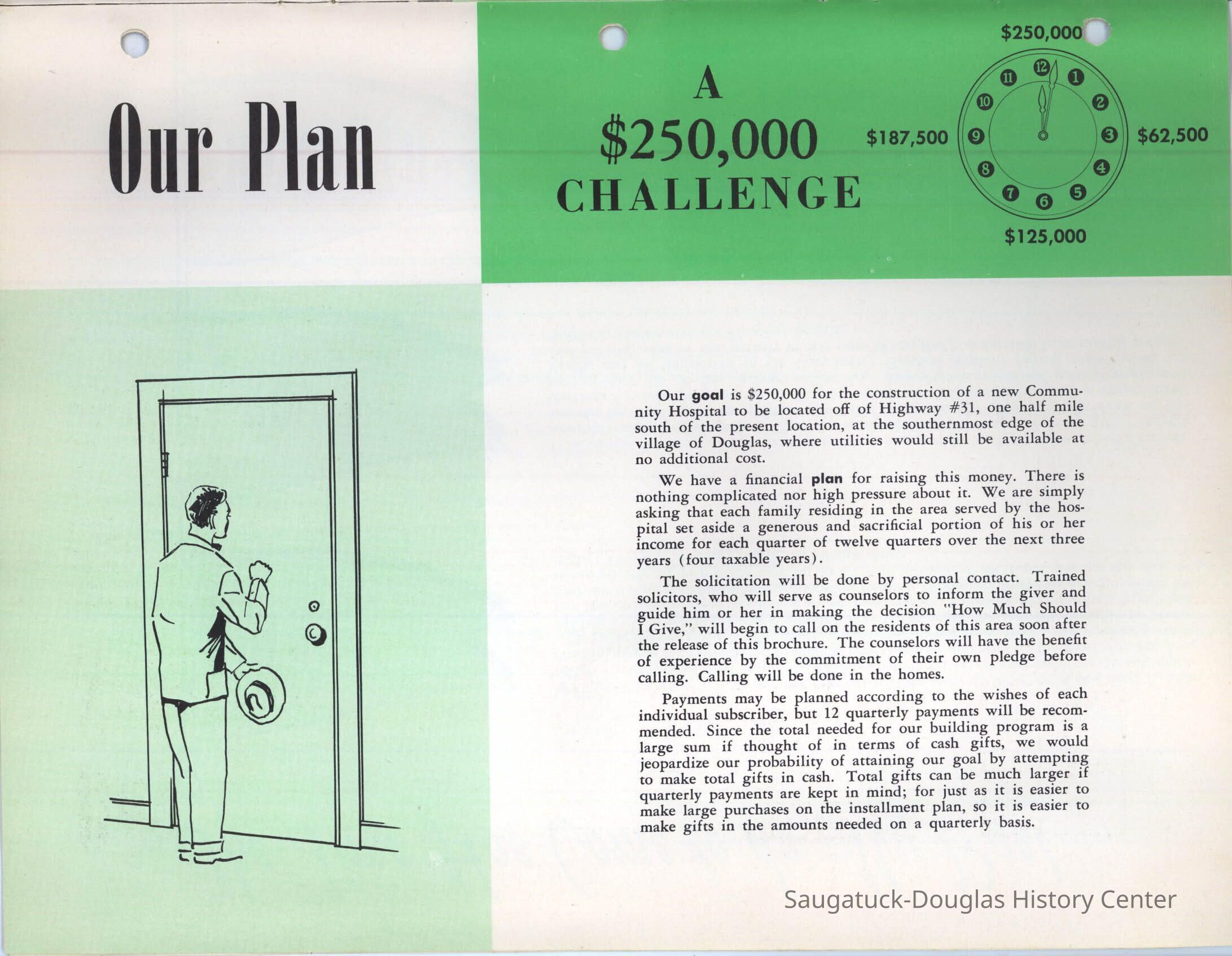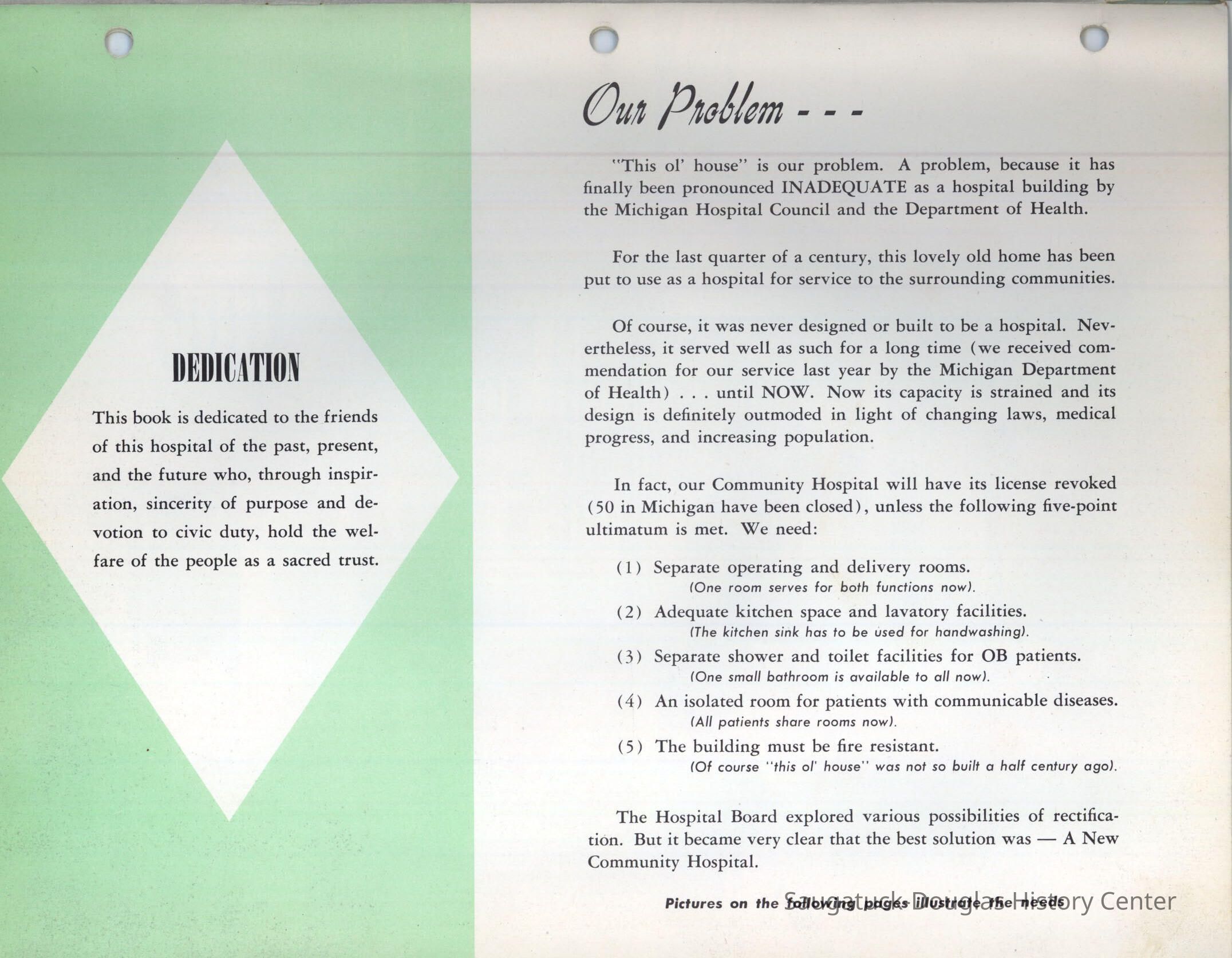 Letter and 6 page brochure promoting the proposed Community Hospital (Saugatuck/Douglas Michigan) Photos include the old hospital in the Kirby House and the problem of it being inadequate for the needs of the community. The last two pages show the floor plan and the $250,000 challenge