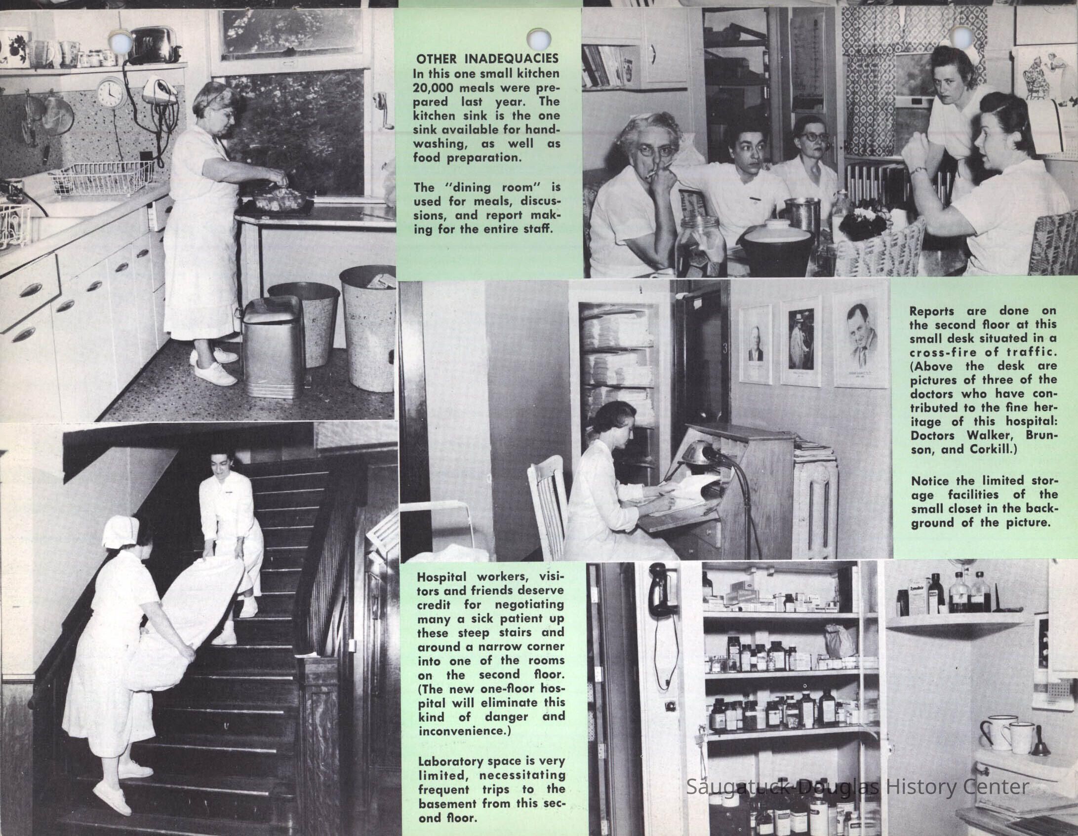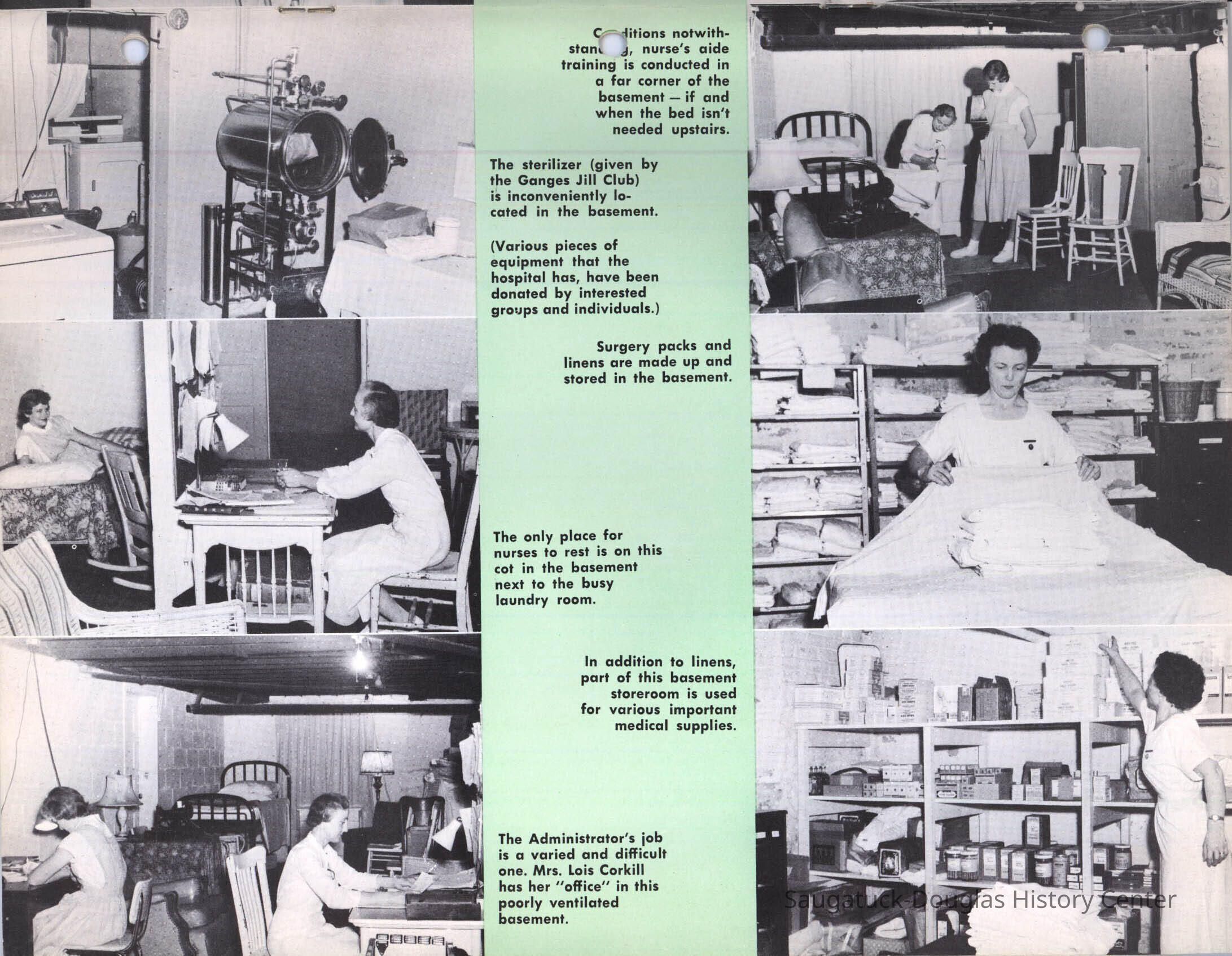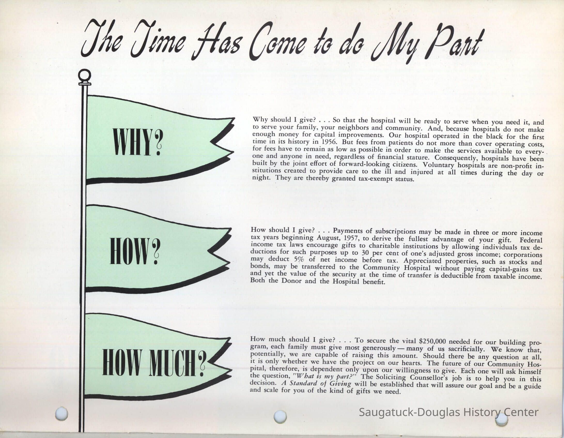 Letter and 6 page brochure promoting the proposed Community Hospital (Saugatuck/Douglas Michigan) Photos include the old hospital in the Kirby House and the problem of it being inadequate for the needs of the community. The last two pages show the floor plan and the $250,000 challenge