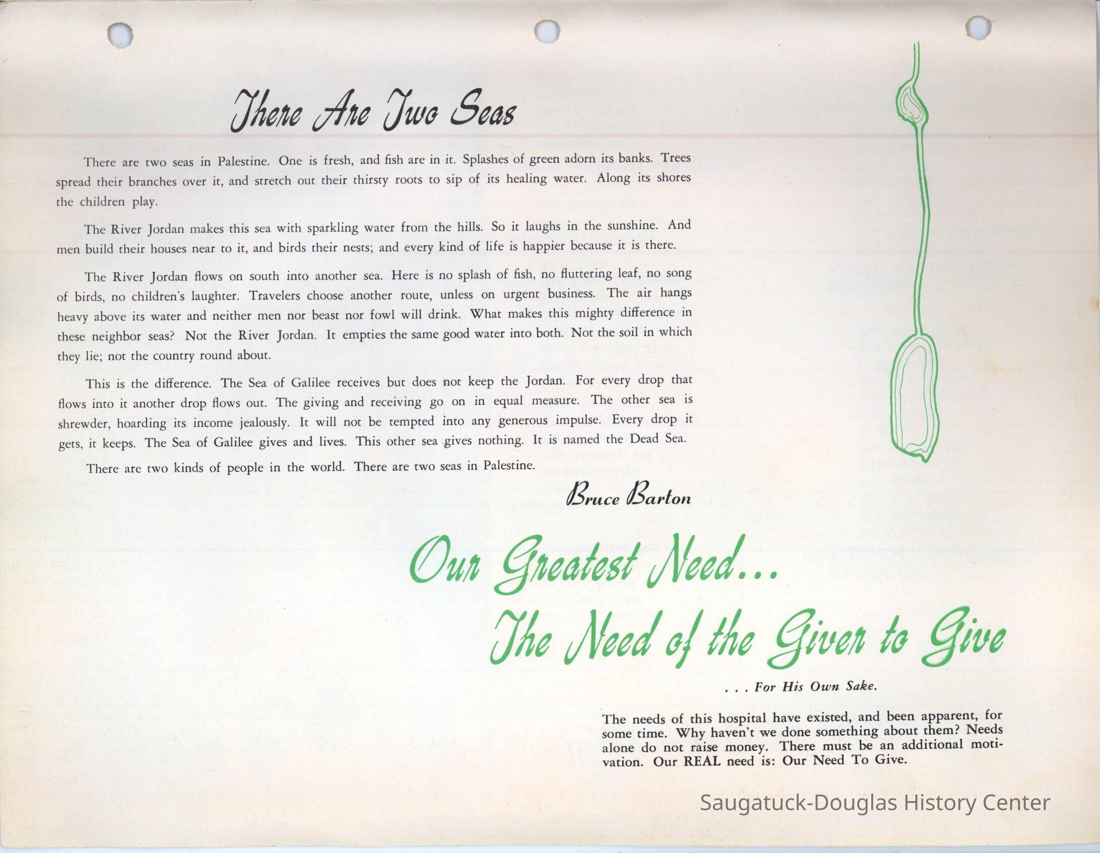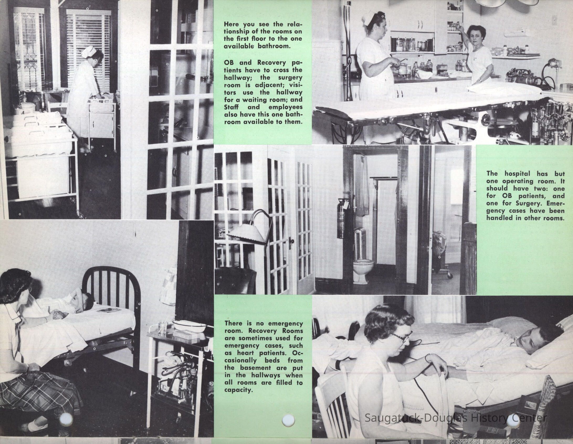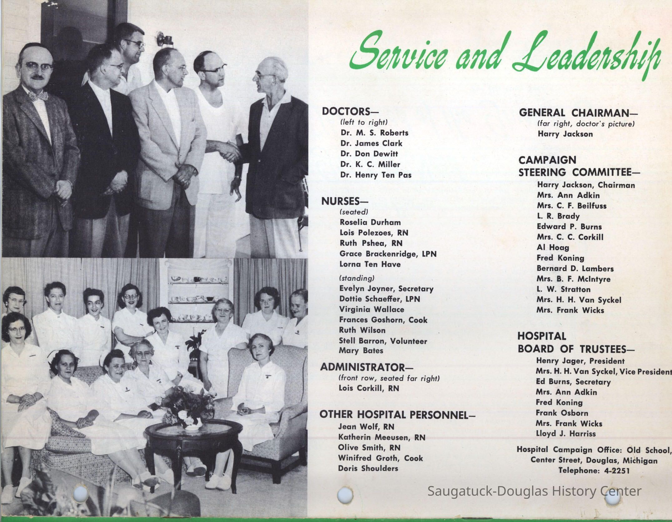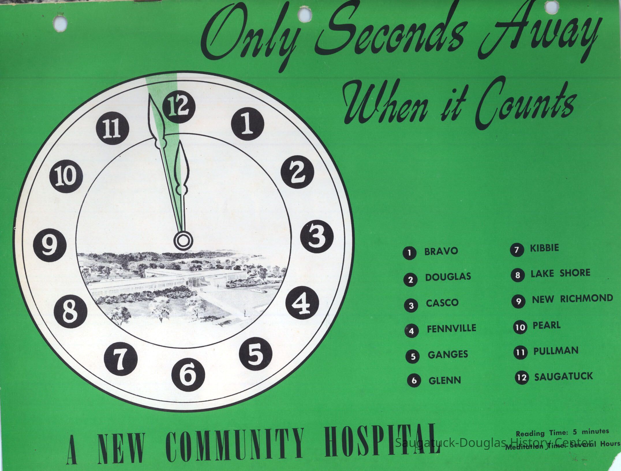 Letter and 6 page brochure promoting the proposed Community Hospital (Saugatuck/Douglas Michigan) Photos include the old hospital in the Kirby House and the problem of it being inadequate for the needs of the community. The last two pages show the floor plan and the $250,000 challenge