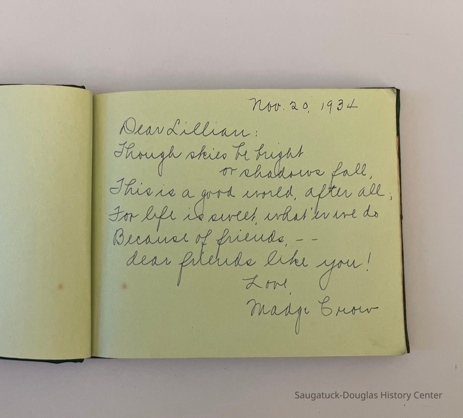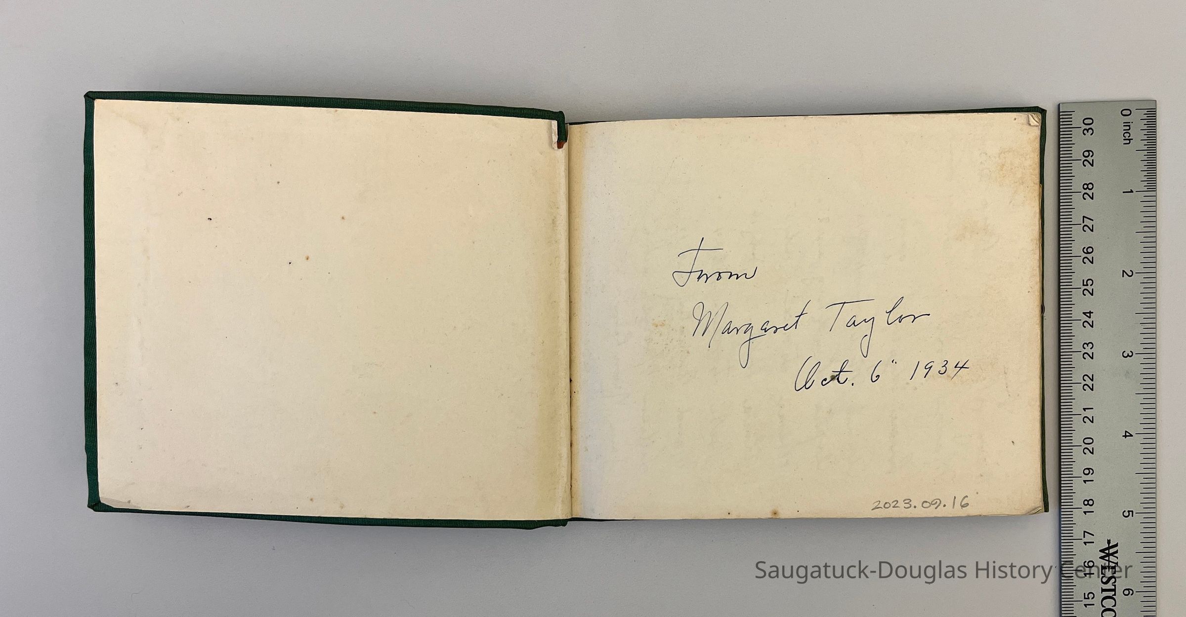 The book belonged to Lillian Morris. She used it to collect well wishes from her friends, gift tags, newspaper clippings and photos. The book was a gift from Margaret Taylor in 1934.