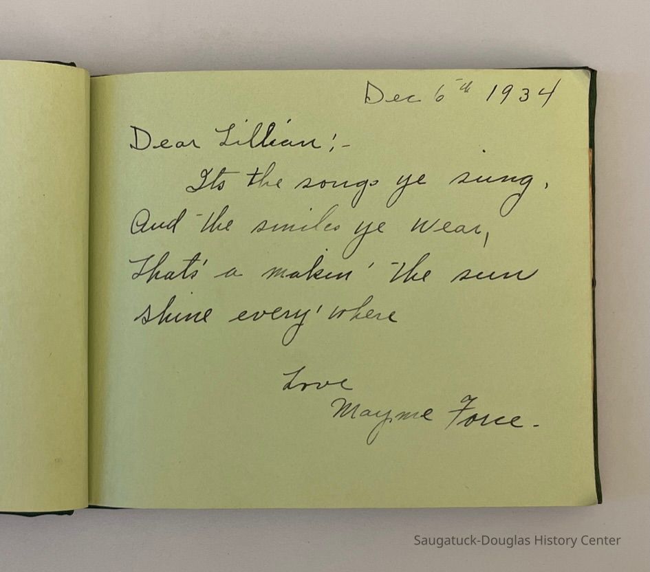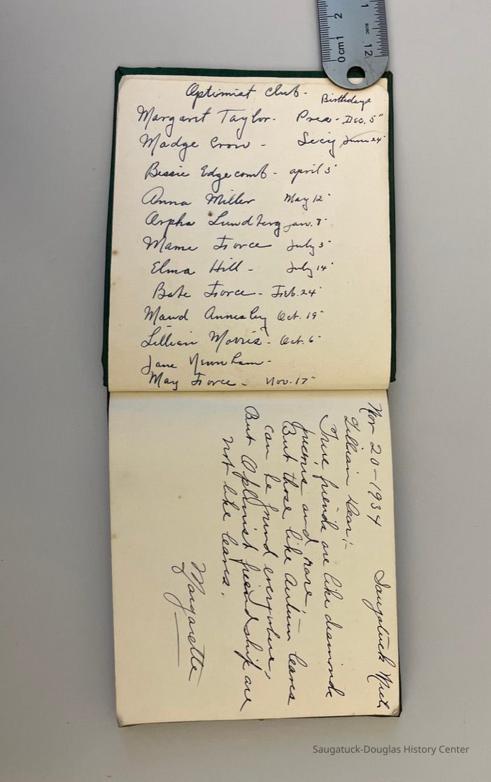A list of birthdays suggests the club had at least 12 members that included Margaret Taylor, Madge Crow, Bessie Edgcomb, Anna Miller, Orpha? Lundberg, Mame Morce, Elma Hill, Babe Force, Maud Annesley, Lillian Morris, Jane Newnham and May Force.Collection