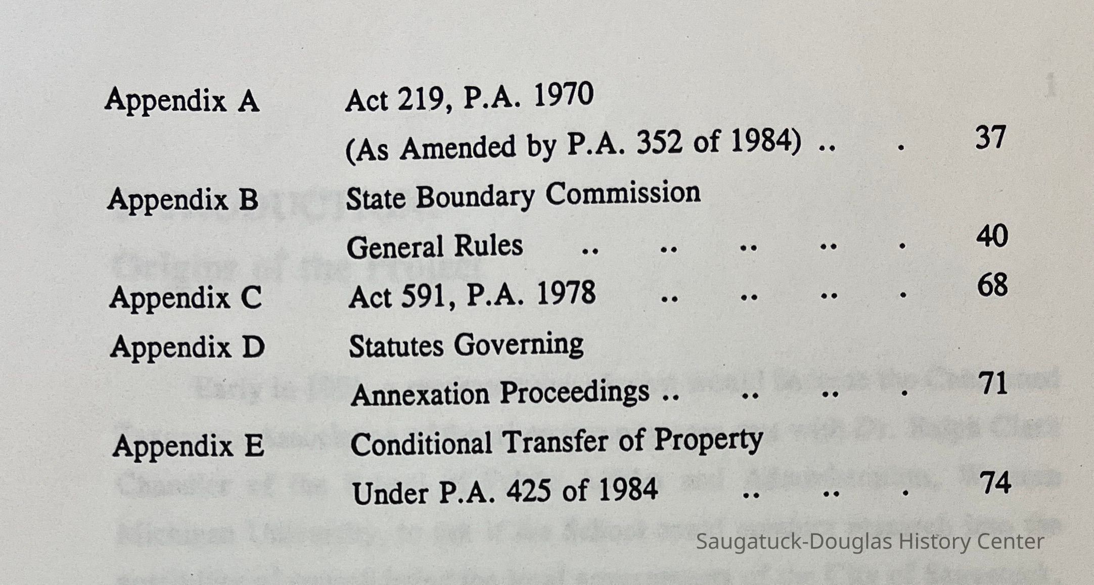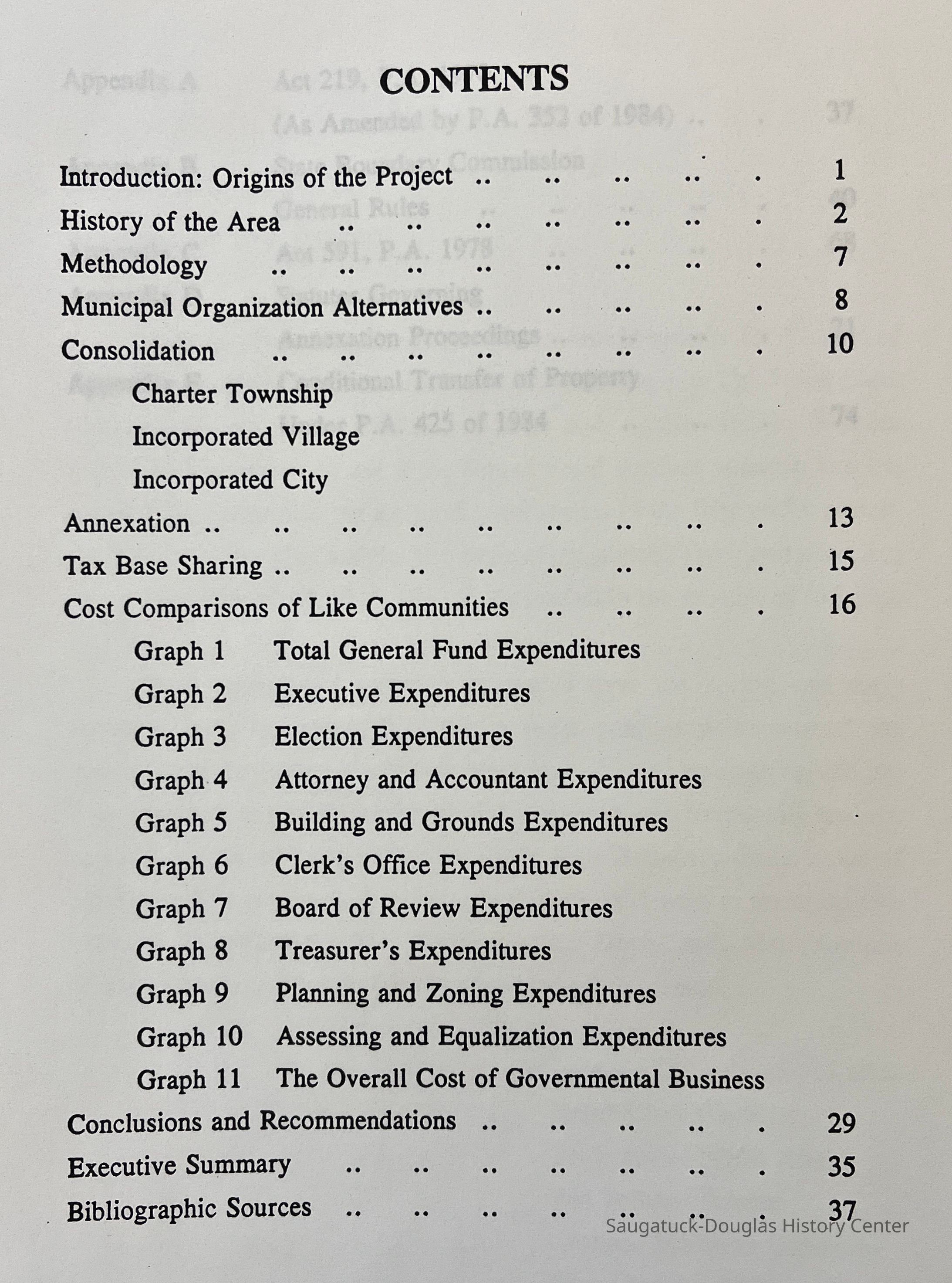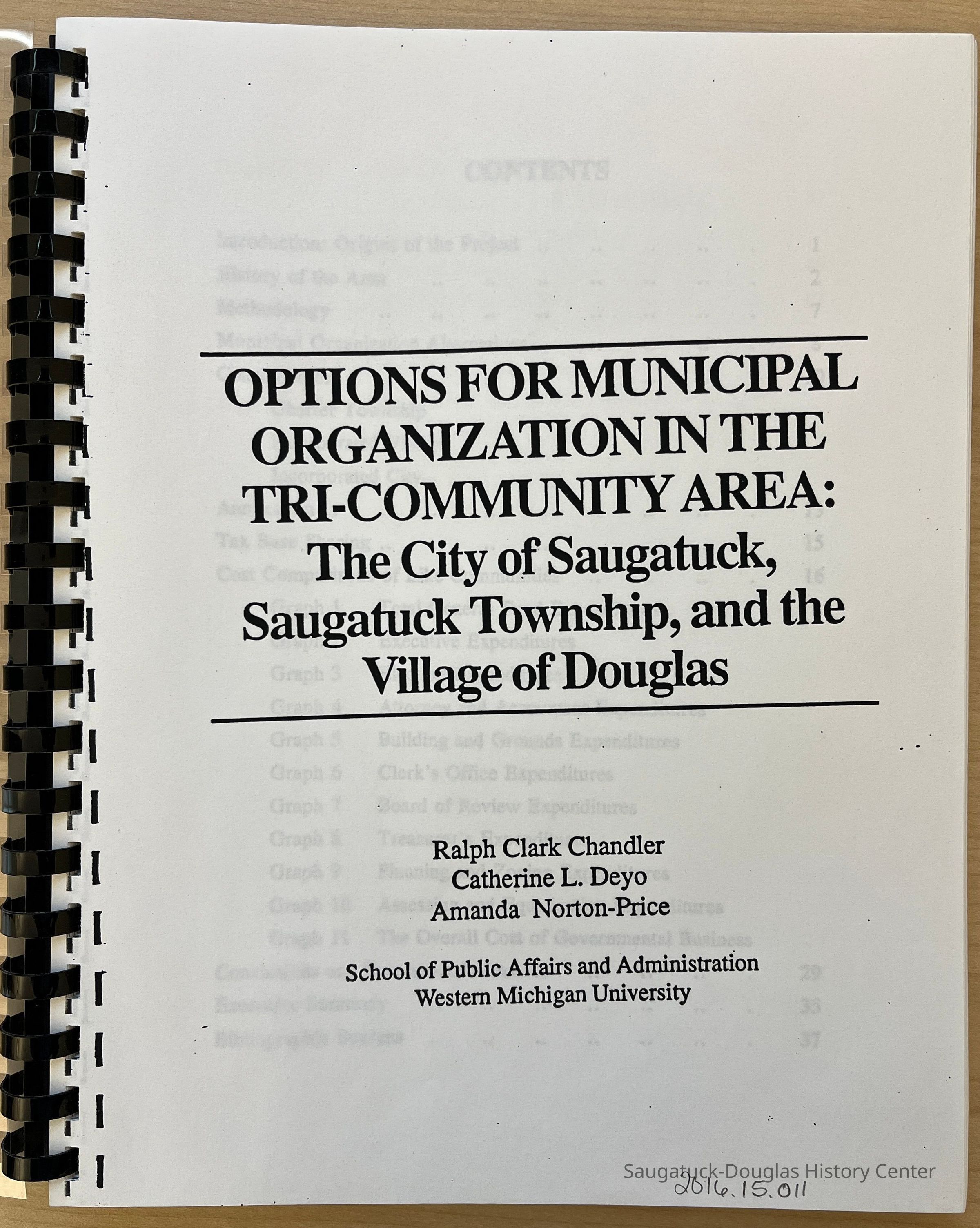 Study by the School of Public Affairs and Administration of Western Michigan University. Study for Consolidation for The City of Saugatuck, Saugatuck Township and the Village of Douglas. Study done by Professor Ralph Clark Chandler, Professor of Public Affairs and Political Science, Western Michigan University, Catherine L. Deyo, and Amanda Norton-Price.