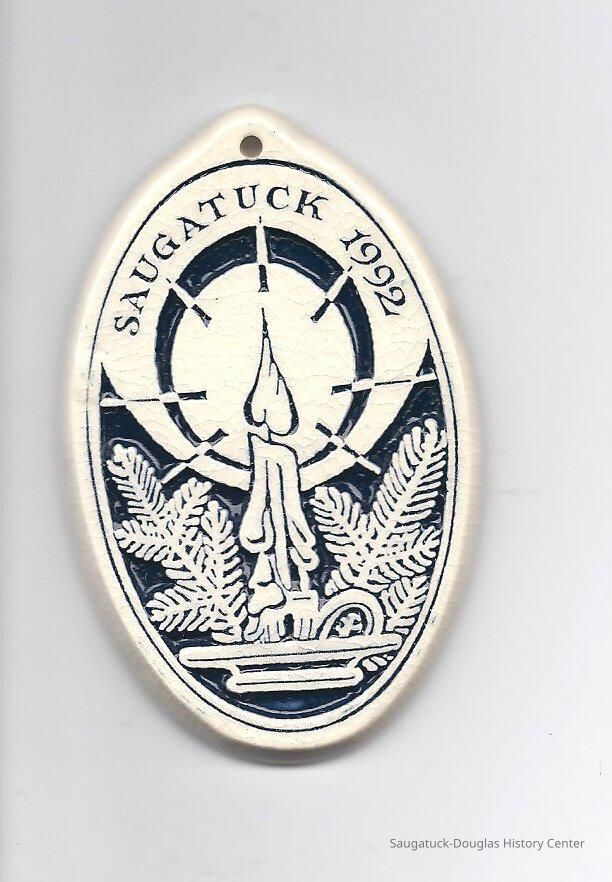Ceramic Saugatuck Holiday Ornament, image of a green candle on white background dated 1992.