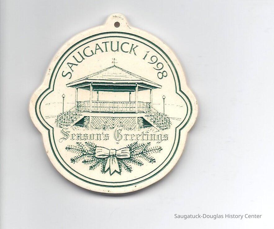 Round Ceramic Saugatuck Ornament, 1998, depicting Gazebo at Wickes Park, 2 1/2 " by 3"Context
