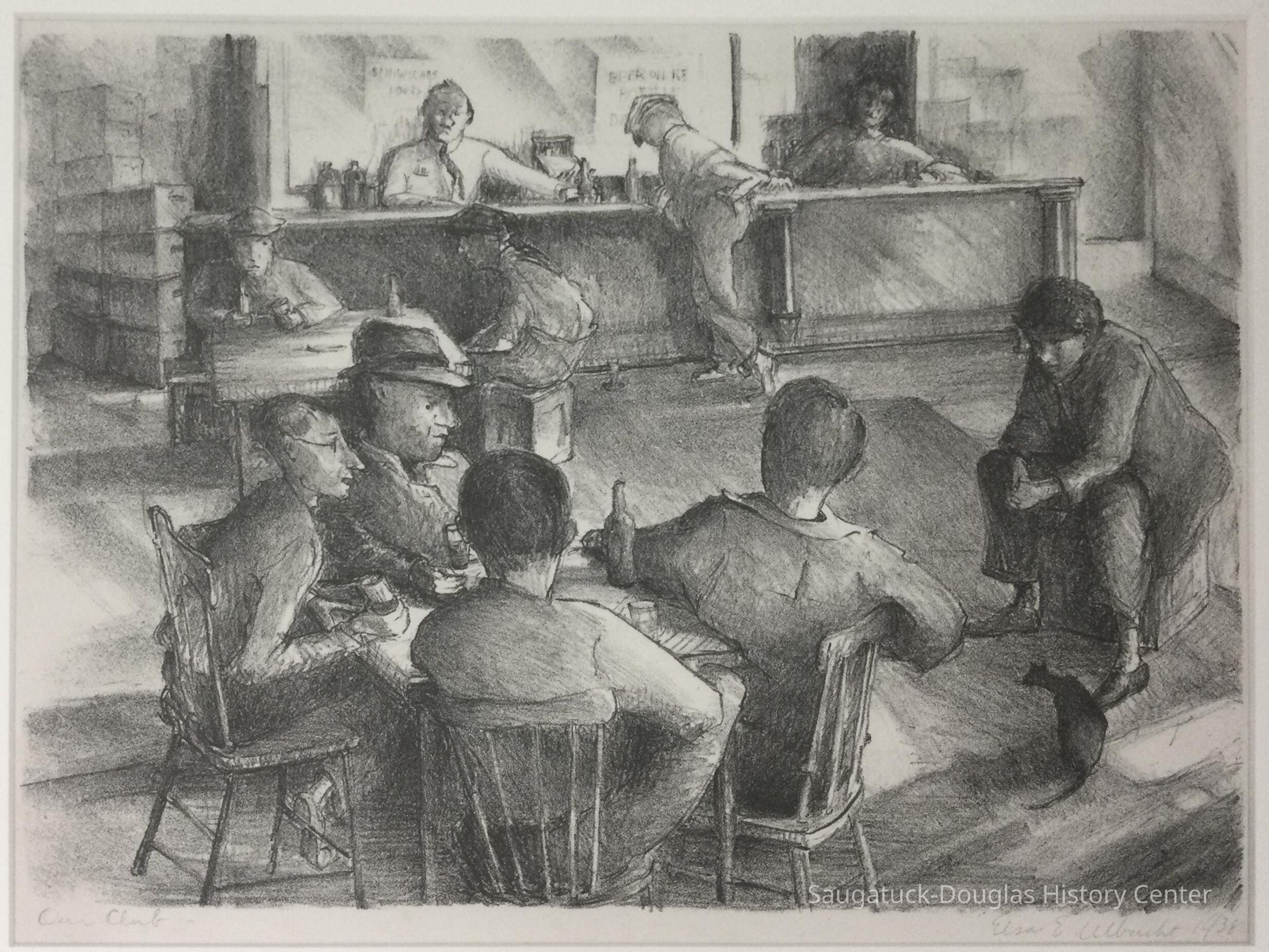 the art | While the bar is unidentified, it could well be a Saugatuck scene as this print was similar in size and presentation to a companion piece that depicted the interior of the Saugatuck Fruit Exchange.