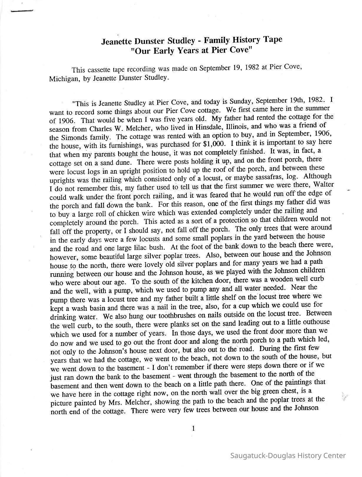 This is Jeanette Studley at Pier Cove, and today is Sunday, September 19th, 1982. I want to record some things about our Pier Cove cottage.