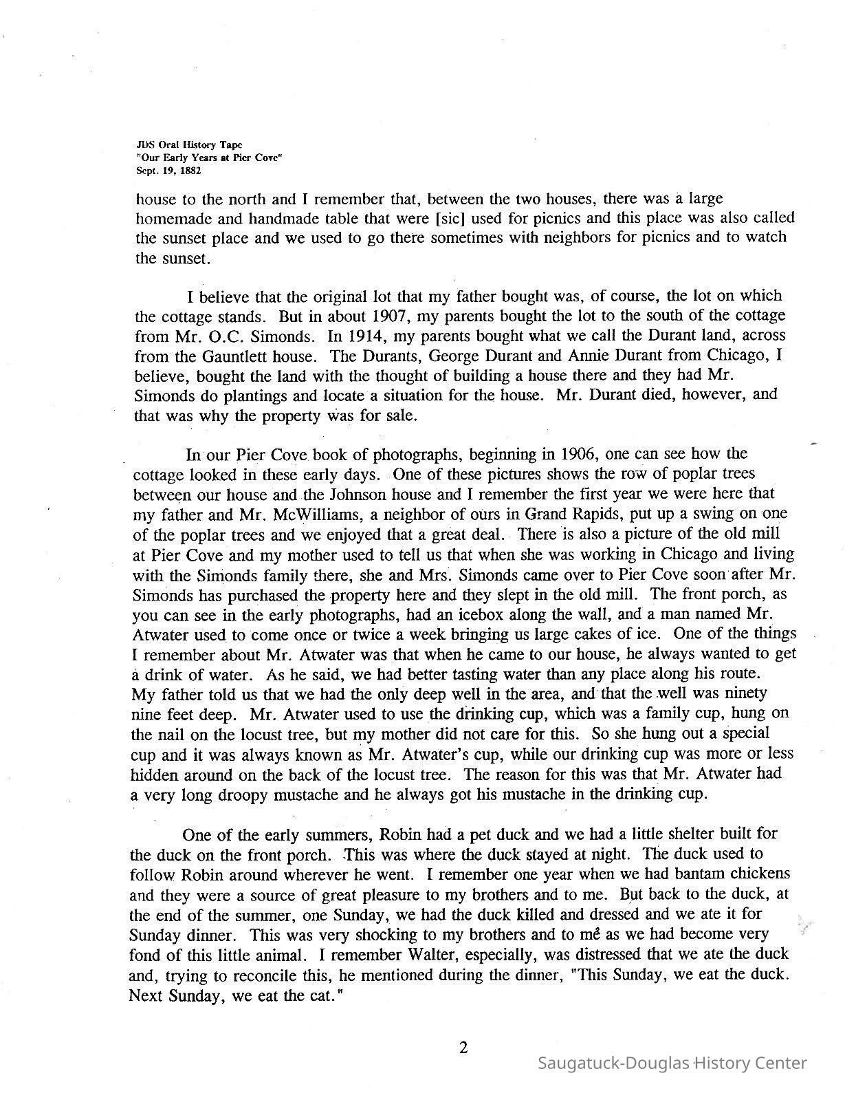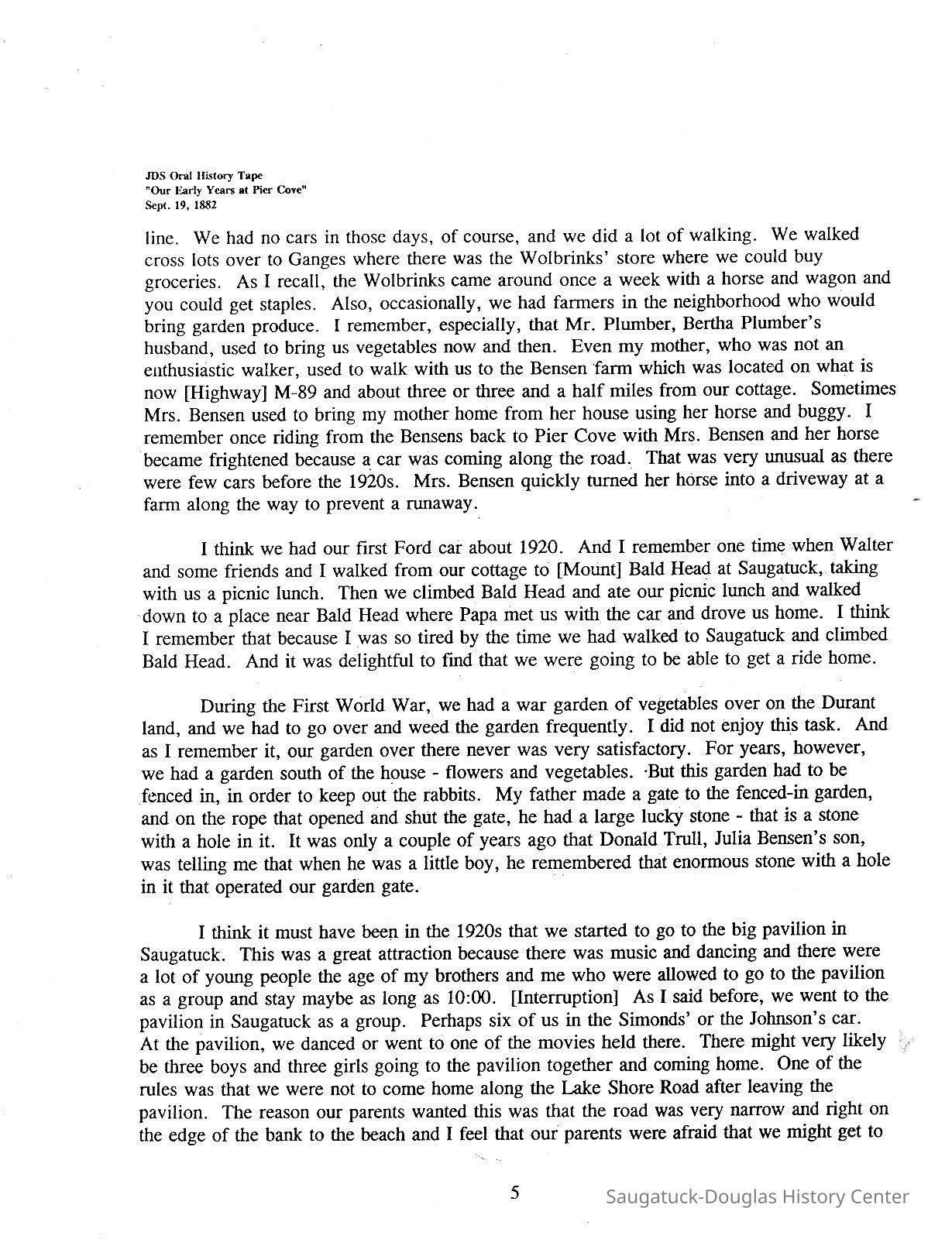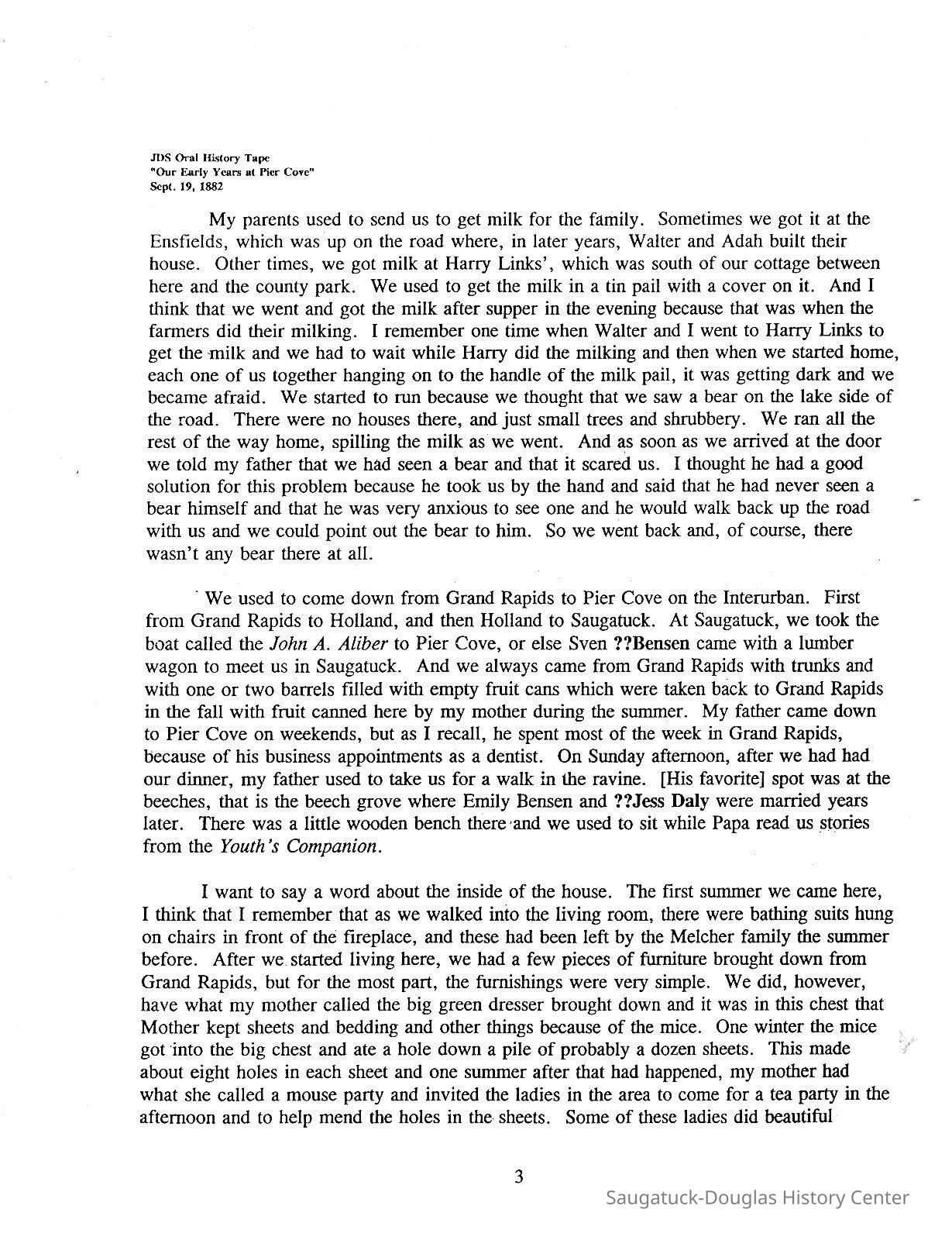 We used to come down from Grand Rapids to Pier Cove on the Interurban first from Grand Rapids to Holland and then Holland to Saugatuck. At Saugatuck we took the boat called the John A. Aliber to Pier Cove or else Sven Bensen came with a lumber wagon to meet us in Saugatuck. We always came from Grand Rapids with trunks and with one or two barrels filled with empty fruit cans which were taken back to Grand Rapids in the fall with fruit canned here by my mother during the summer.