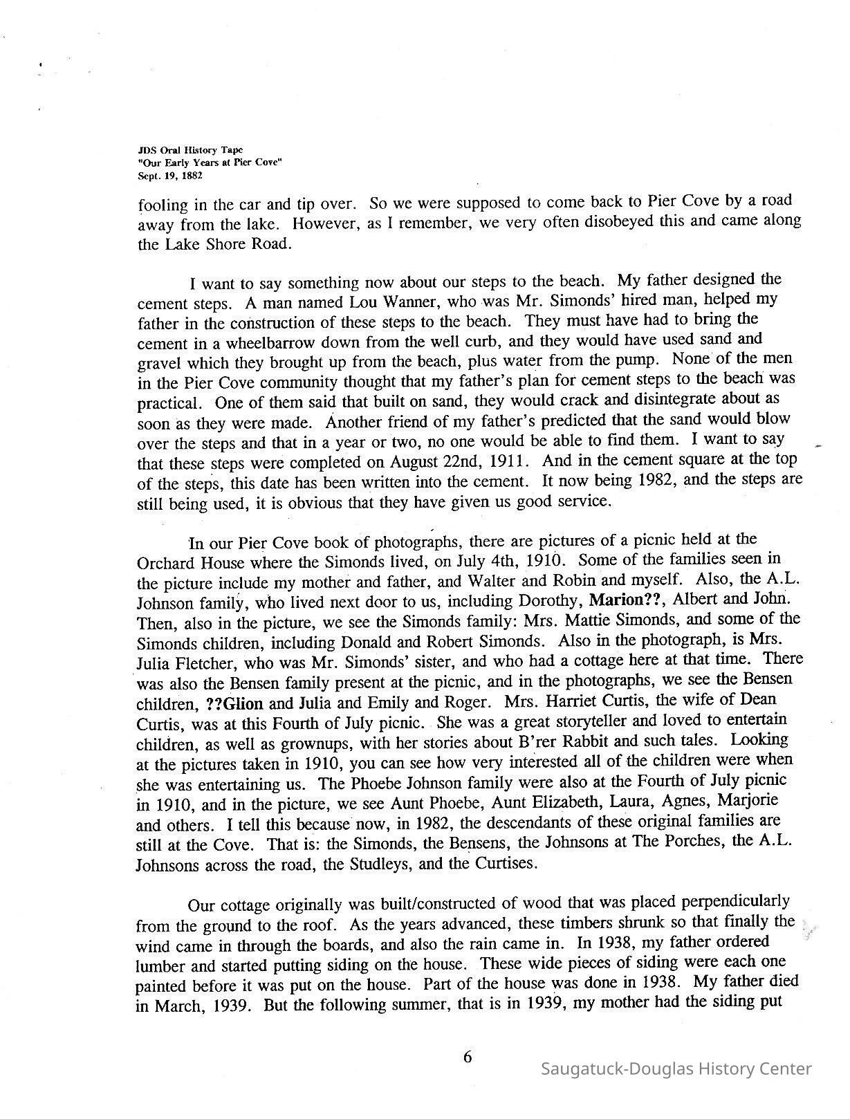 In our Pier Cove Book of photographs there are pictures of a picnic held at the Orchard House where the Simonds lived, on July 4th, 1910. Some of the families seen in the picture include my mother and father and Walter and Robin and myself. Also the A. L. Johnson family, who lived next door to us including: Dorothy, Marion, Albert and John. Also in the picture we see the Simonds family: Mrs. Mattie Simonds, and some of the Simonds children including Donald and Robert Simonds. Also in the photograph is Mrs. Julie Fletcher who was Mr. Simonds' sister and who had a cottage here at that time. There was also the Bensen family present at the picnic. And in the photographs we see the Bensen children: Glion, Julia, Emily and Roger. Mrs. Harriet Curtis the wife of Dean Curtis was at this Fourth of July picnic. She was a great storyteller and loved to entertain children as well as grownups with the stories about B'rer Rabbit and such tales. Looking at the pictures taken in 1910 you can see how very interested all of the children were when she was entertaining us. The Phoebe Johnson family was also at the Fourth of July picnic in 1910 and in the picture we see: Aunt Phoebe, Aunt Elizabeth, Laura, Agues, Marjorie and others. I tell this because now in 982 the descendants of these original families are all still at the Cove. That is: the Simonds, the Bensens, the Johnsons at The Porches, the A. L. Johnsons across the road, the Studleys and the Curtises.